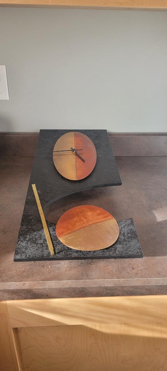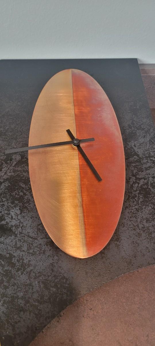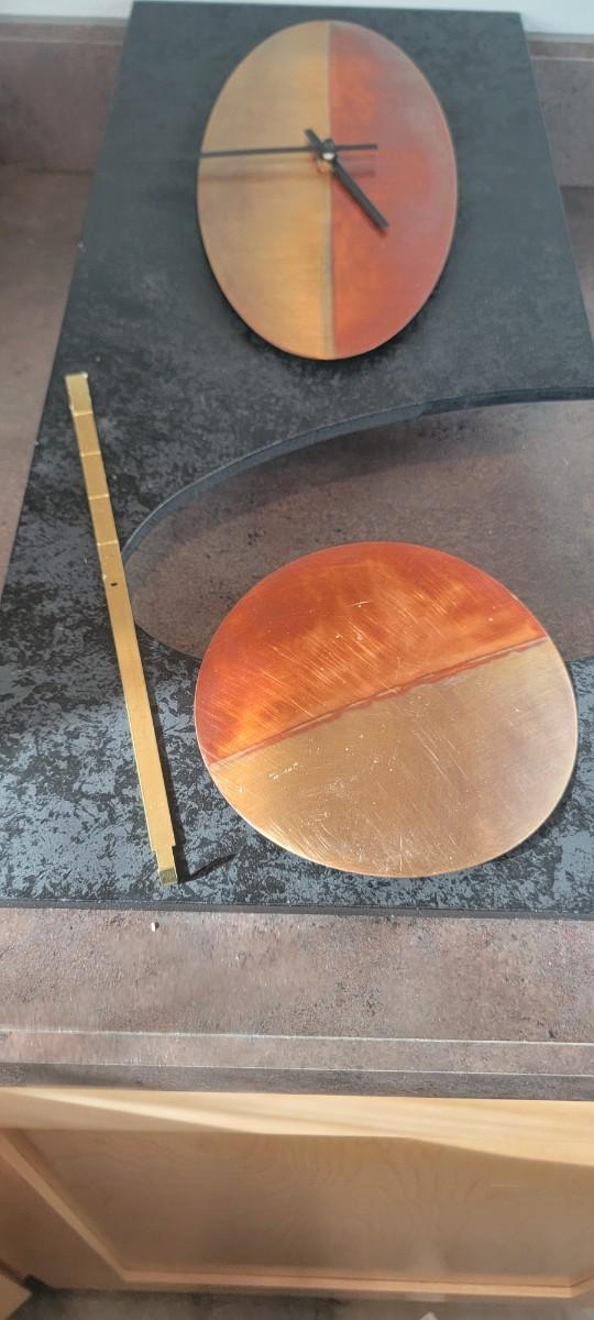 Copper, brass wall clock, signed dated 2013 BJ240. Pendulum needs attaching