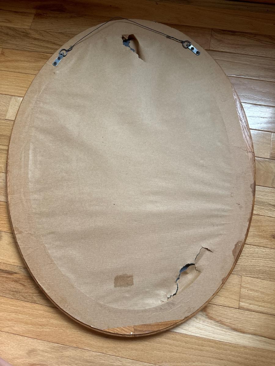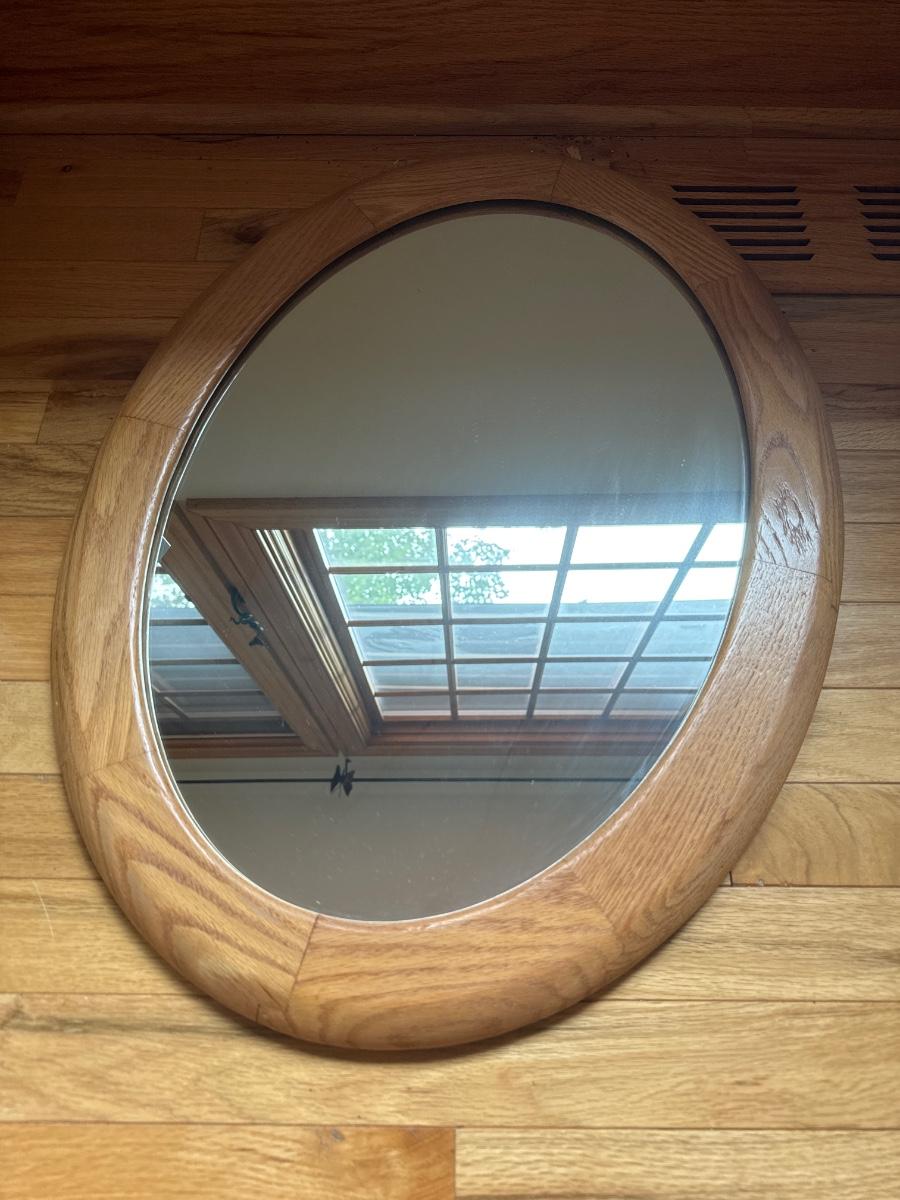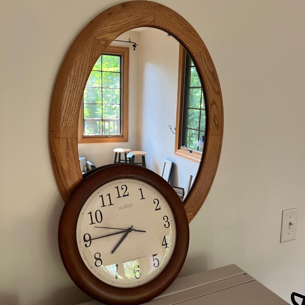 A LaCrosse brand wooden framed round atomic wall clock measures approximately 12”D. Clock runs on a single AA battery (not included) and functioned when tested. It is radio controlled and sets the time itself! The wood oval framed mirror measures 19“ x 24“.