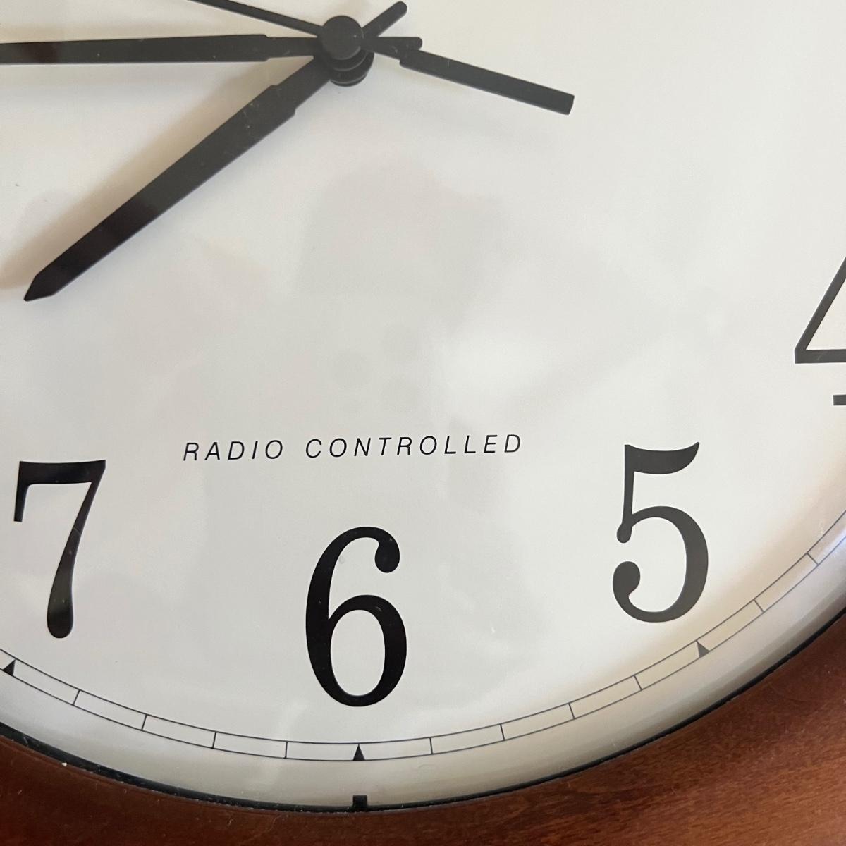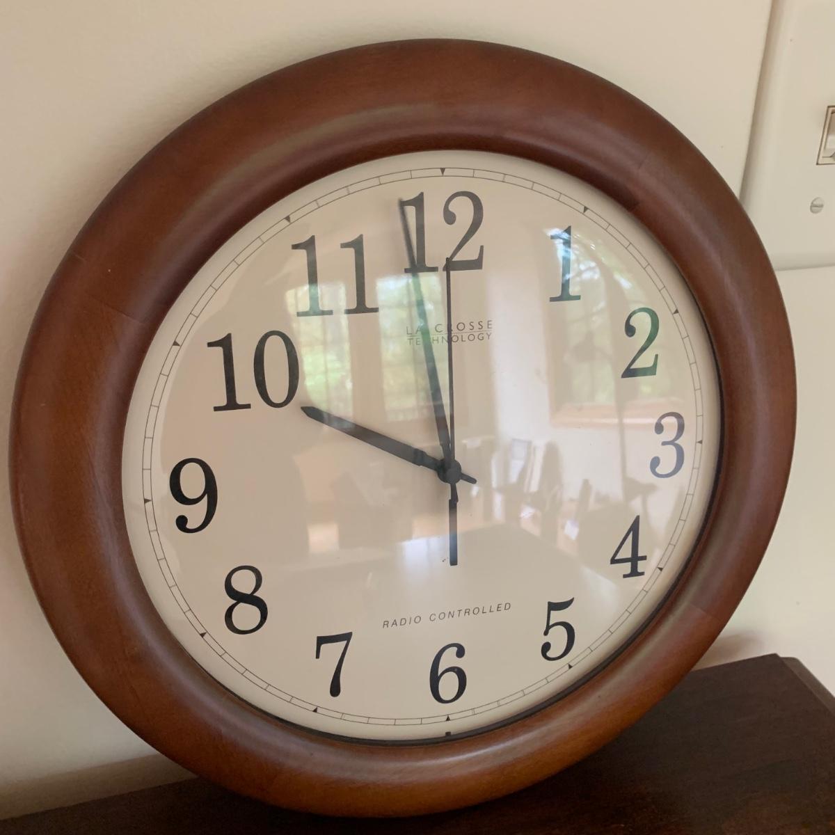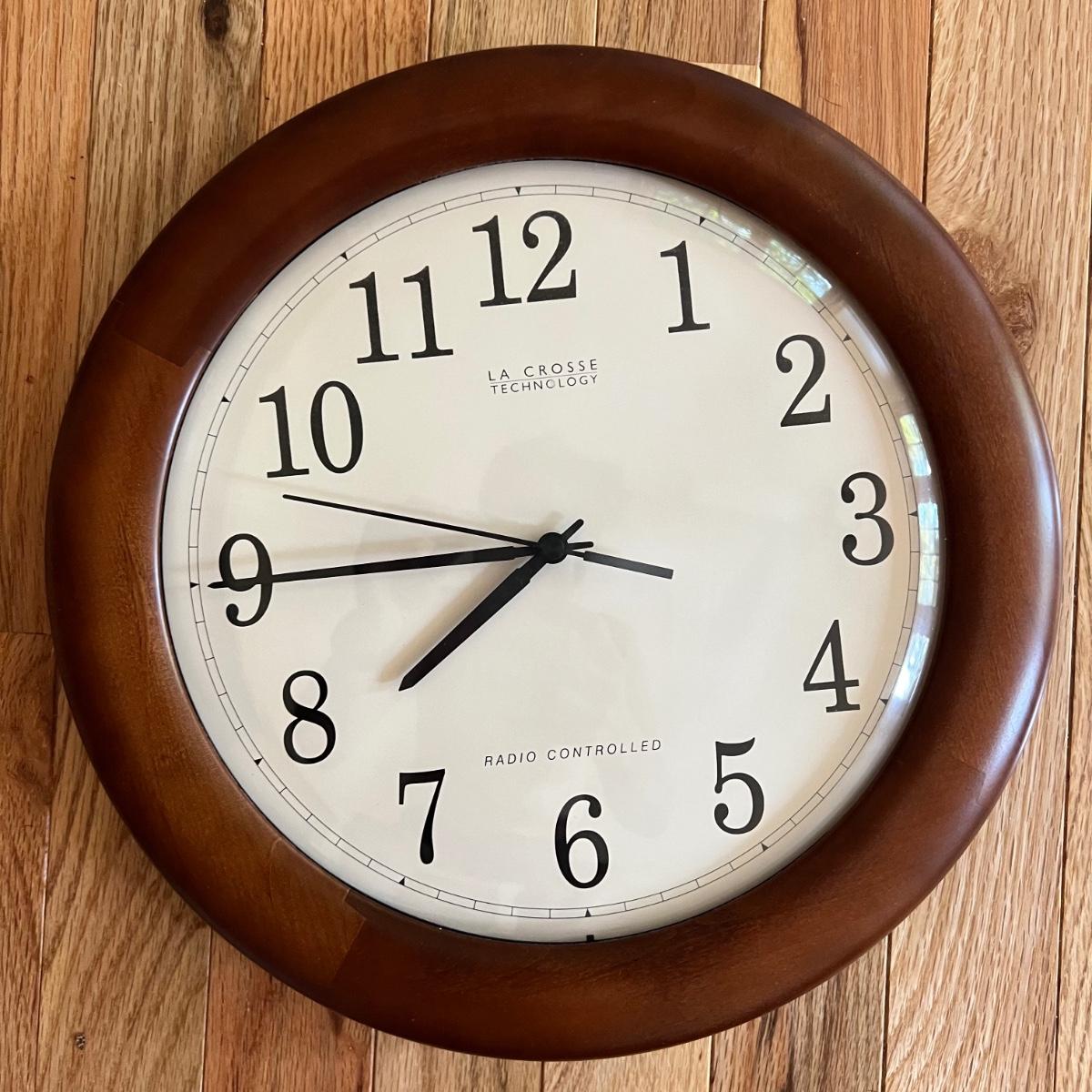 A LaCrosse brand wooden framed round atomic wall clock measures approximately 12”D. Clock runs on a single AA battery (not included) and functioned when tested. It is radio controlled and sets the time itself! The wood oval framed mirror measures 19“ x 24“.