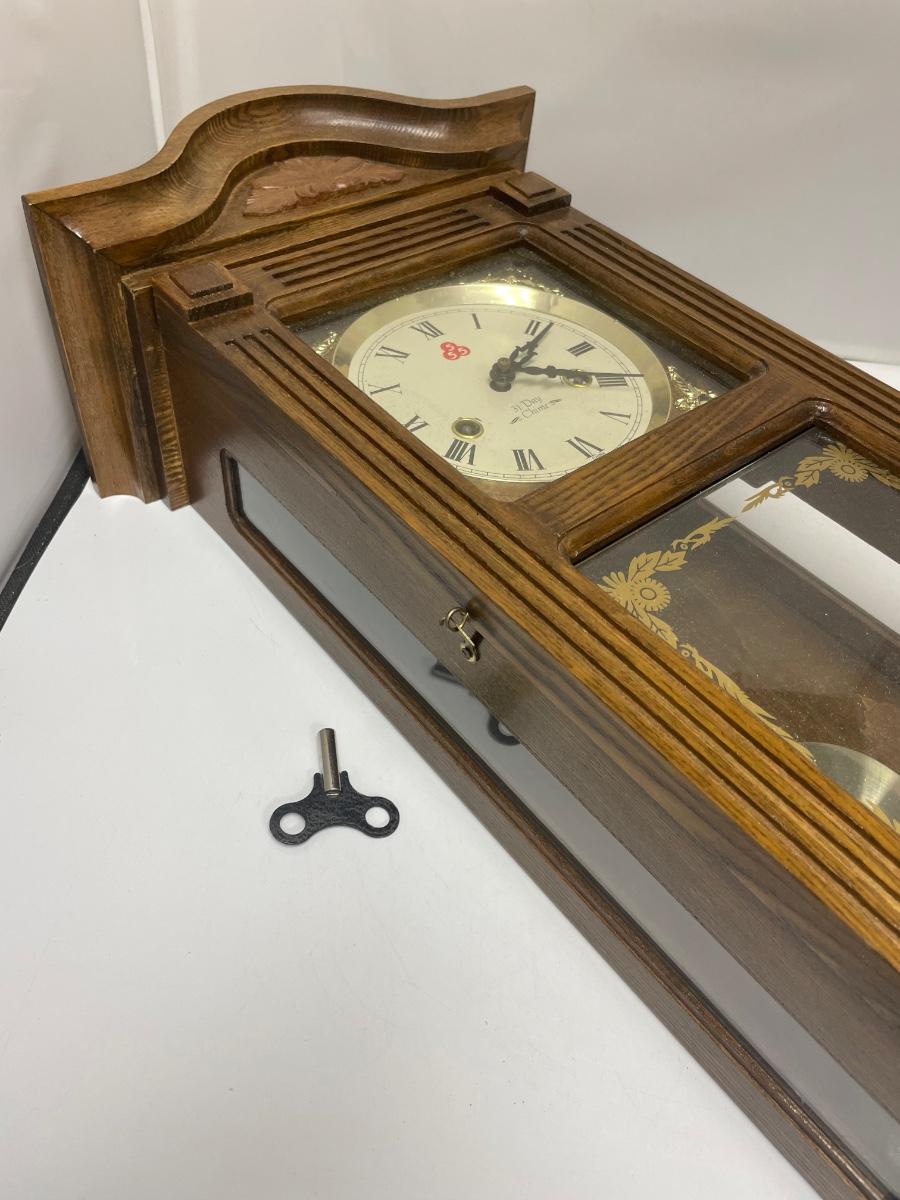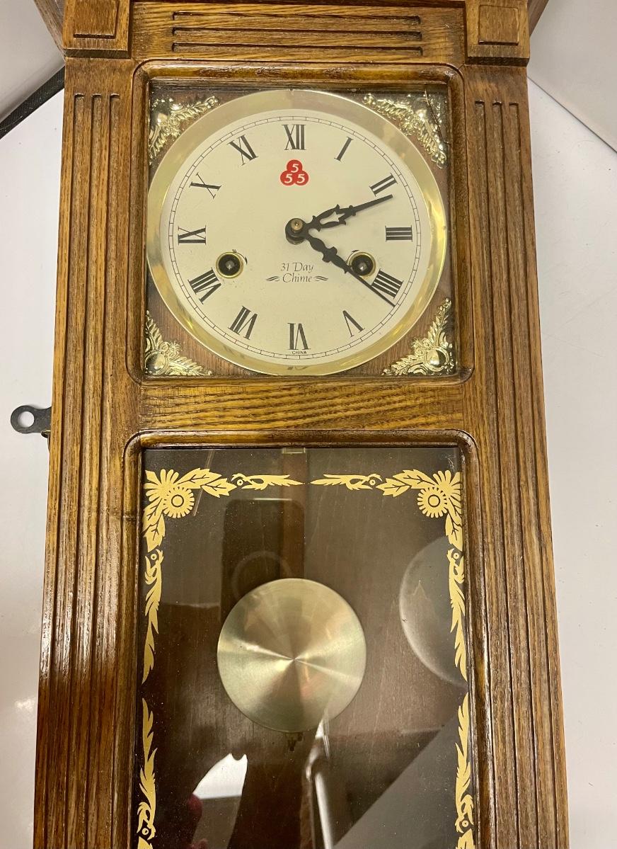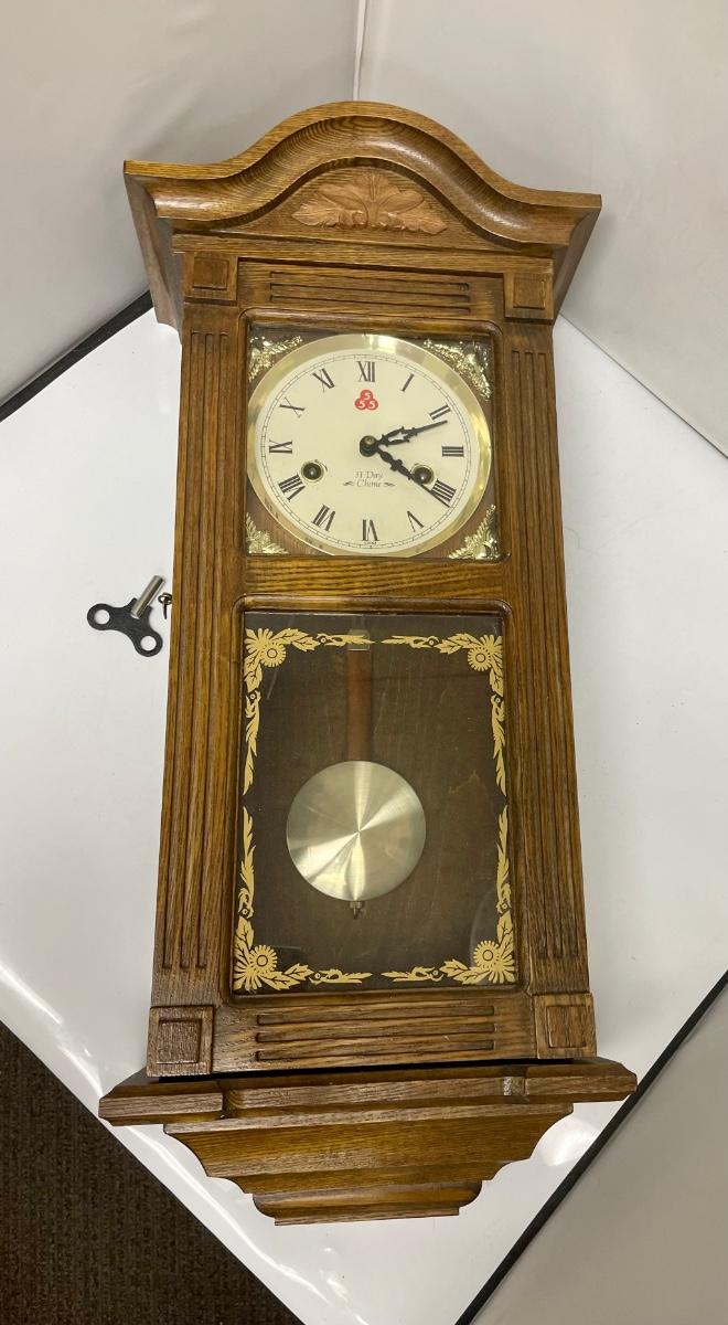 Wall Clock with Pendulum. Includes clock key. Approx. 24" tall.