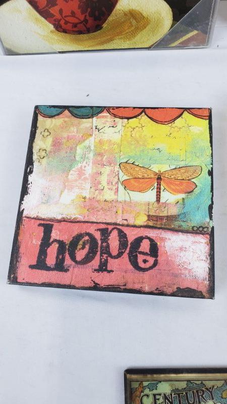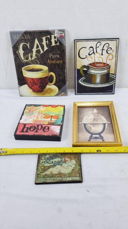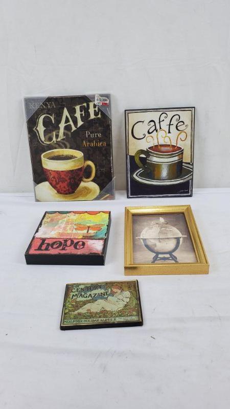 Wall Decor, 5 Pieces: 2 Cafe Pictures/1 Hope Picture/1 Baby Sleeping on World/1 Century Magazine Plaque