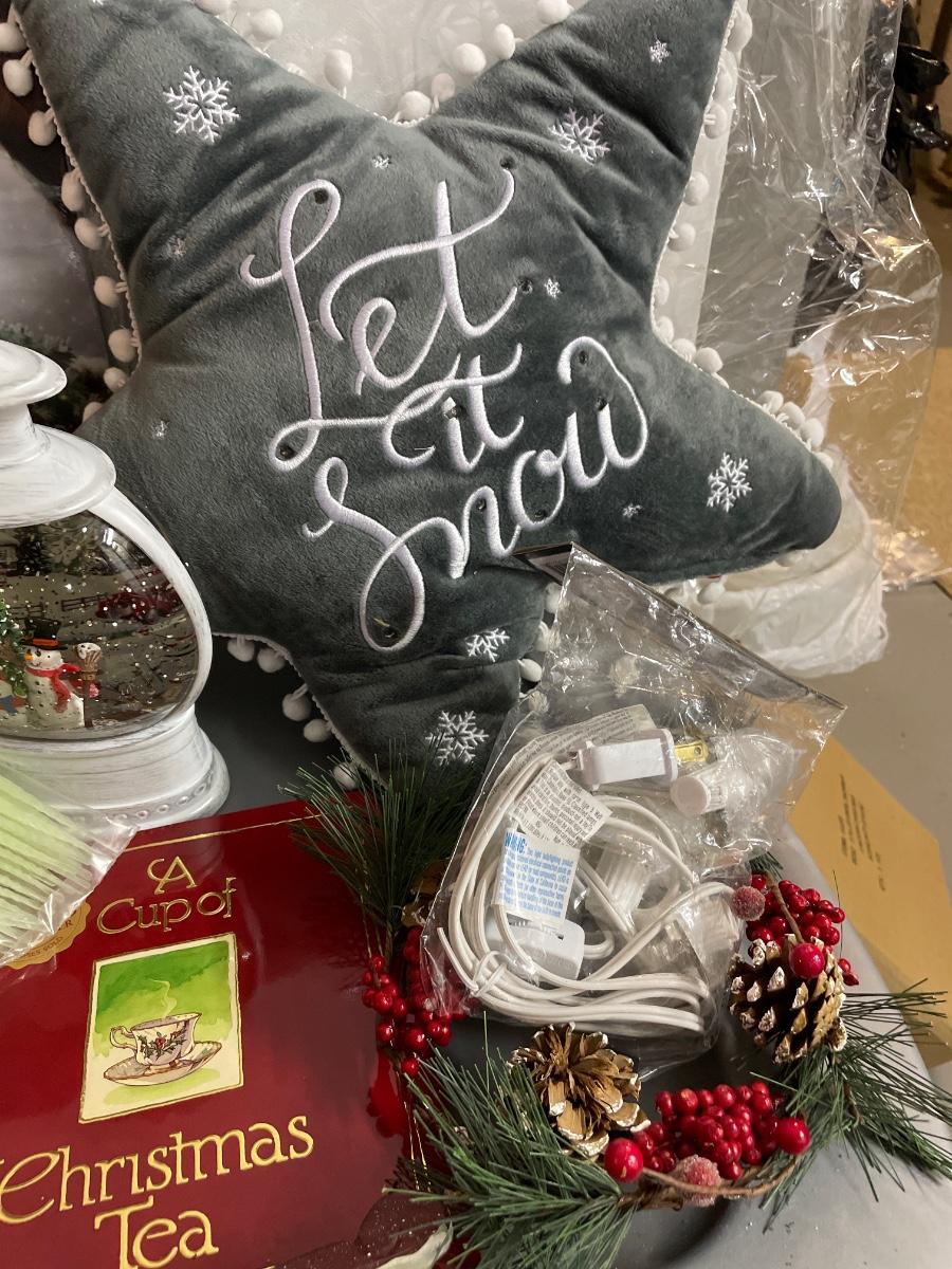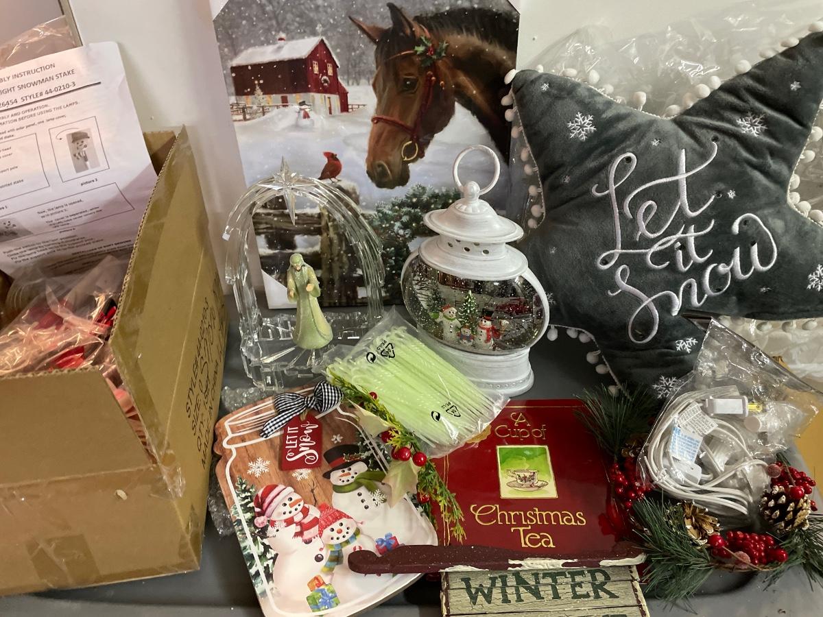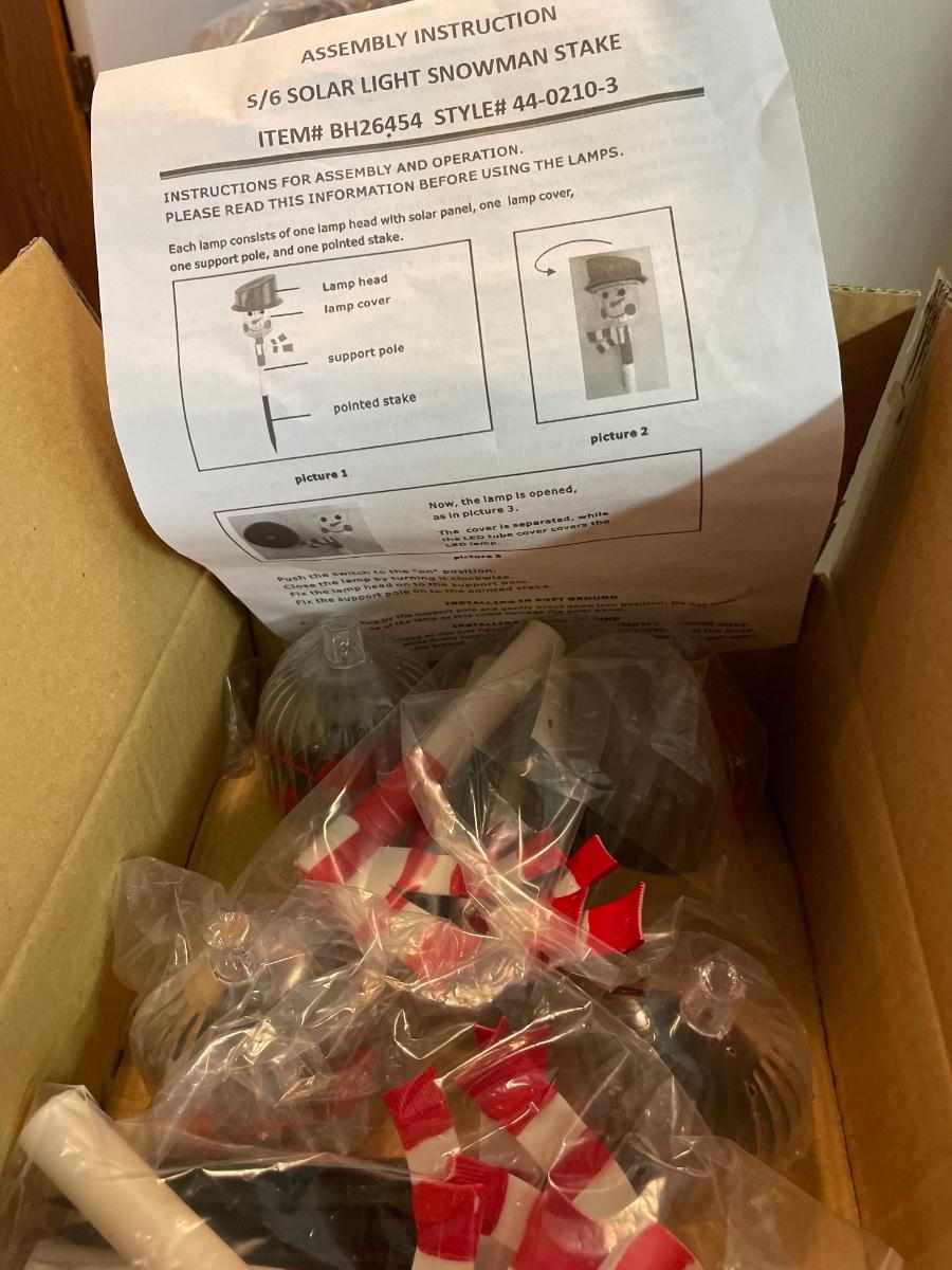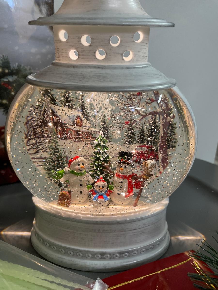 Wall decor, lighted snow globe, solar snowman stakes