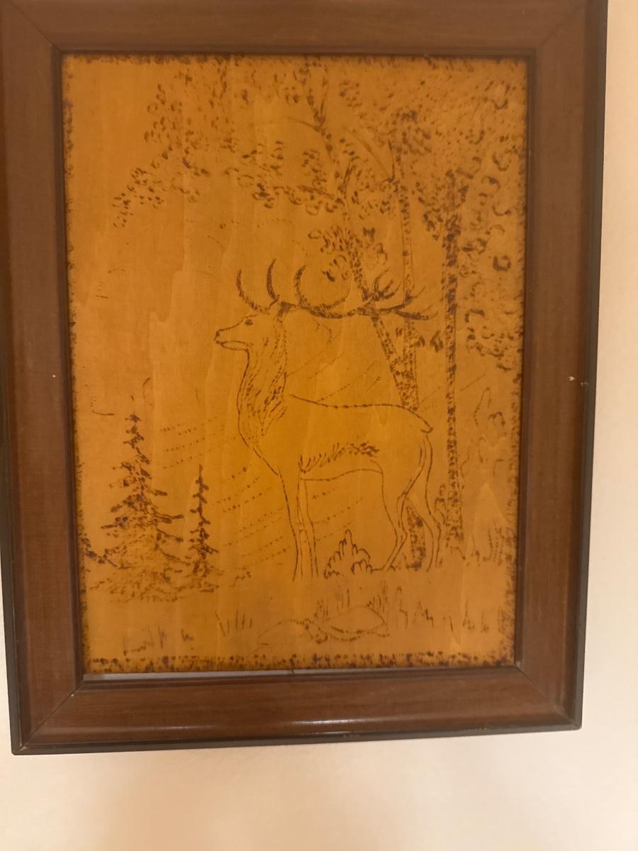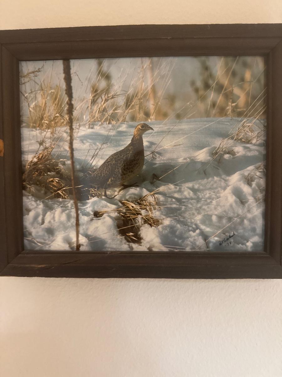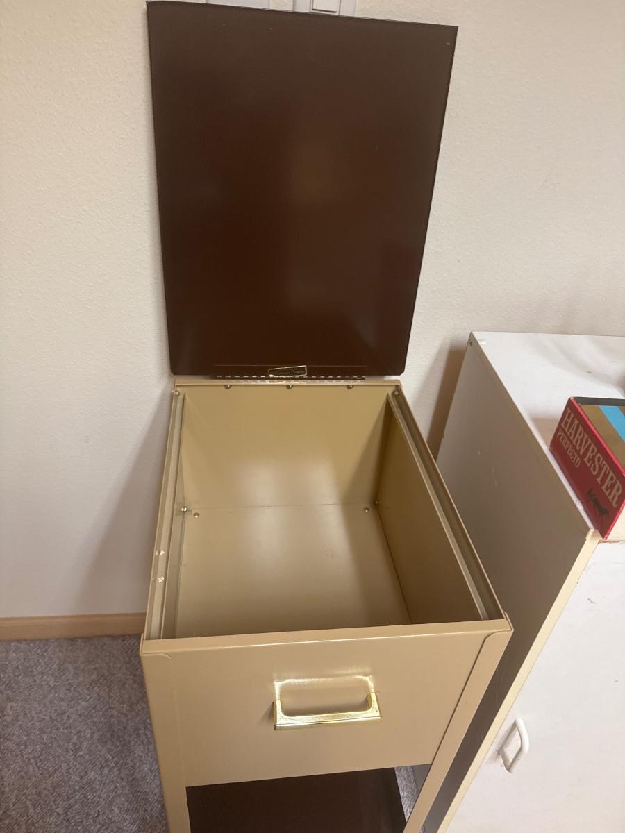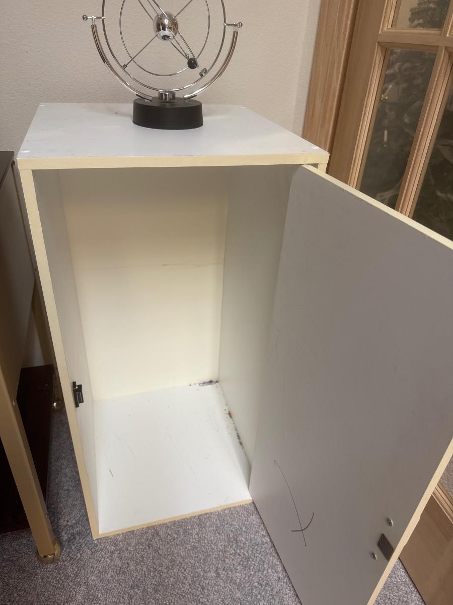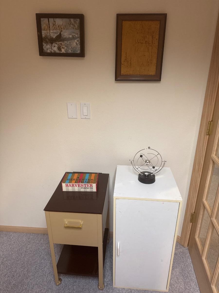 Includes cigar box, perpetual motion device , metal rolling cabinet, white colored wood cabinet and 2 wall decor frames with wildlife in them.