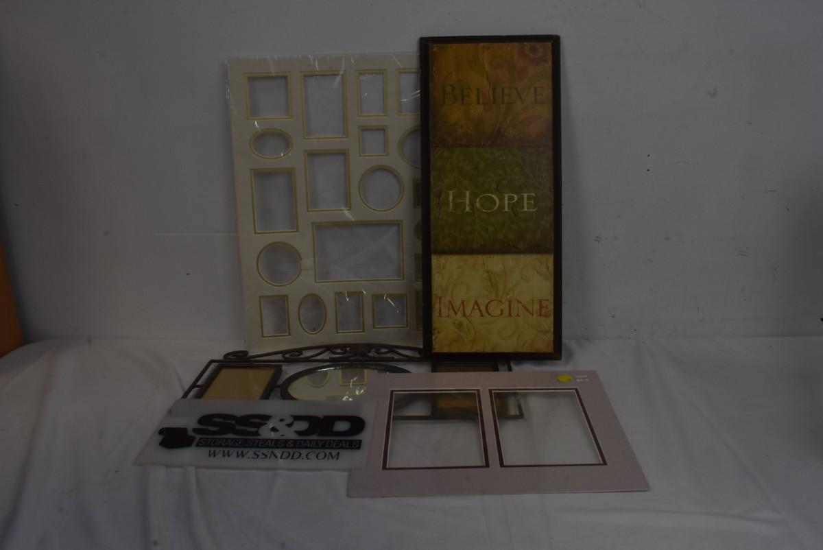 Wall decor: 2 NEW picture frame mats, Believe Hope Imagine wood hanging, metal with oval mirror & 2 picture frames