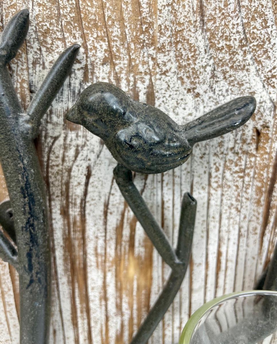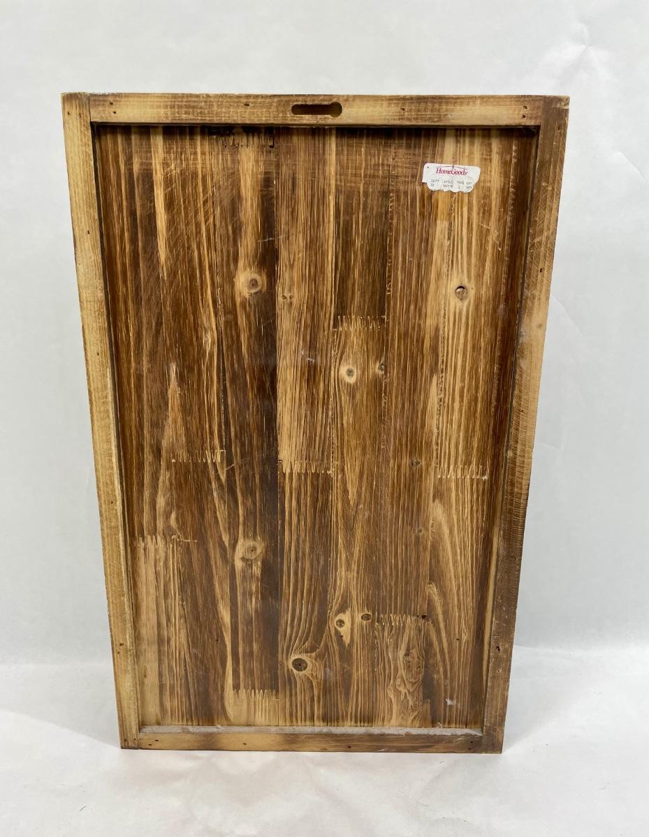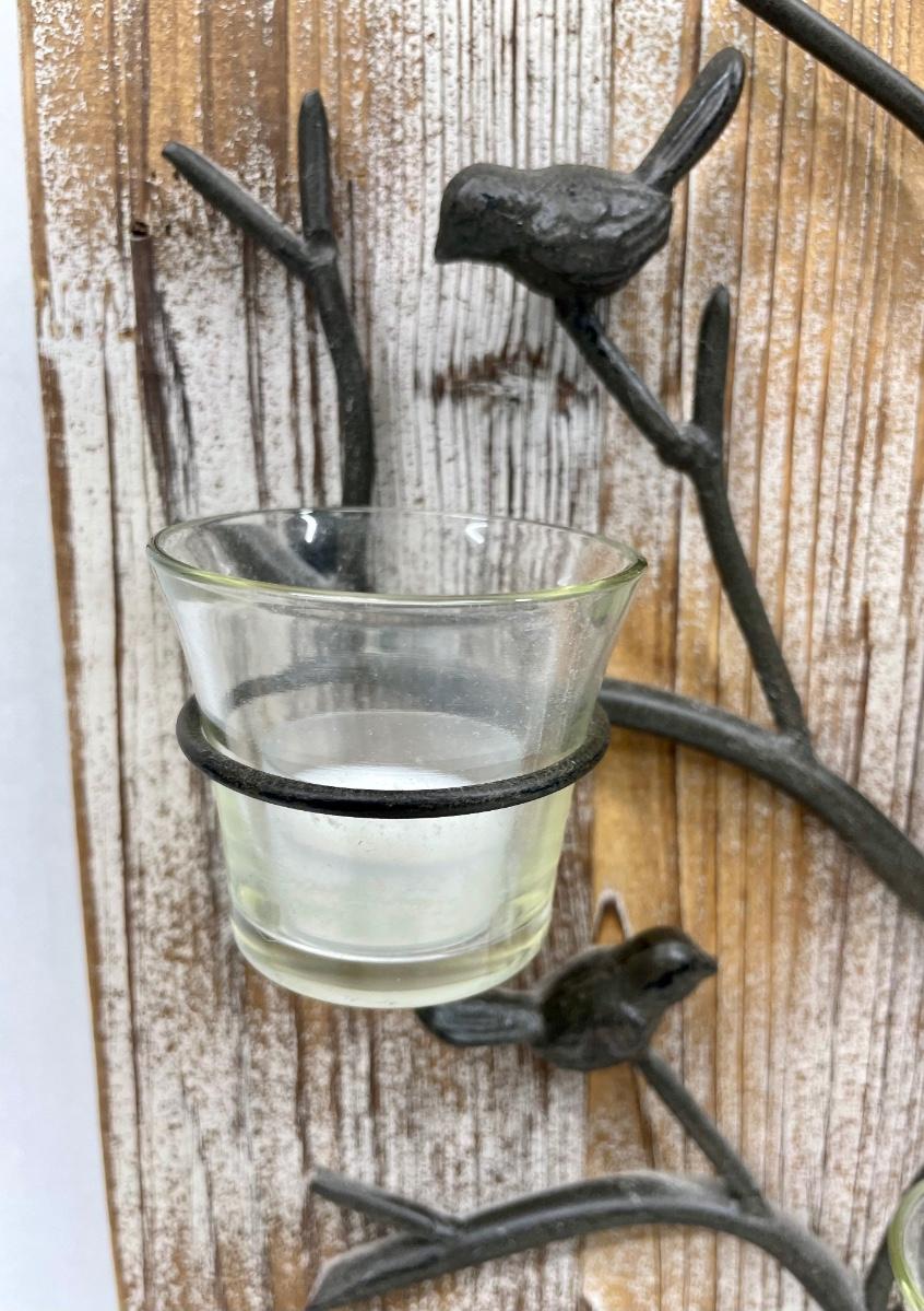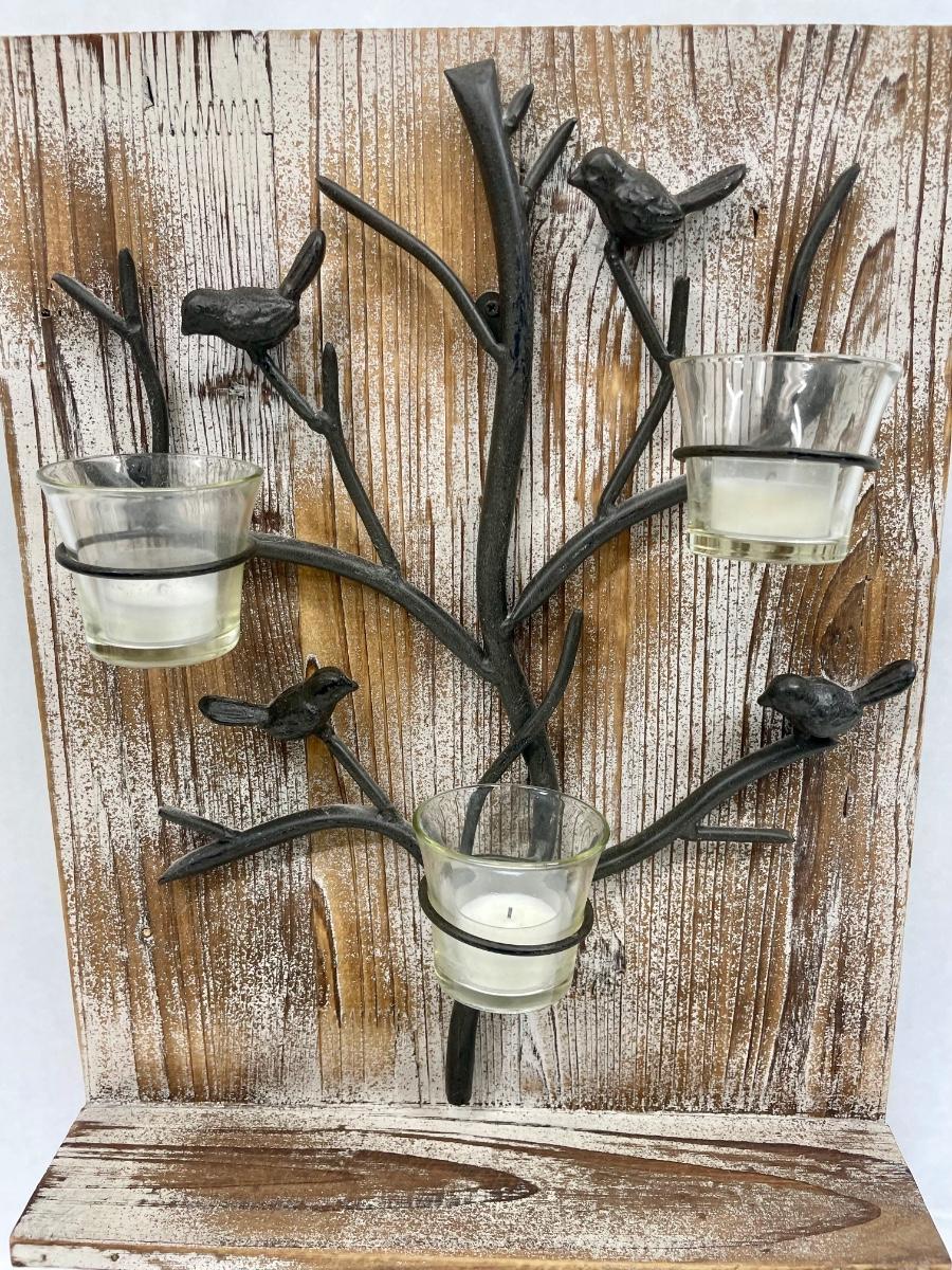 Approx. 13”x 22”. Wood display board hold a metal tree sculpture with birds and slots for 3 glass votive candle holders. Good condition.