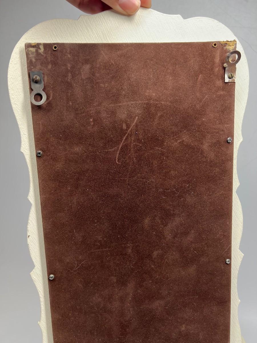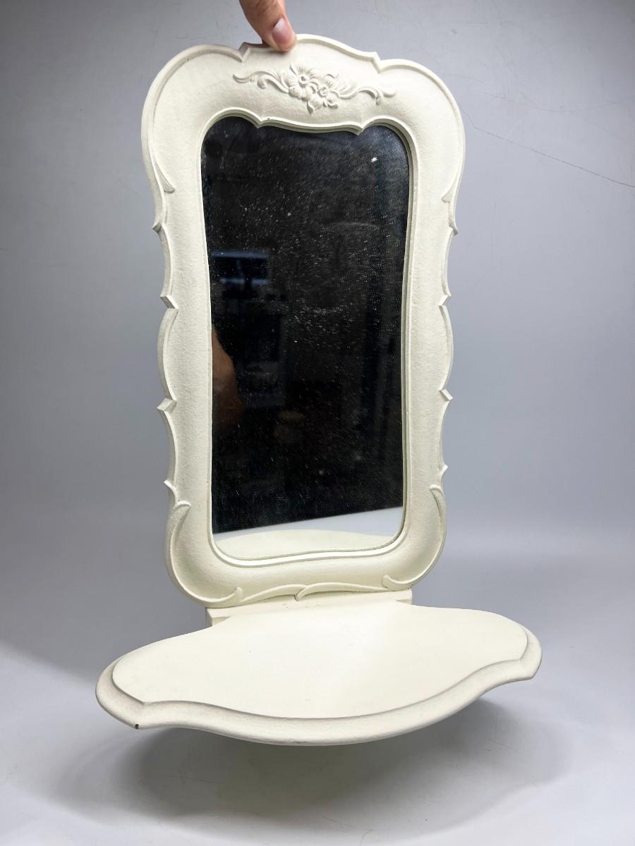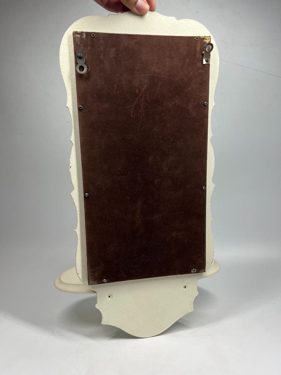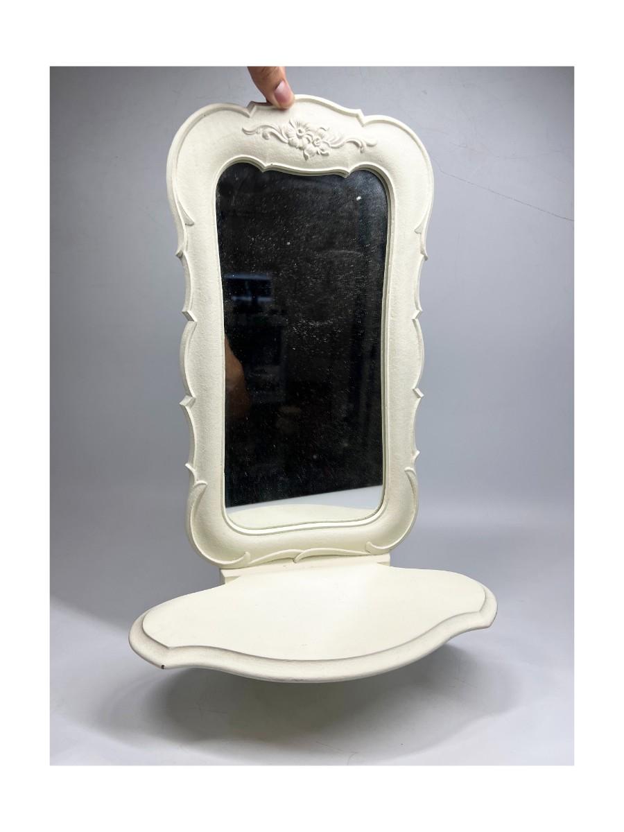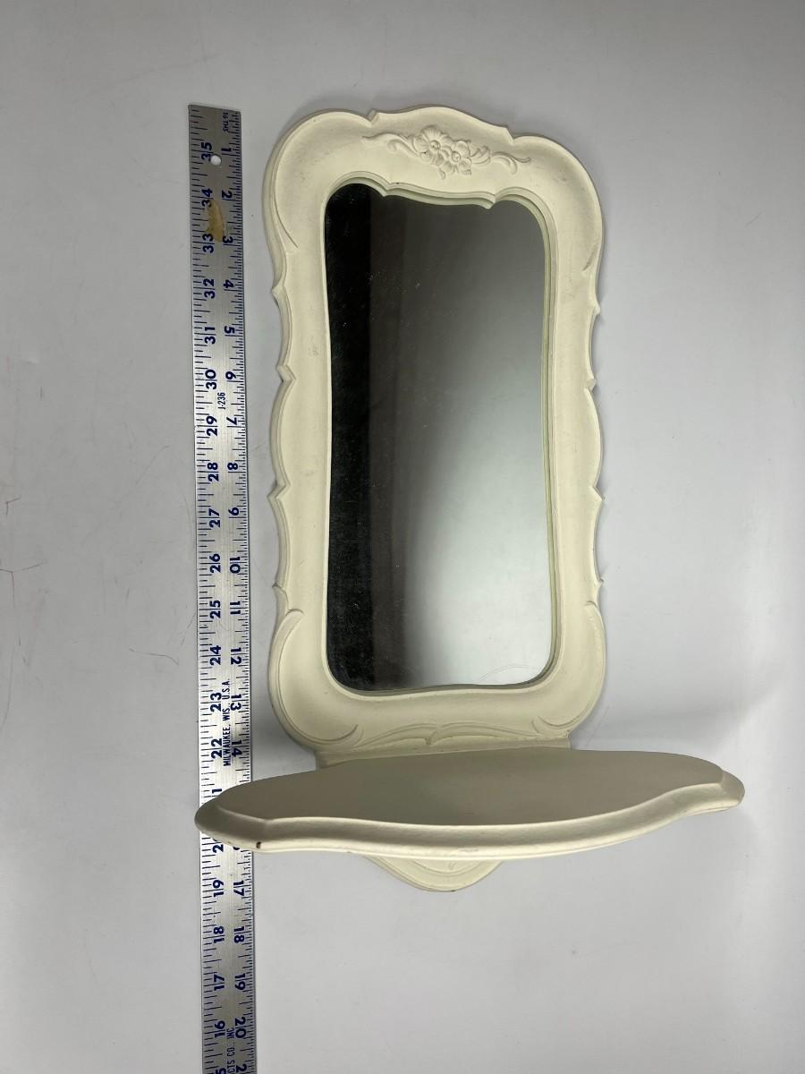 There is no significant damage to the shelf or mirror and is in overall good useable or displayable condition. Check pictures for more details and for sizing.