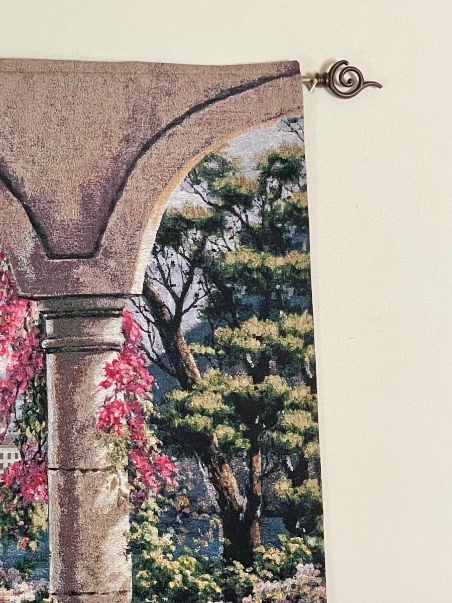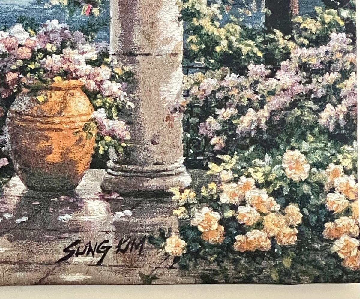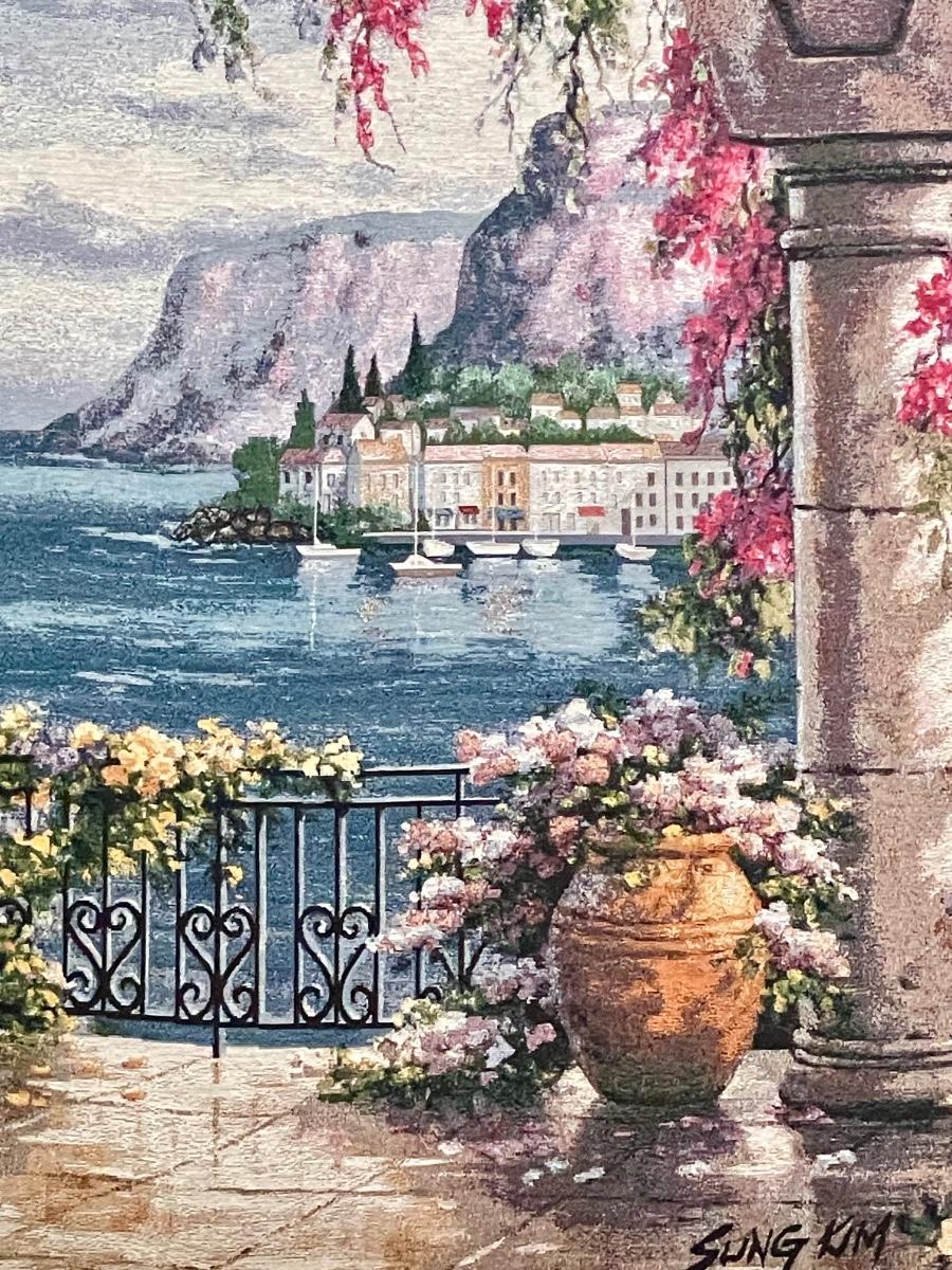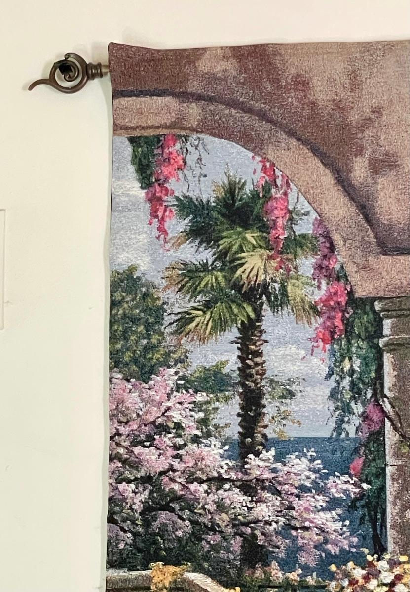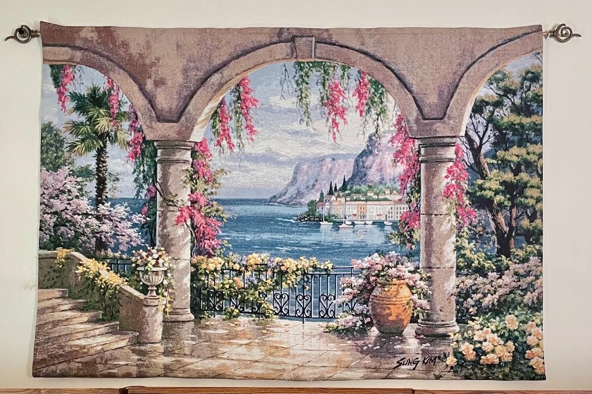 Large woven tapestry of a seaside veranda. Approx. 4’ x 6’.