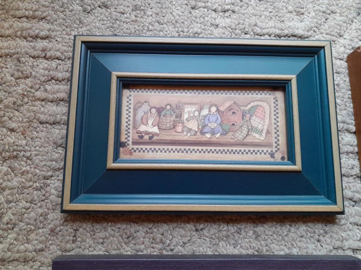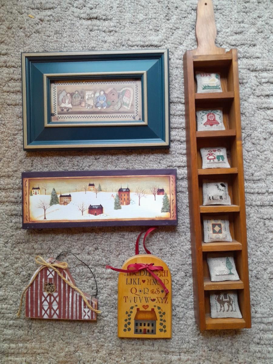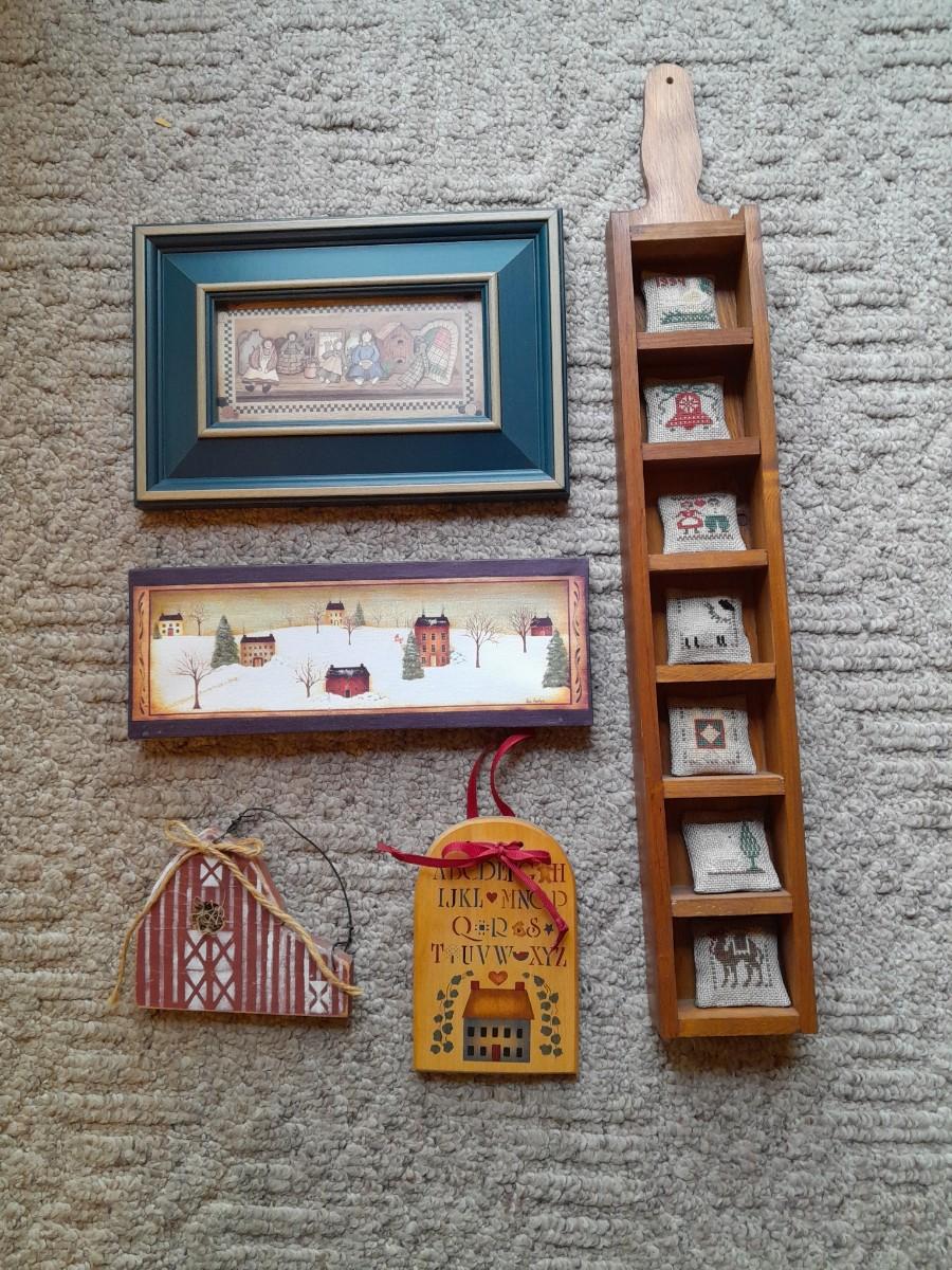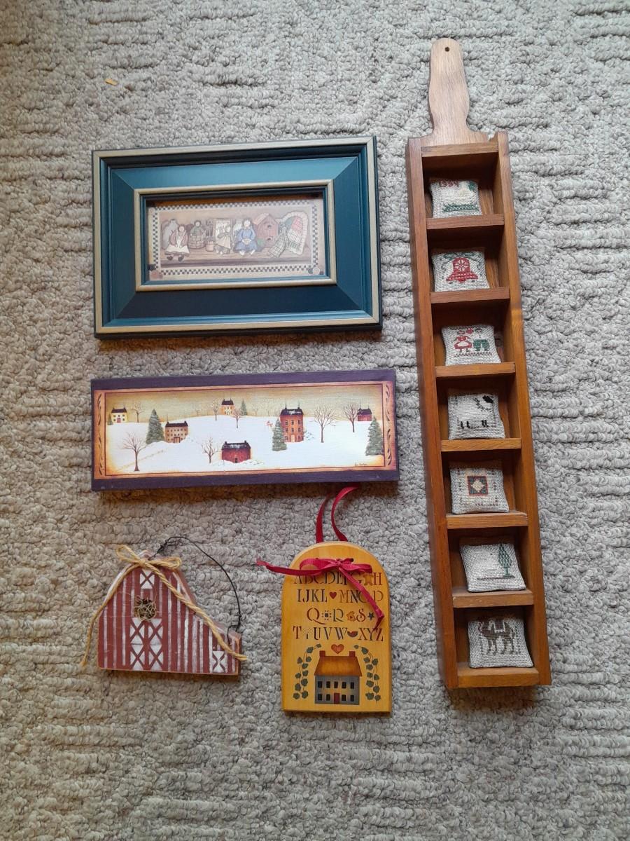 WALL HANGINGS, FRAMED DOLLS AND BIRDHOUSES, CANVAS HOUSES PAINTING, WOOD BARN AND ALPHABET ART, AND SMALL LONG SHADOW BOX FULL OF DECORATIVE, MINIATURE PILLOWS