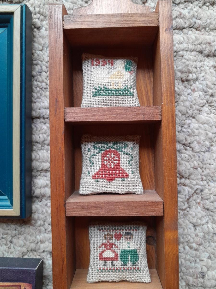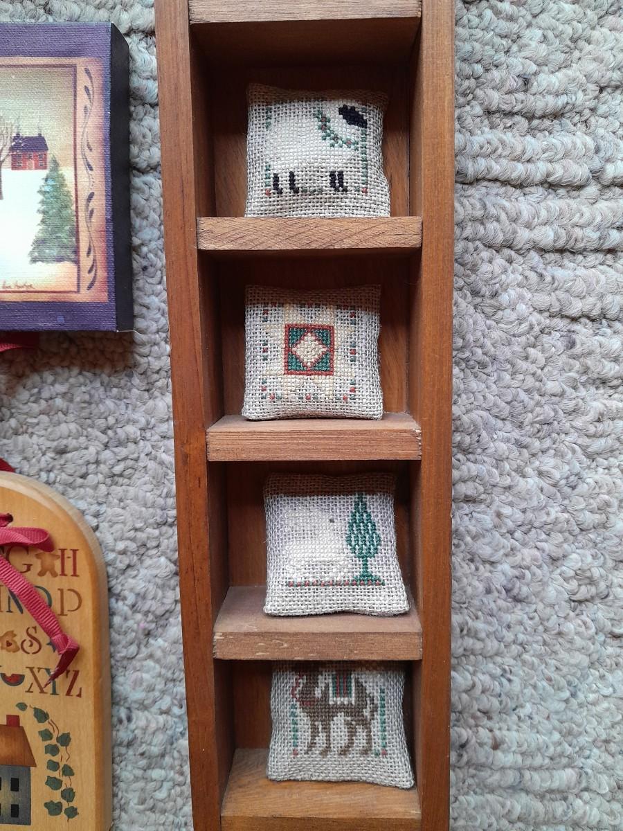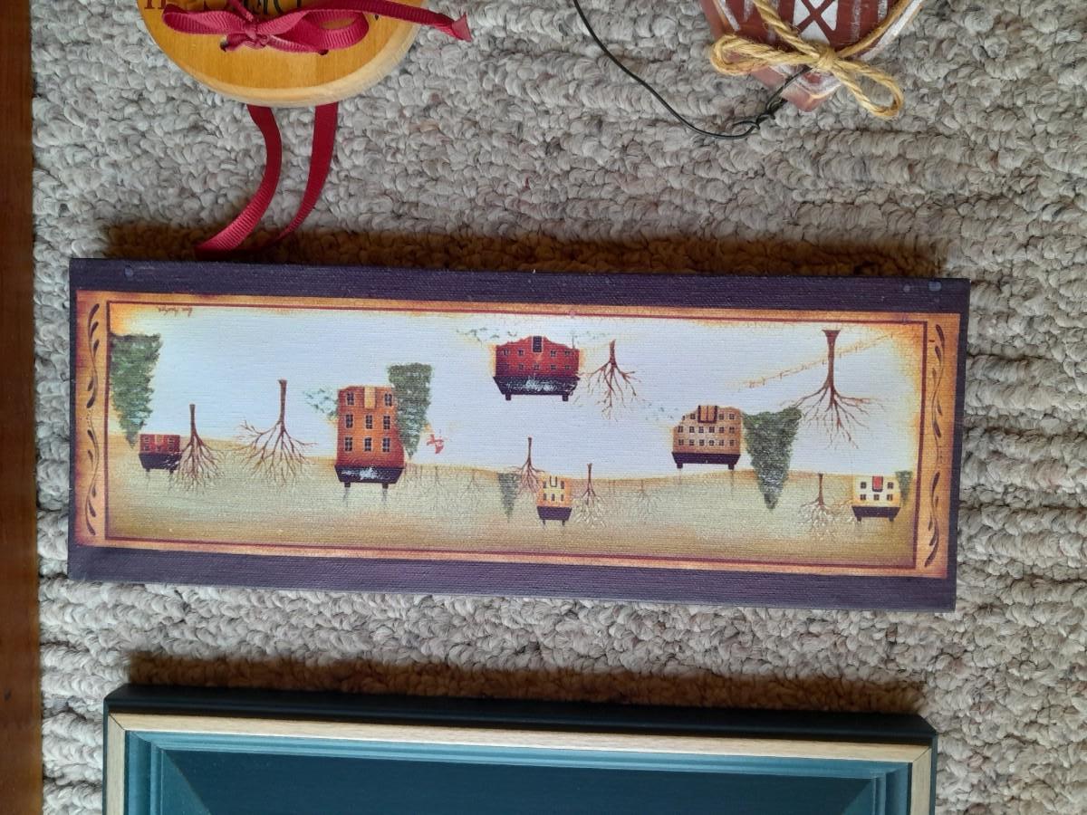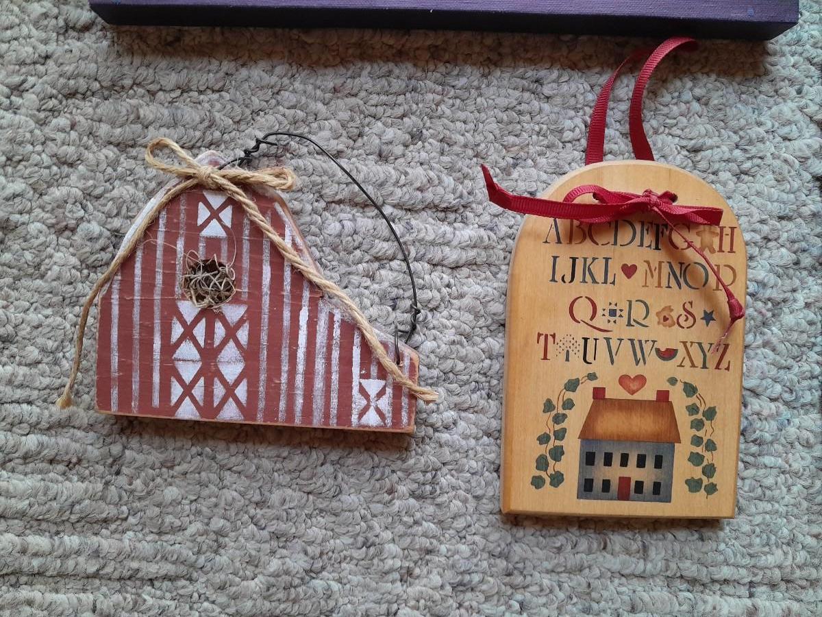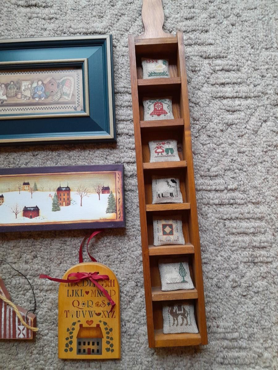 WALL HANGINGS, FRAMED DOLLS AND BIRDHOUSES, CANVAS HOUSES PAINTING, WOOD BARN AND ALPHABET ART, AND SMALL LONG SHADOW BOX FULL OF DECORATIVE, MINIATURE PILLOWS