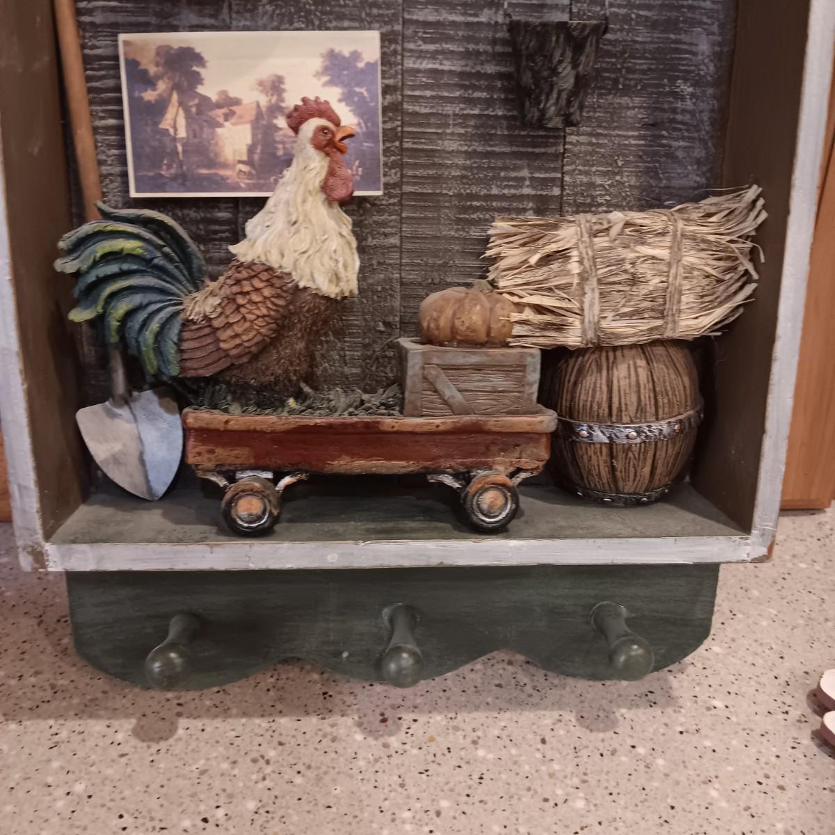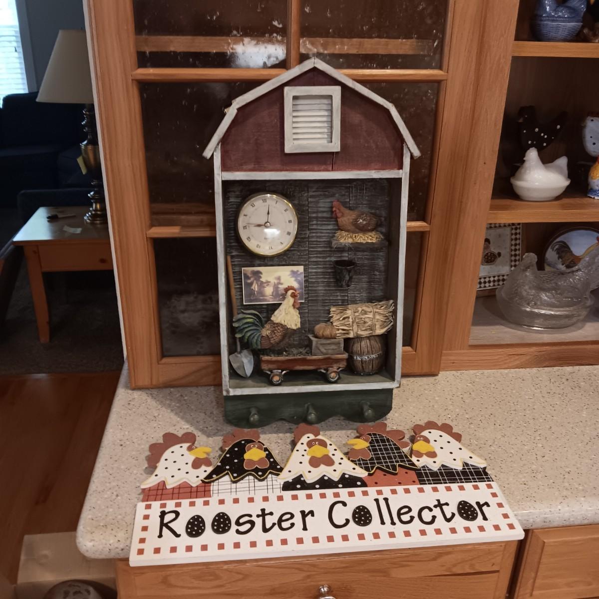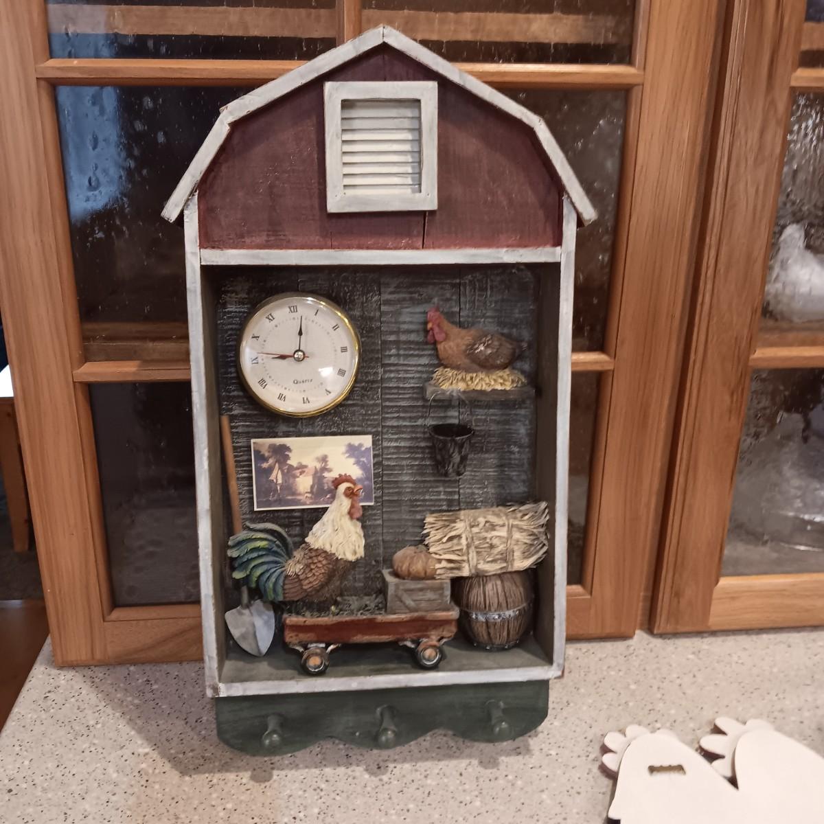 WALL HUNG BARN DIORAMA WITH A CLOCK PLUS A WOODEN SIGN