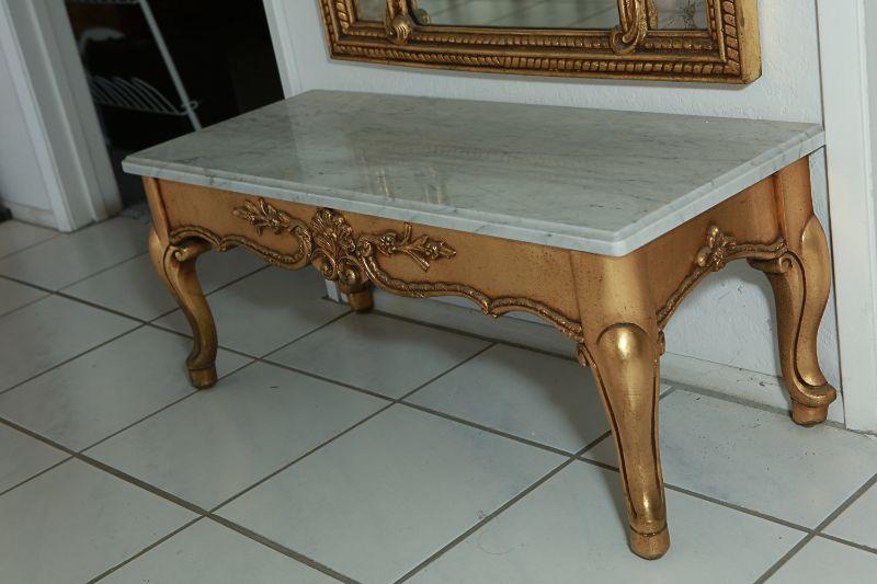 Vintage Regency style wall mirror and marble bench. Perfect for an entry way or a dressing area. Long gold gilt framed curved top mirror. Low bench with marble top. Marble comes off the base. Could be repainted to fit any decor. Mirror measures about 70"x27" and the bench 21"x13"x14".