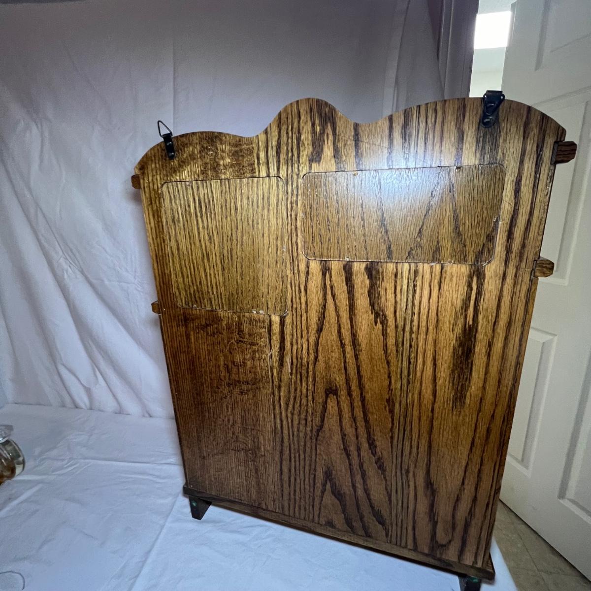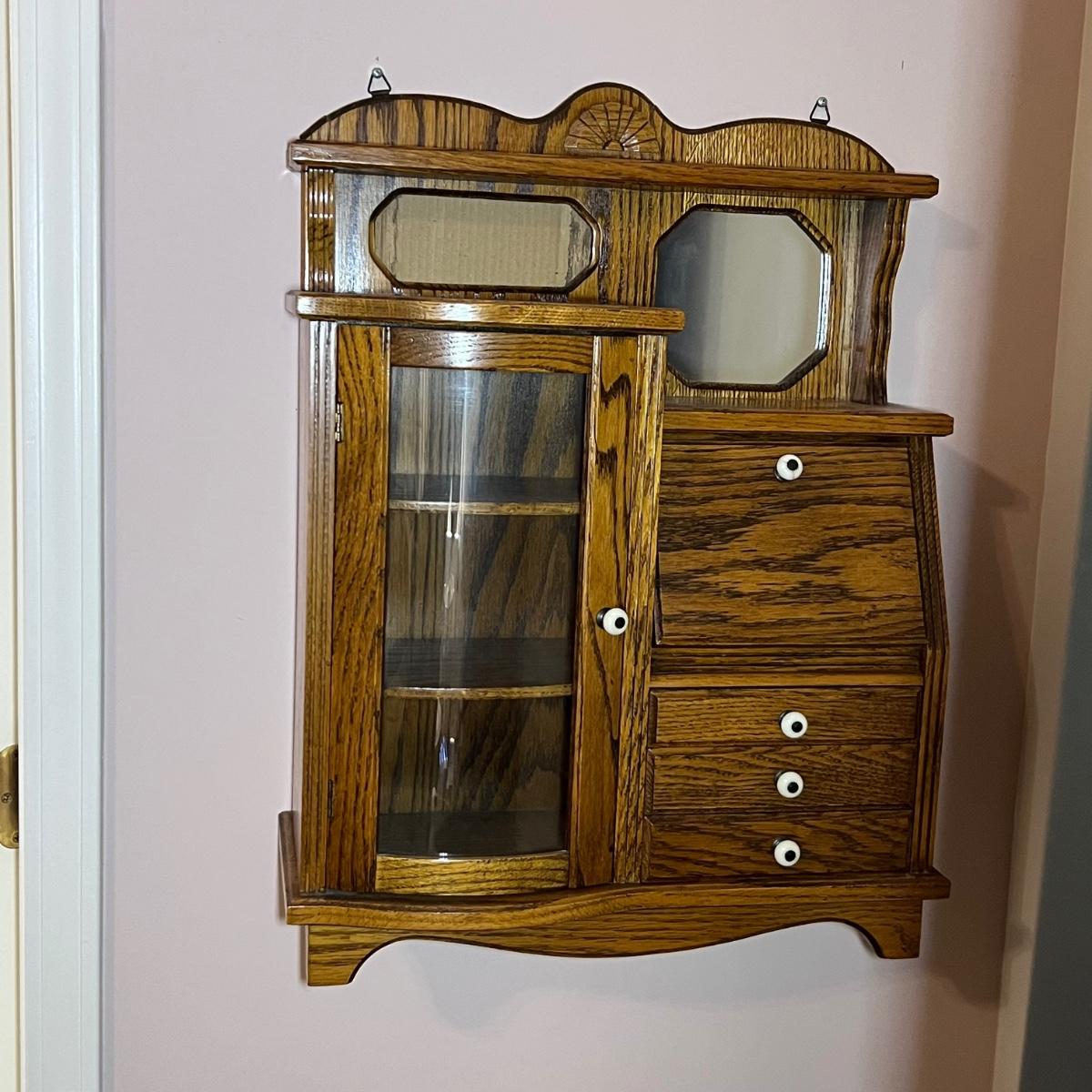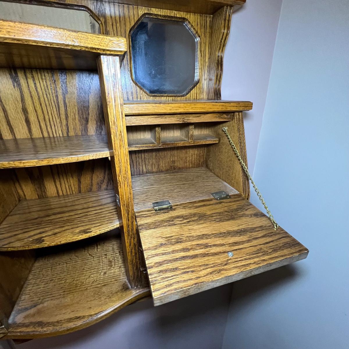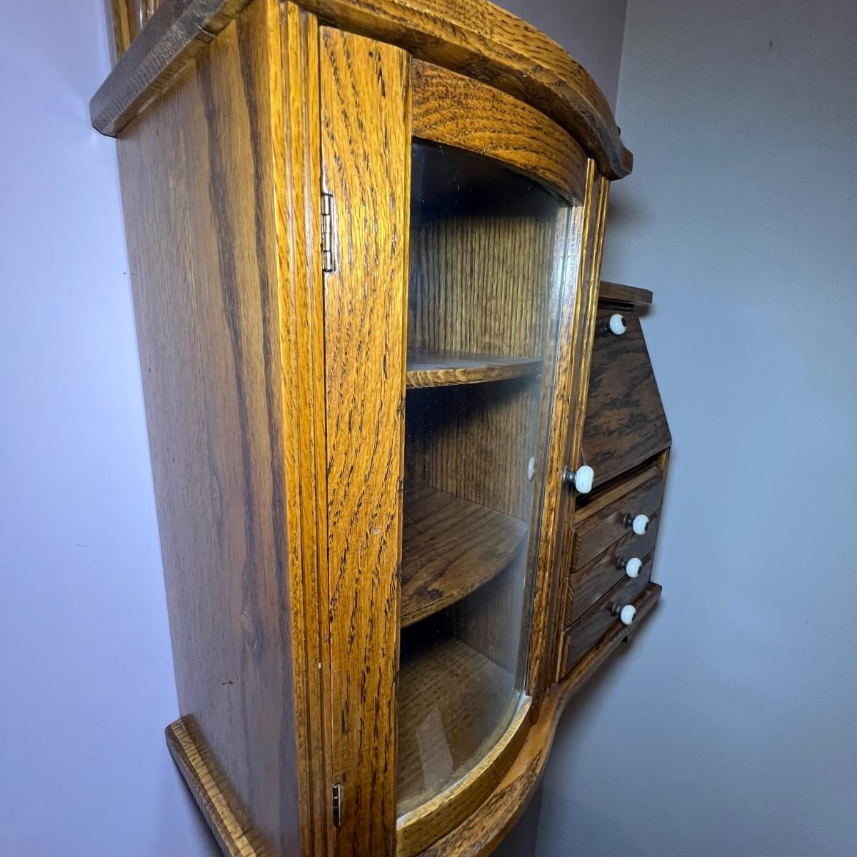 This unique small wall mounted cabinet appears to be oak. The left side cabinet has curved glass front with two small shelves inside. The right side consists of three small drawers with a bureau style cabinet above that has a drop down lid. The top section has a mirror on one side and a blank hole on the other ready for your own custom insert.