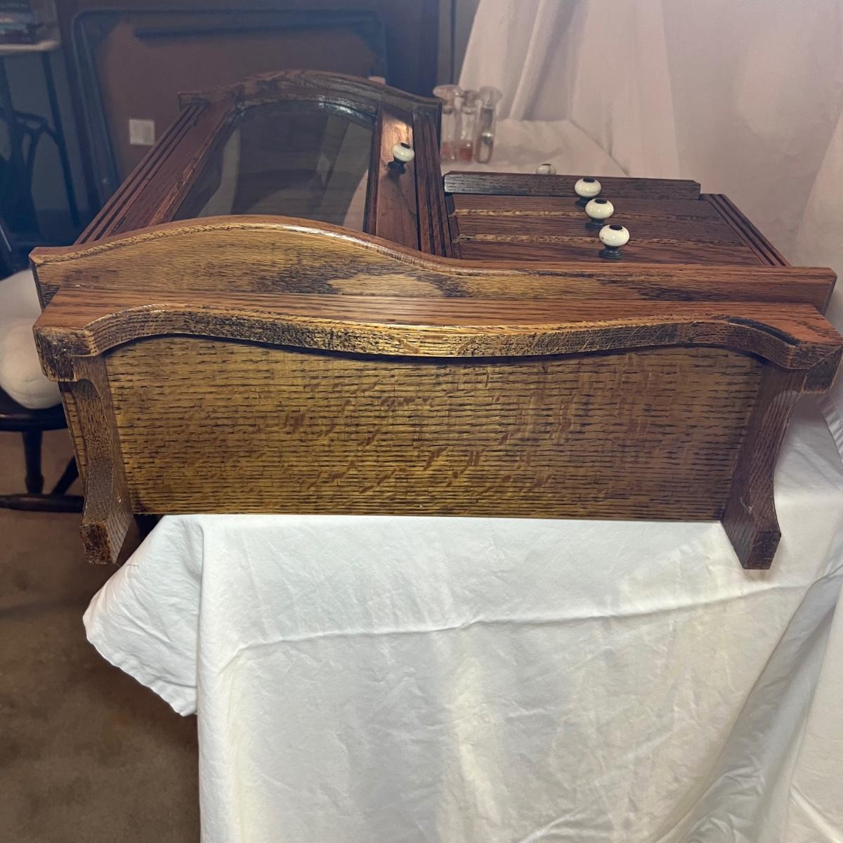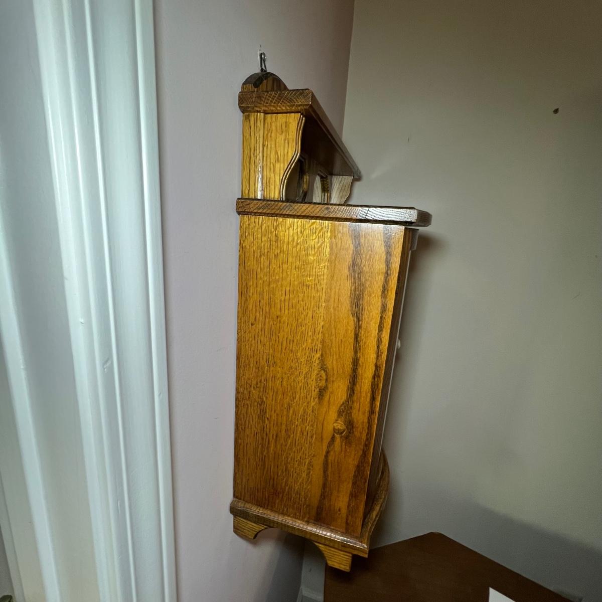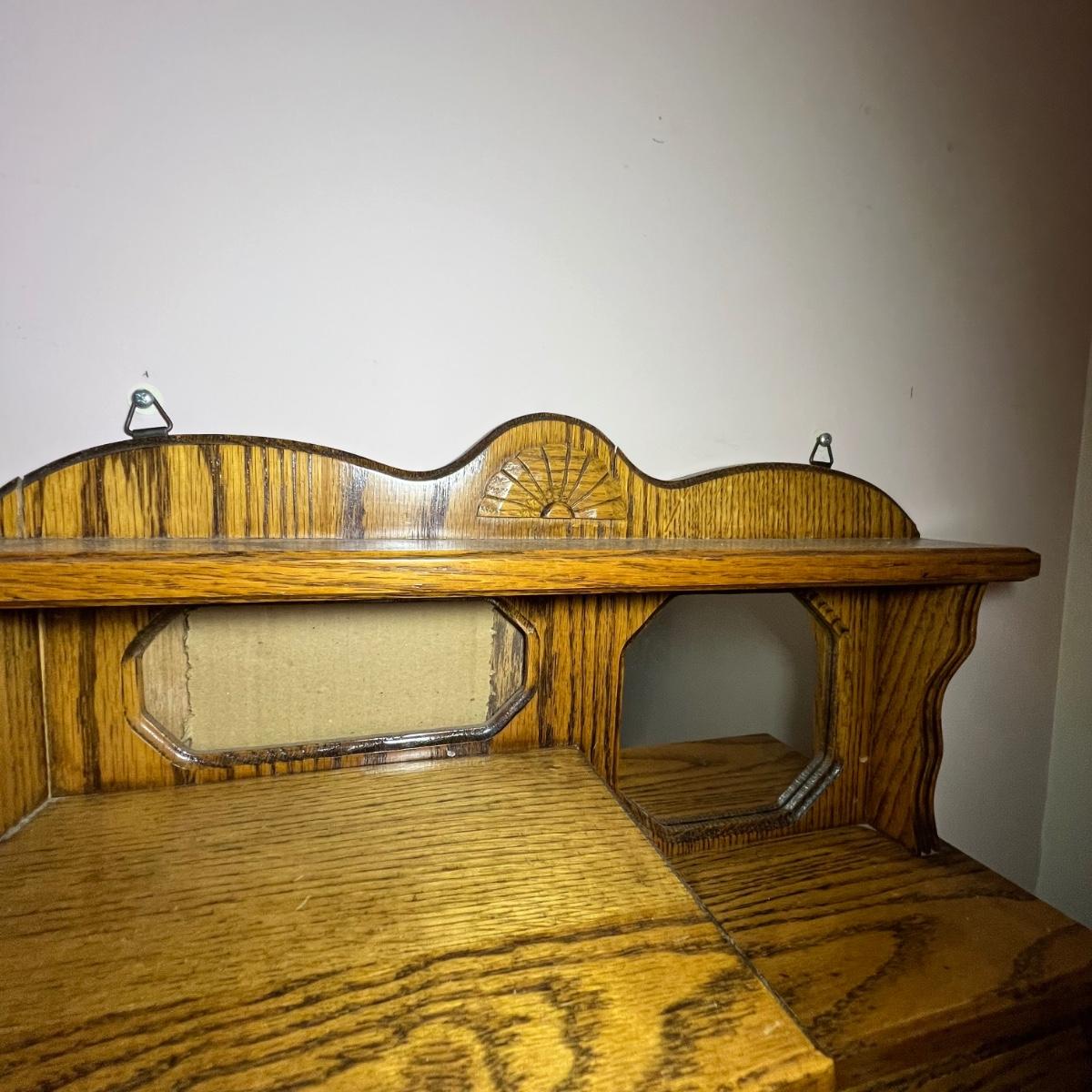 This unique small wall mounted cabinet appears to be oak. The left side cabinet has curved glass front with two small shelves inside. The right side consists of three small drawers with a bureau style cabinet above that has a drop down lid. The top section has a mirror on one side and a blank hole on the other ready for your own custom insert.