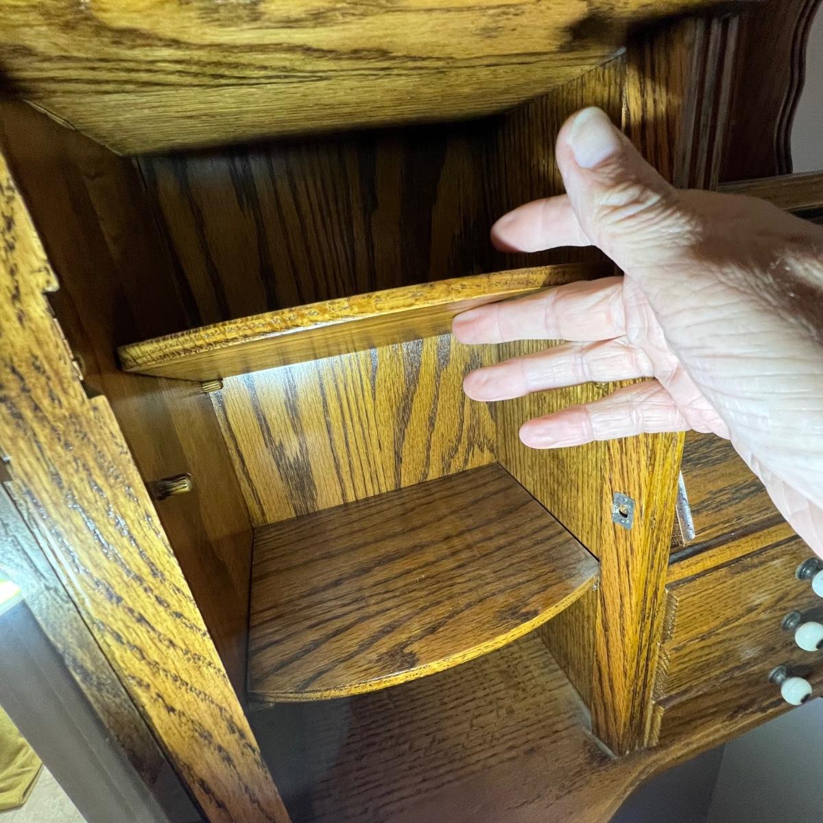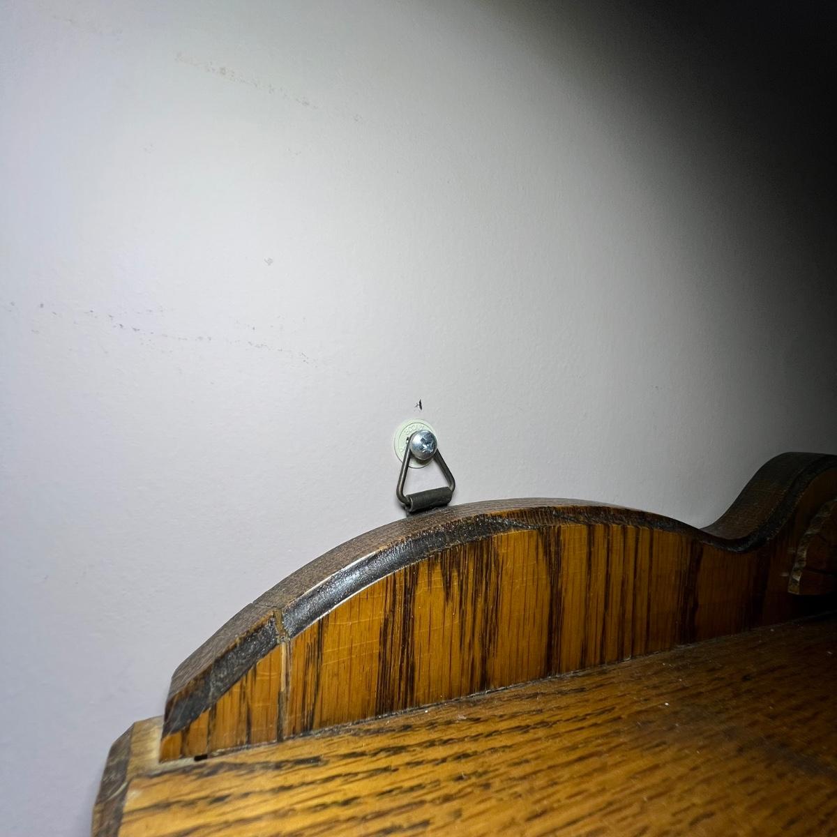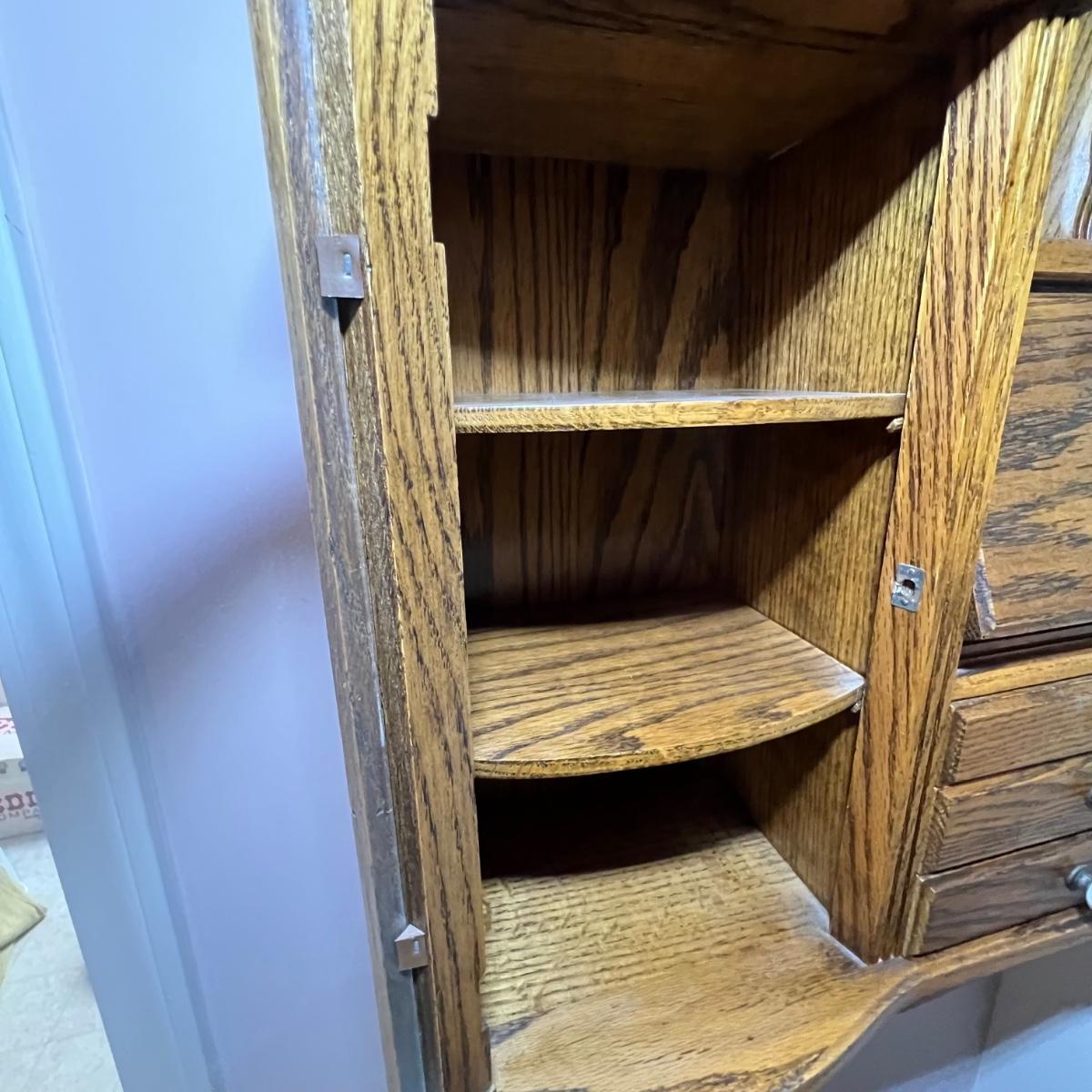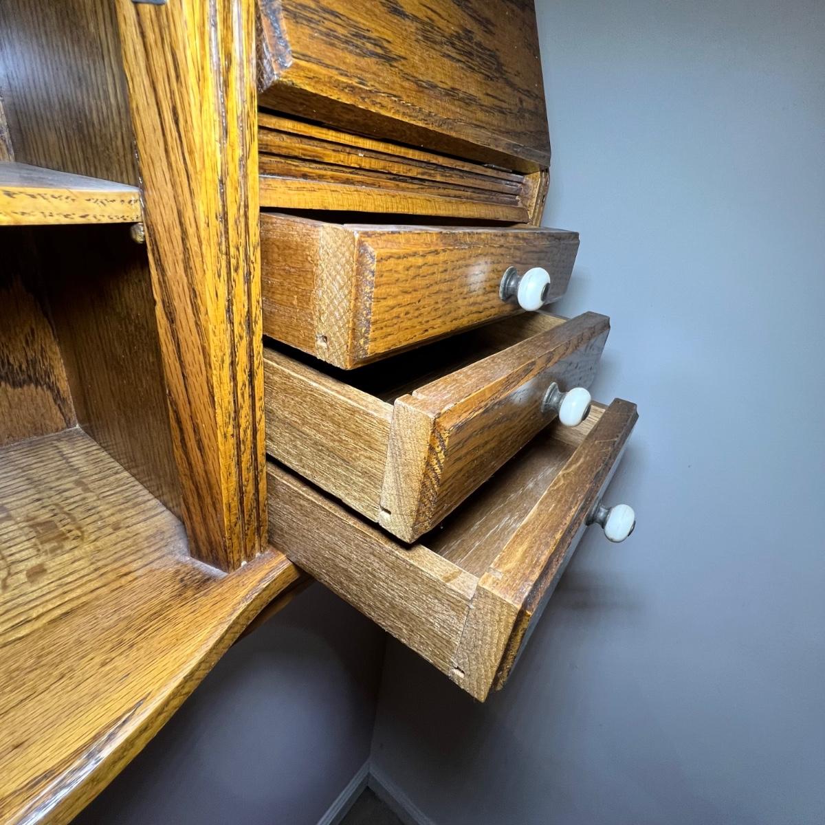 This unique small wall mounted cabinet appears to be oak. The left side cabinet has curved glass front with two small shelves inside. The right side consists of three small drawers with a bureau style cabinet above that has a drop down lid. The top section has a mirror on one side and a blank hole on the other ready for your own custom insert.