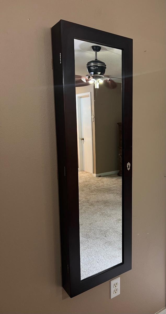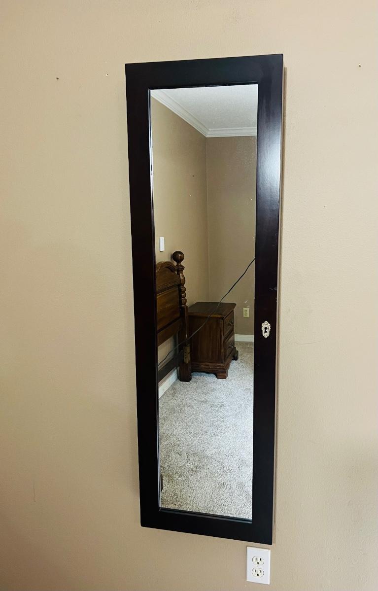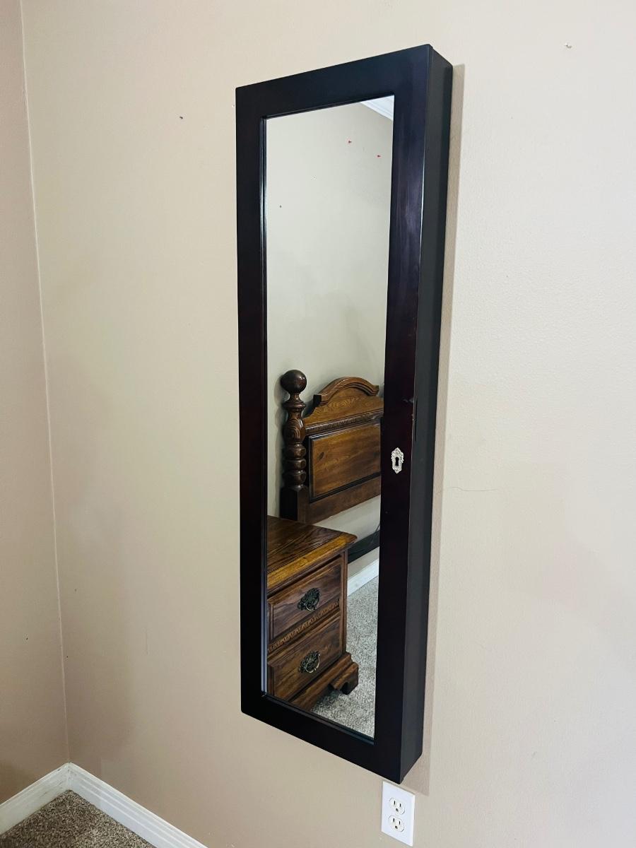 Cherrywood Wall Mount Hanging Jewelry Box With mirror front. No key, .jewelry not included Measures 48 inches tall, 15 inches wide and 4 inches deep.