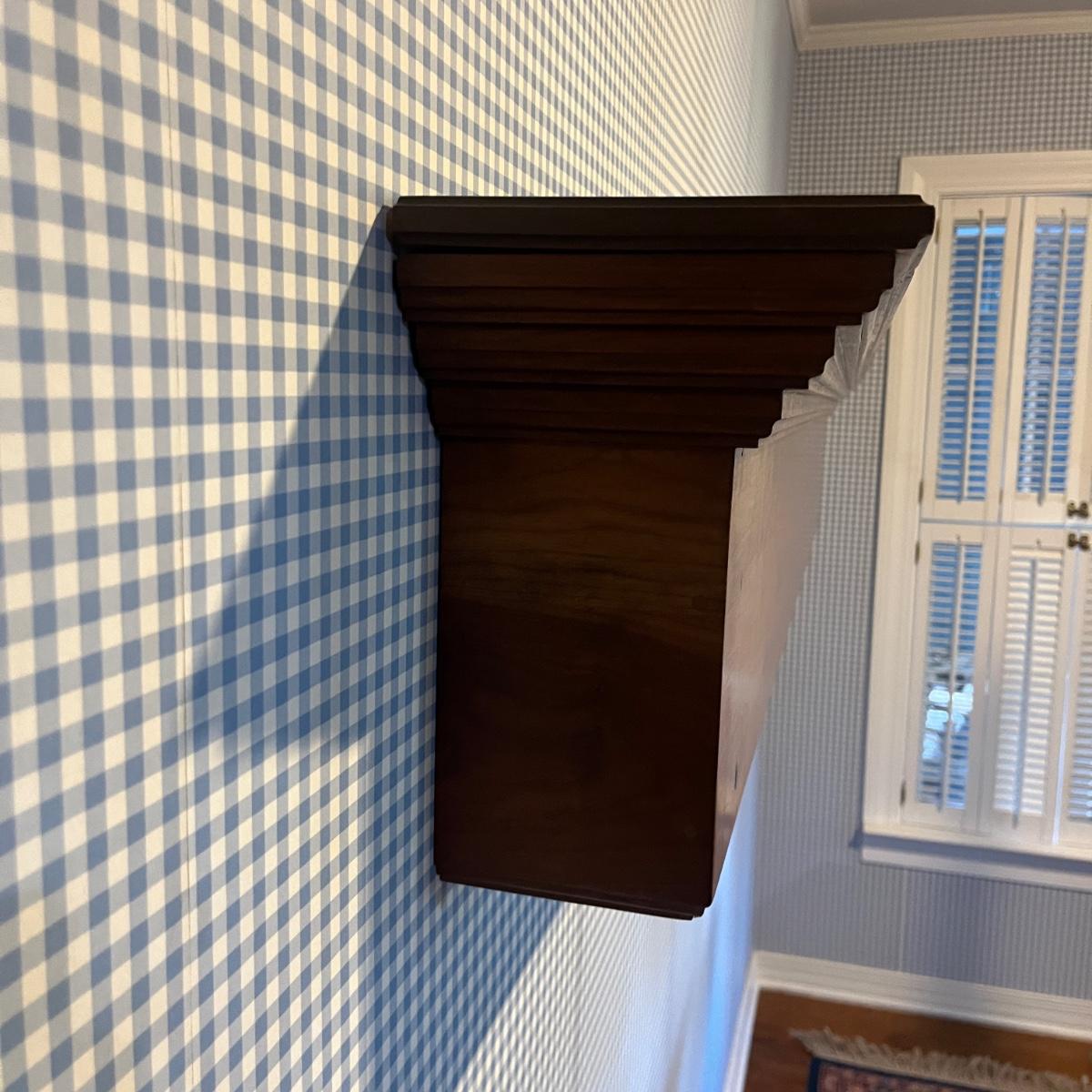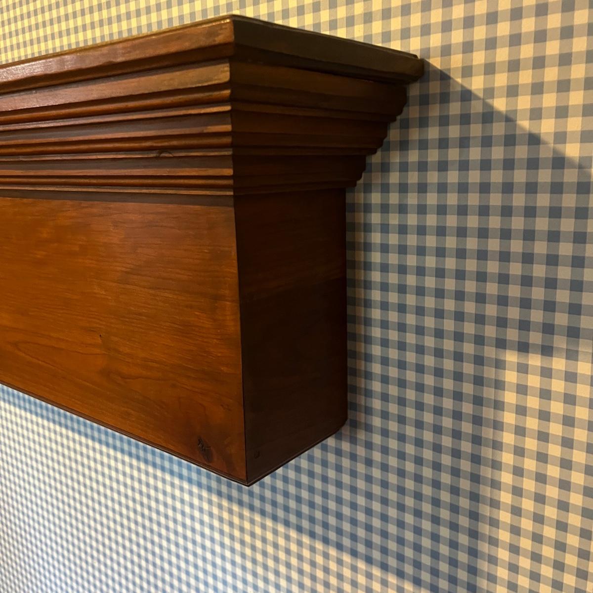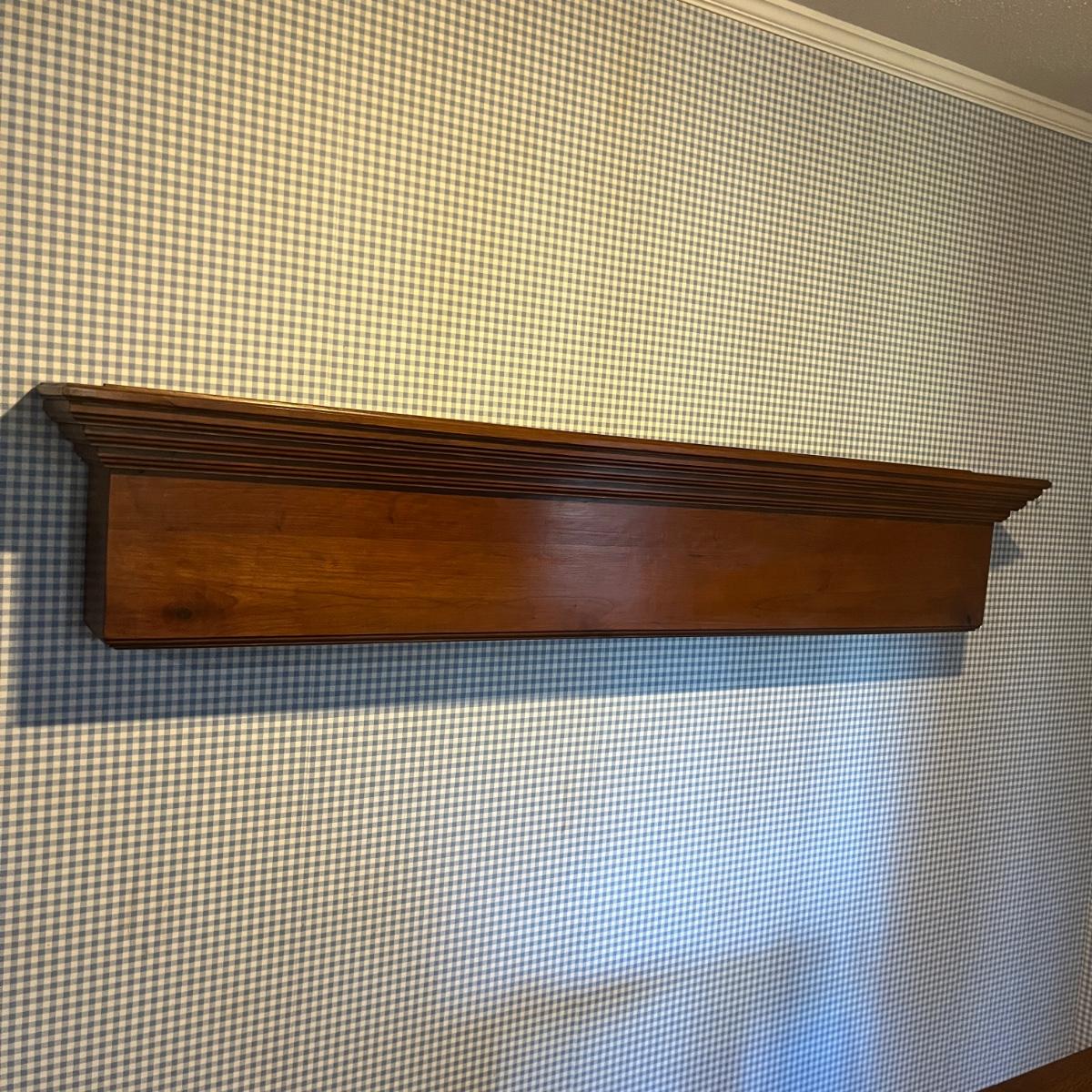 Lot includes a wooden wall mount mantel-style plate stand that measures 72” x 8” x 12.5”H. The 2” x 4” piece of wood used to mount is available to winning bidder but must be removed from wall with a flat head screwdriver.