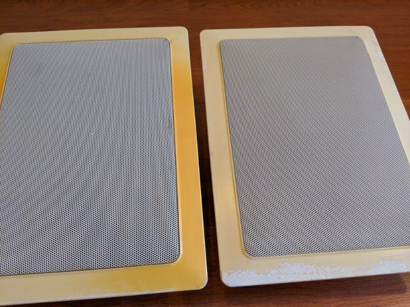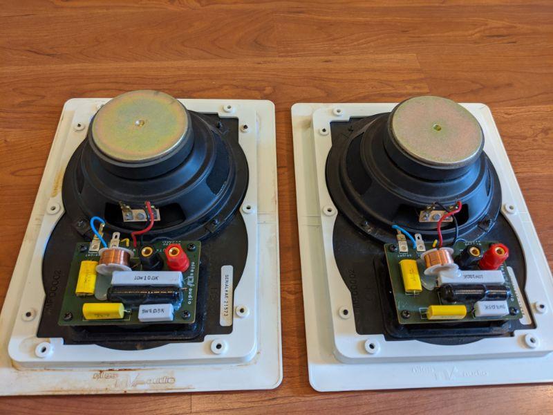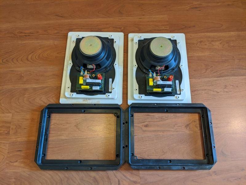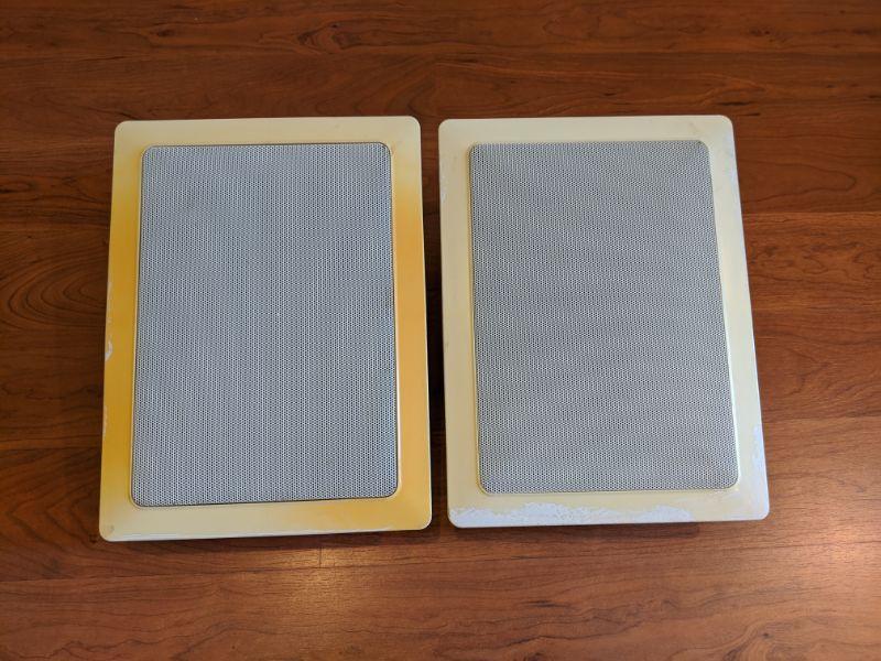 This are used pair of in wall Niles Audio speakers. They were tested to be working. The external plastic frame has some paint or discoloration but the speakers themselves are in pristine condition. Comes with mount brackets.