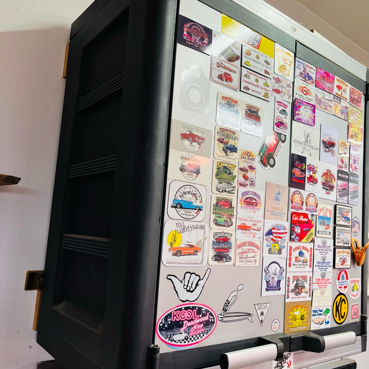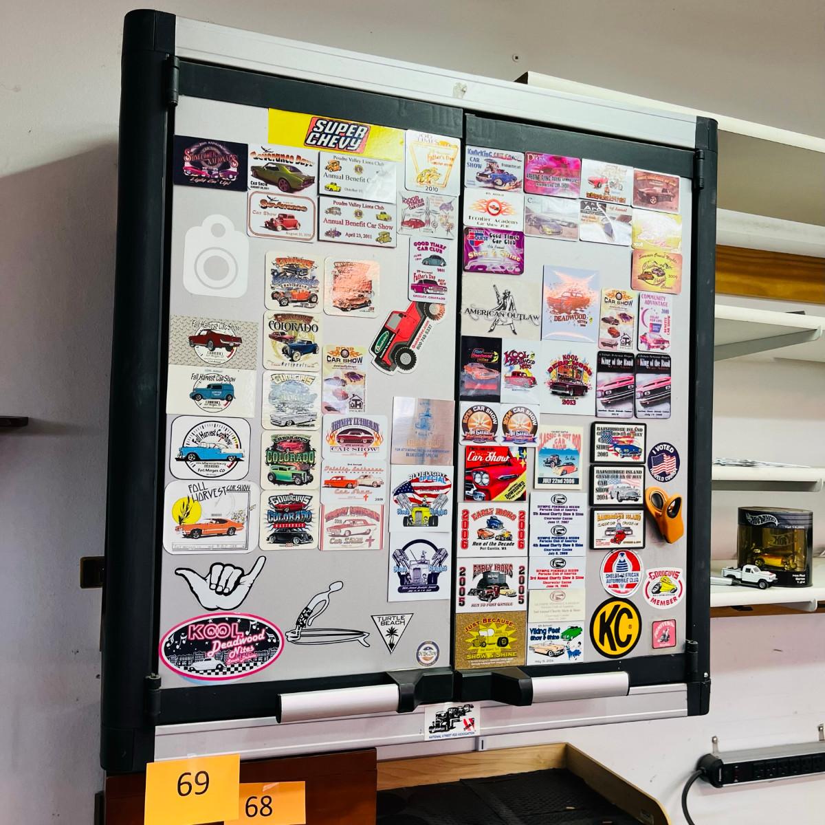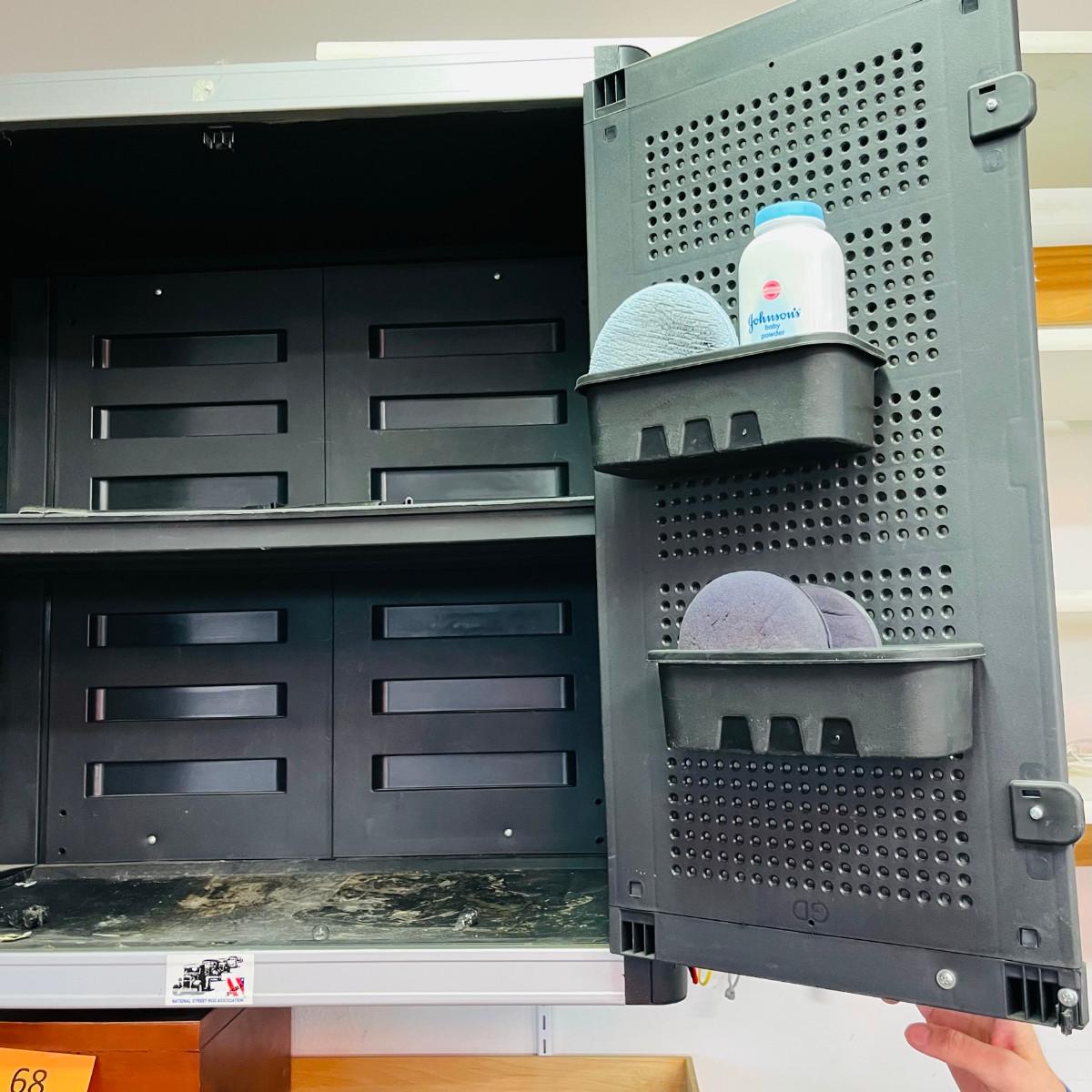We have two wall mount cabinets, and two under counter cabinets. This one is full of car show plaques.