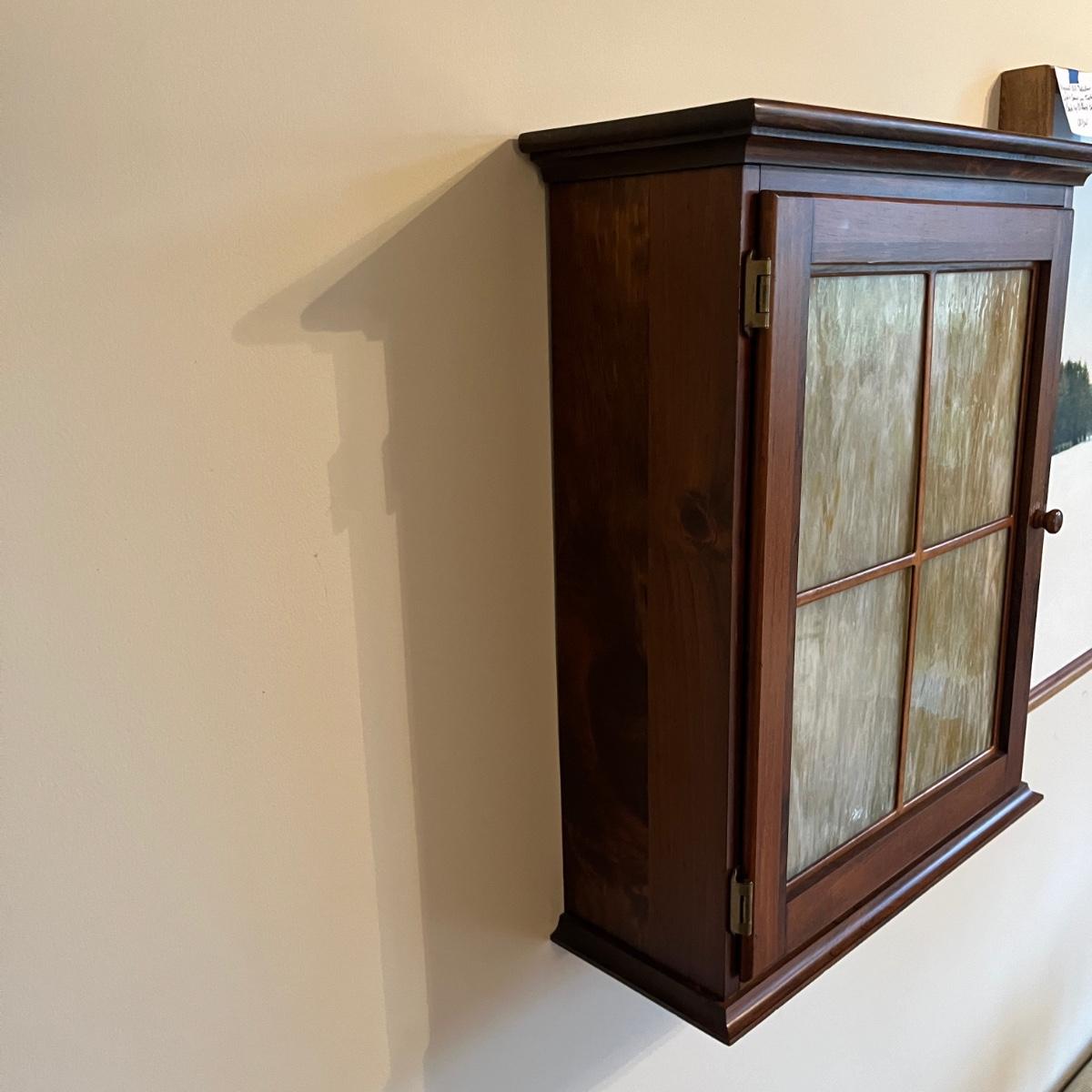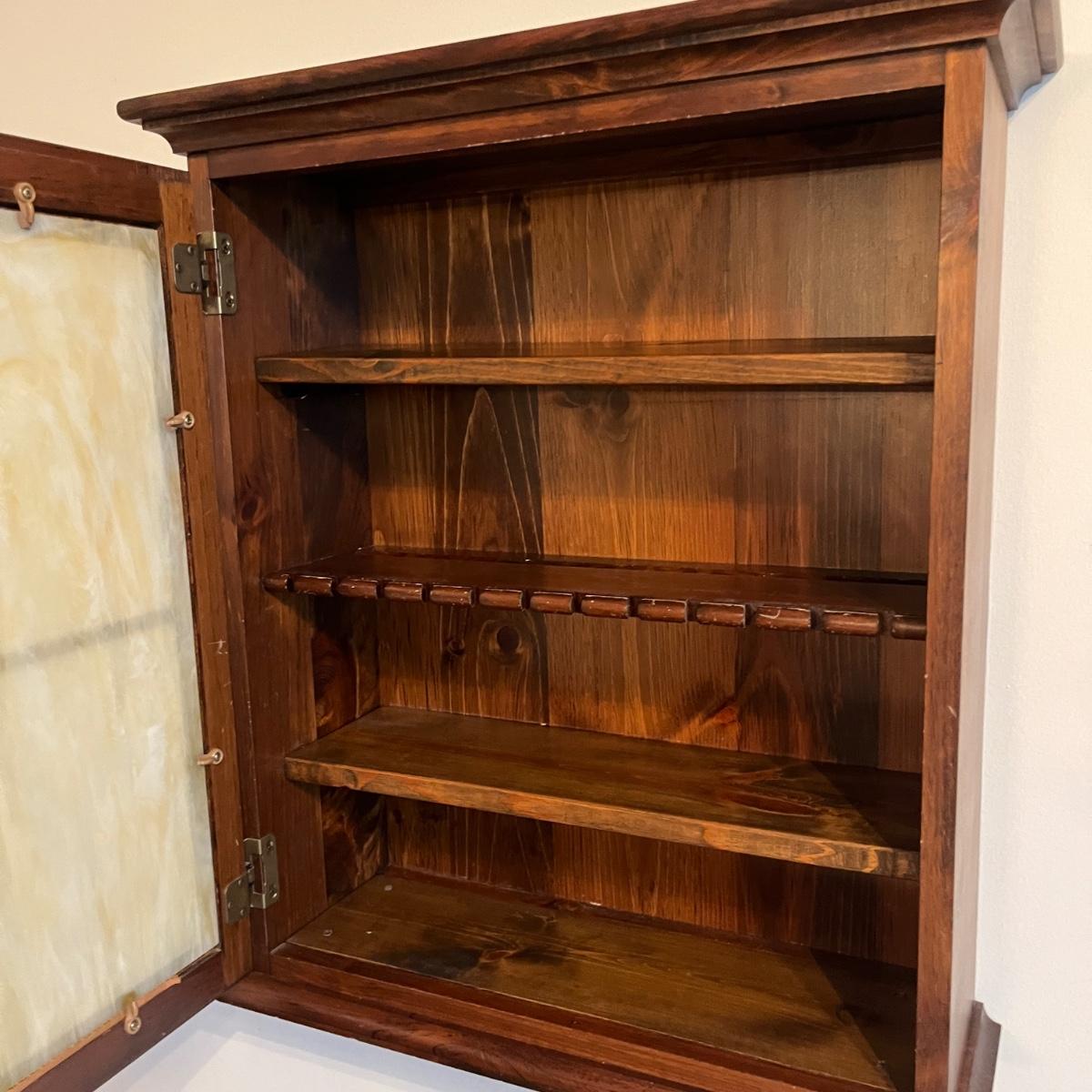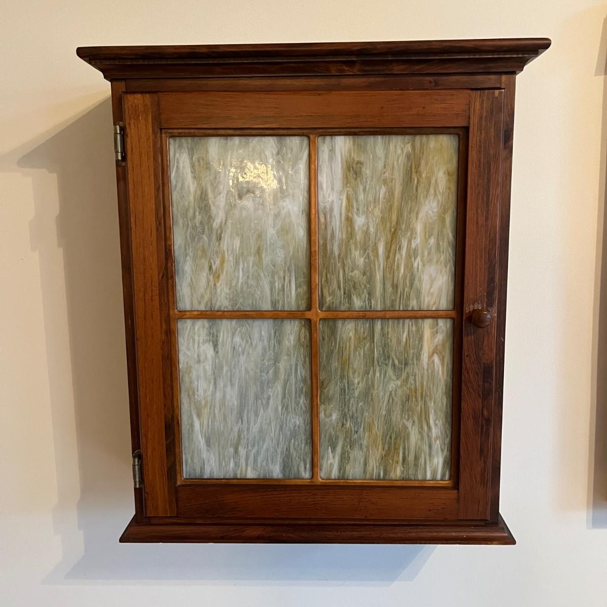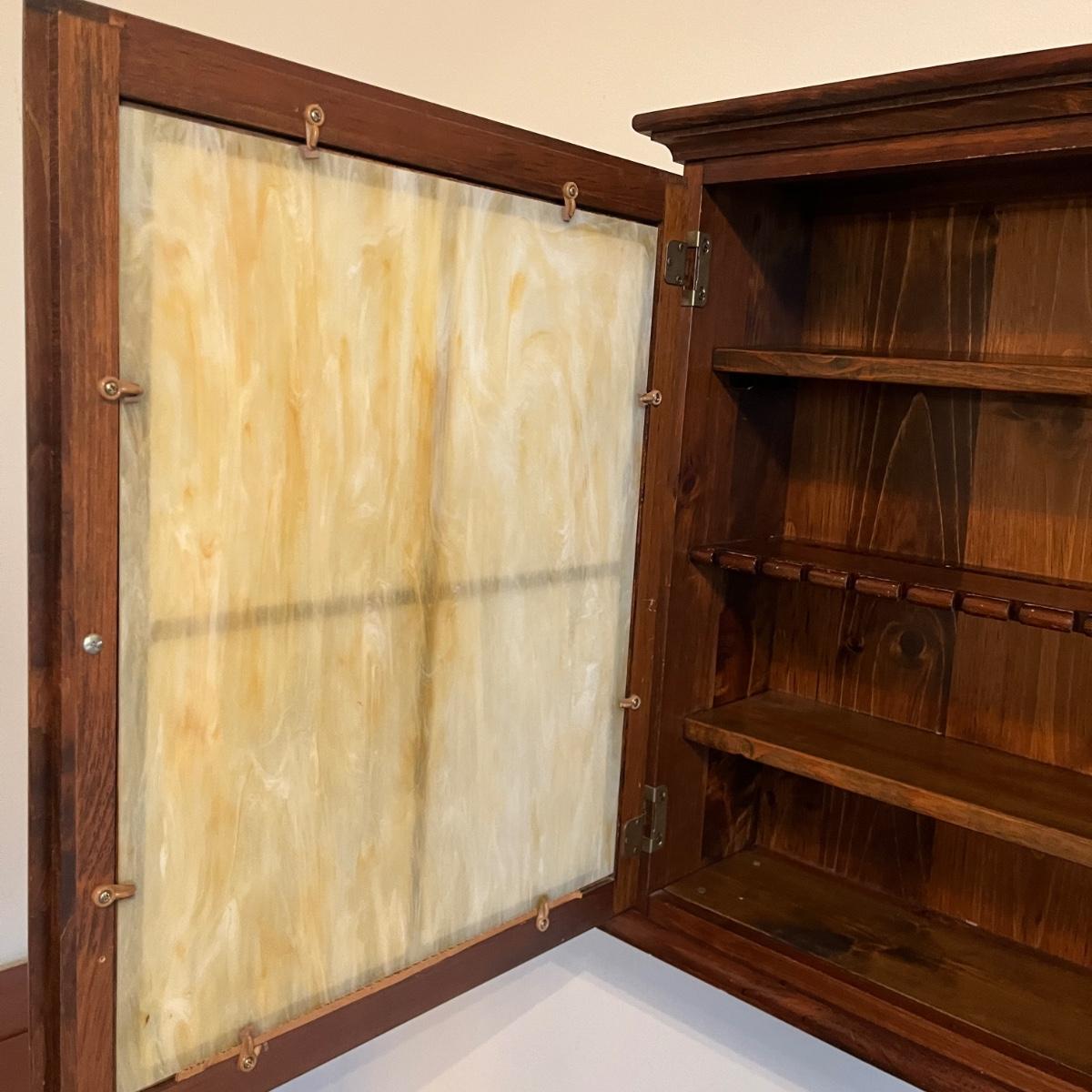 Lot includes a wooden wall mount cabinet with three wooden shelves and an opaque glass front. Cabinet measures 8” x 23” x 26”H. One shelf has what appears to be slots for spoons.