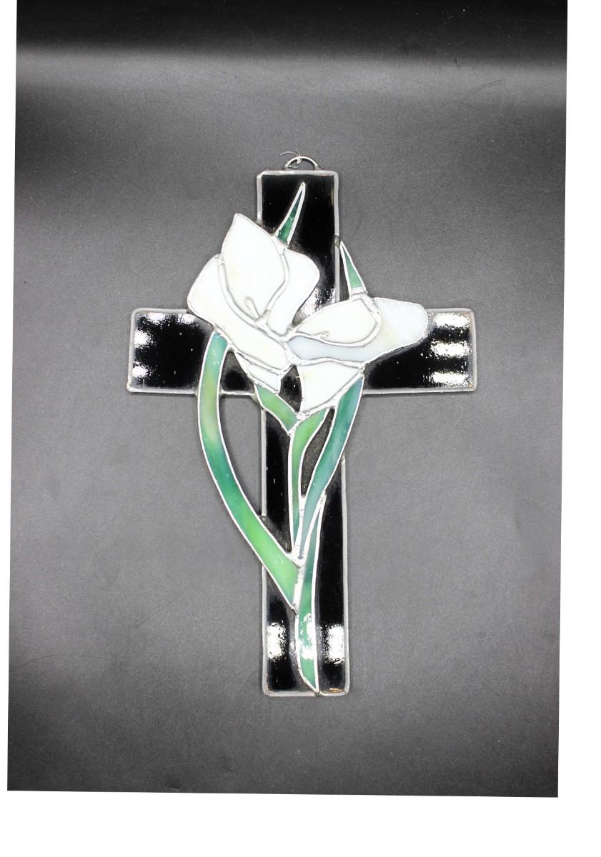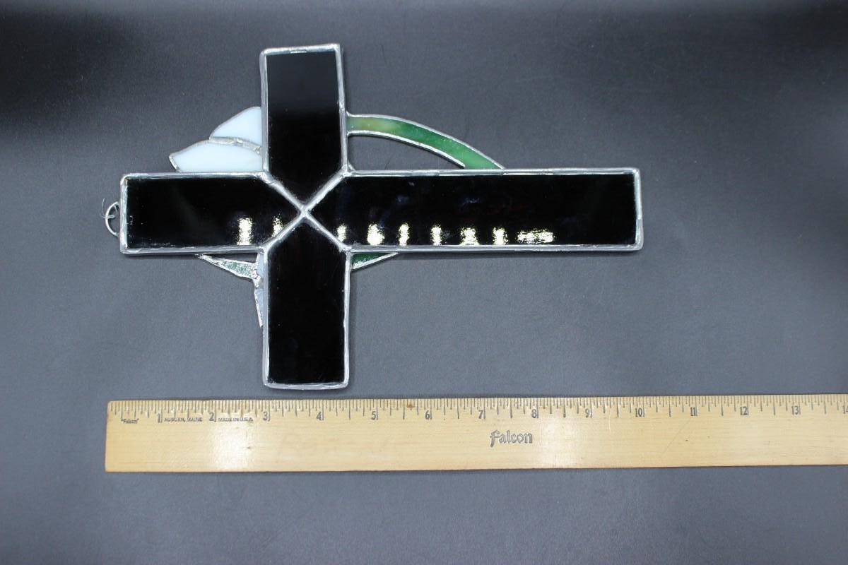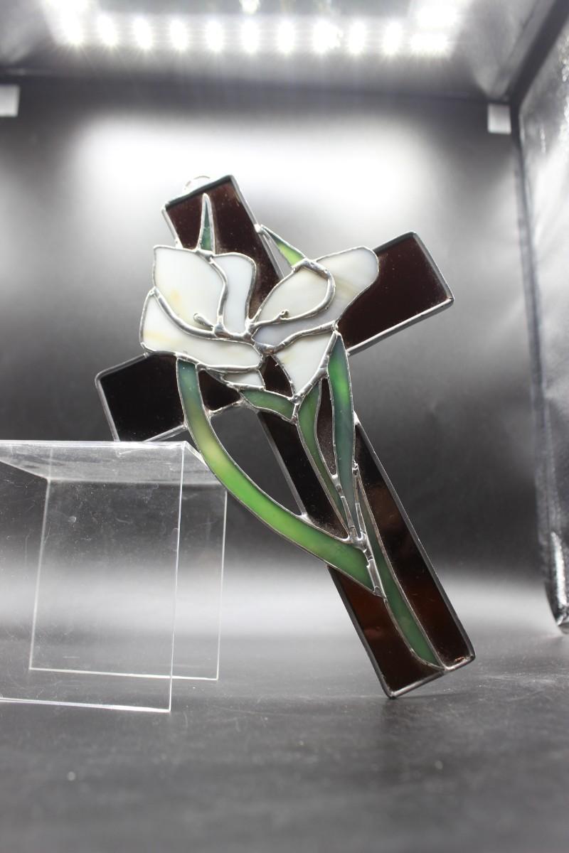 Wall Mounted Dark Brown Stained Glass Cross with Lilies, there are no cracks or chips to the cross and is in good condition. Check pictures for more details and for sizing.