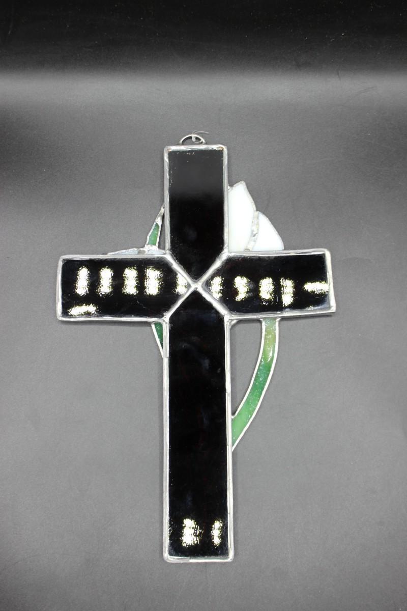 Wall Mounted Dark Brown Stained Glass Cross with Lilies