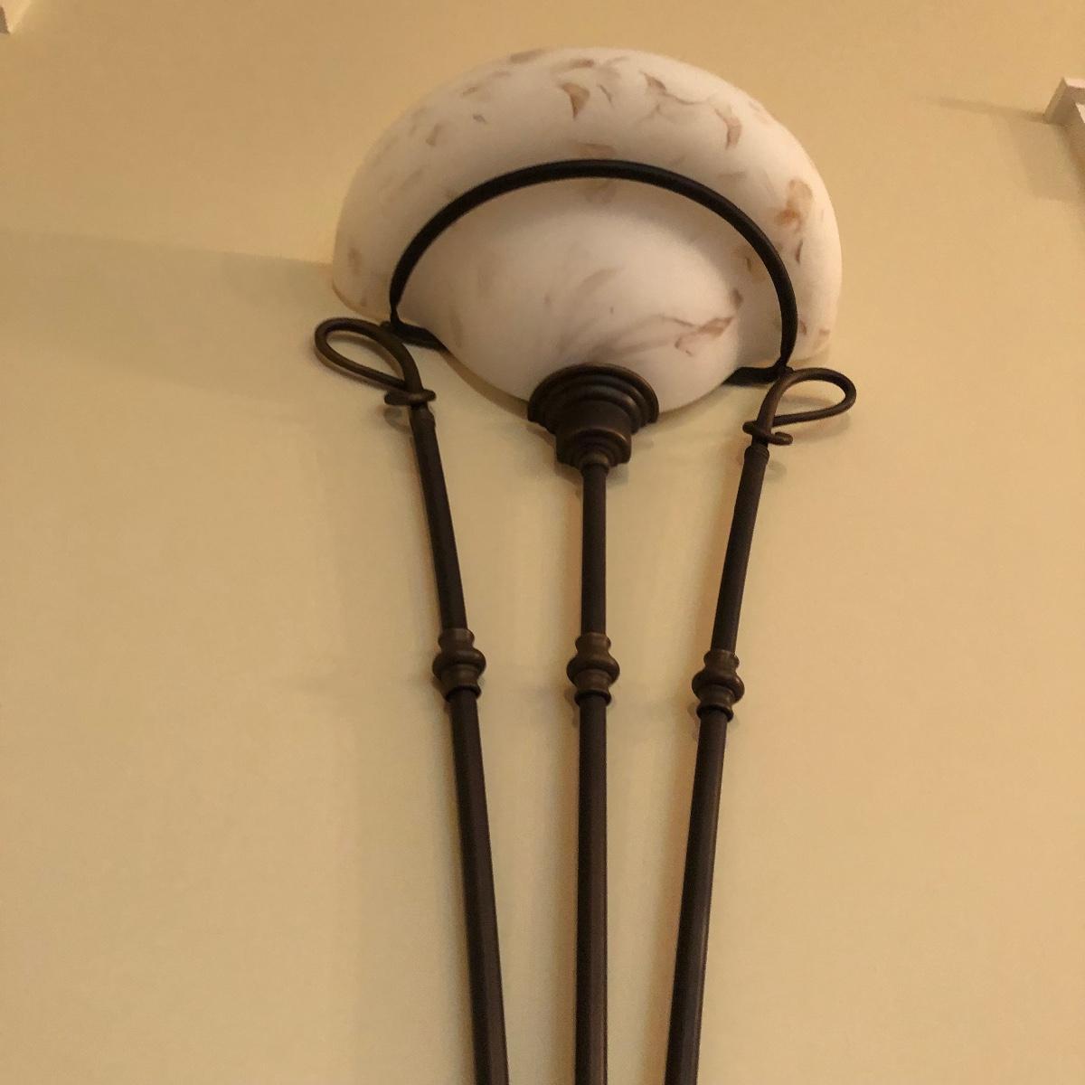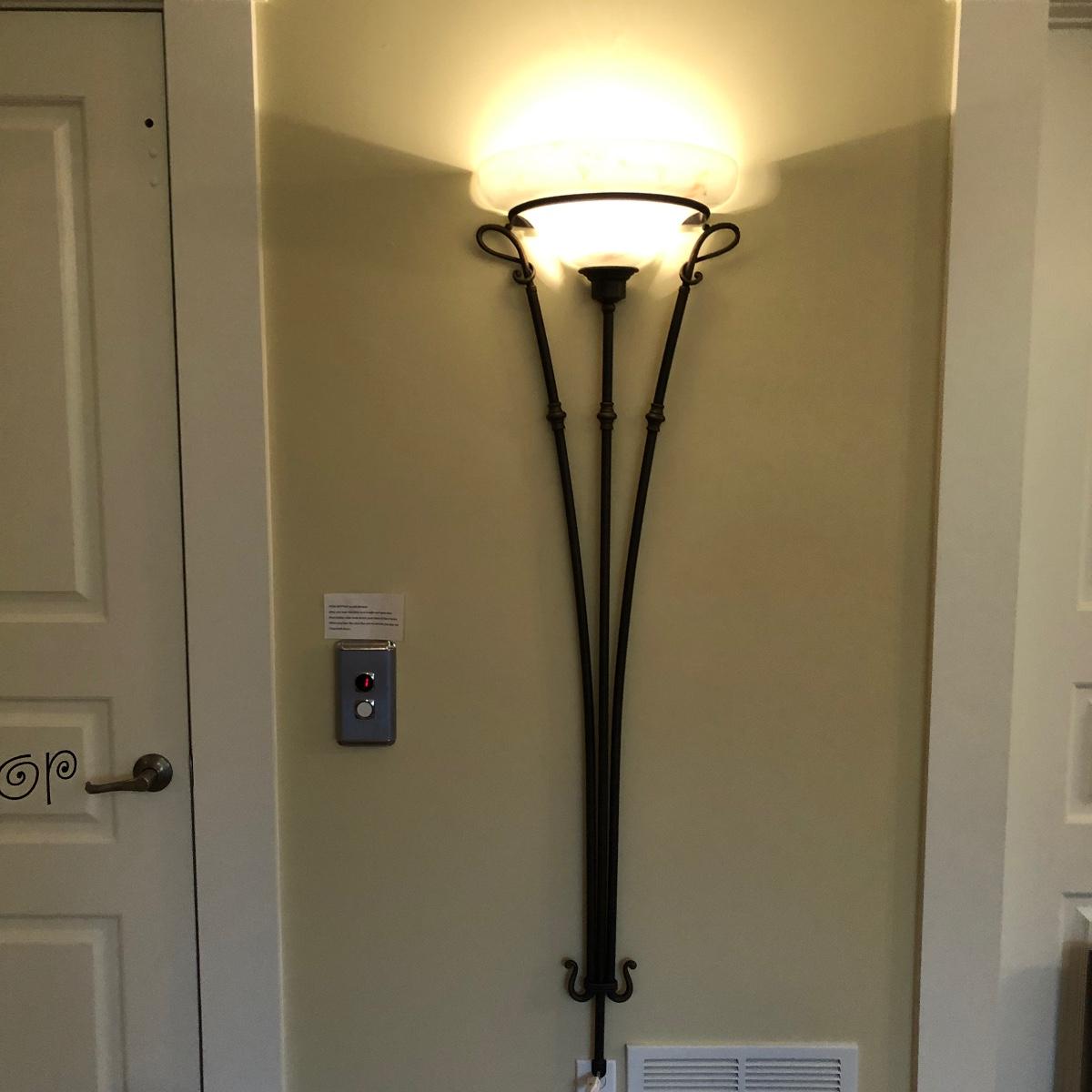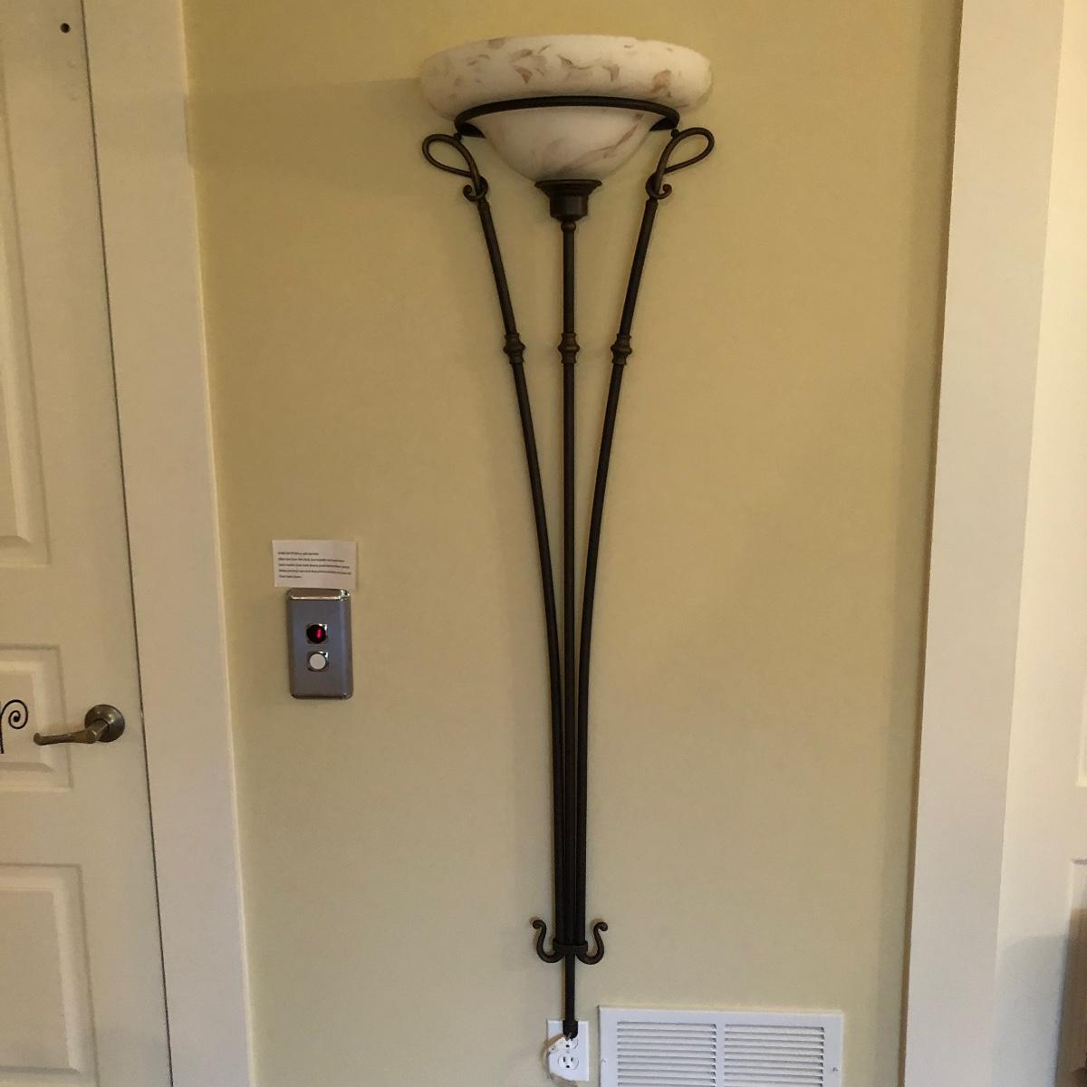 Lot includes wall mounted metal lamp with glass sconce style shade. One piece on right side is not attached and switch does not work, see pictures. You can turn it on and off by plugging in . Lamp measures 16.5” x 61” x 8.5”.