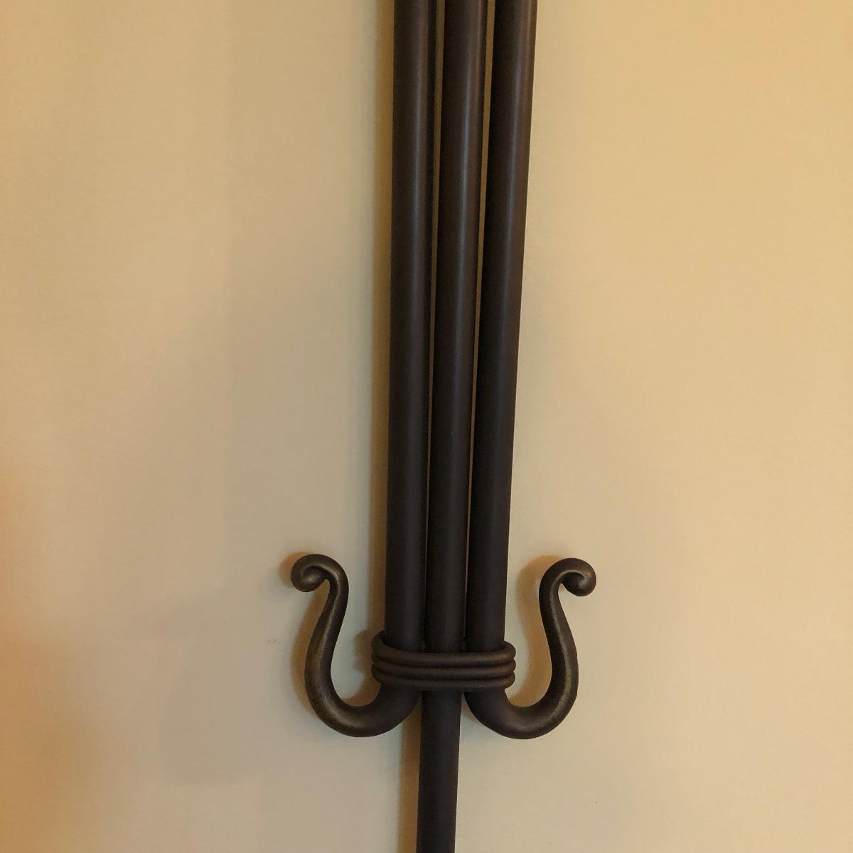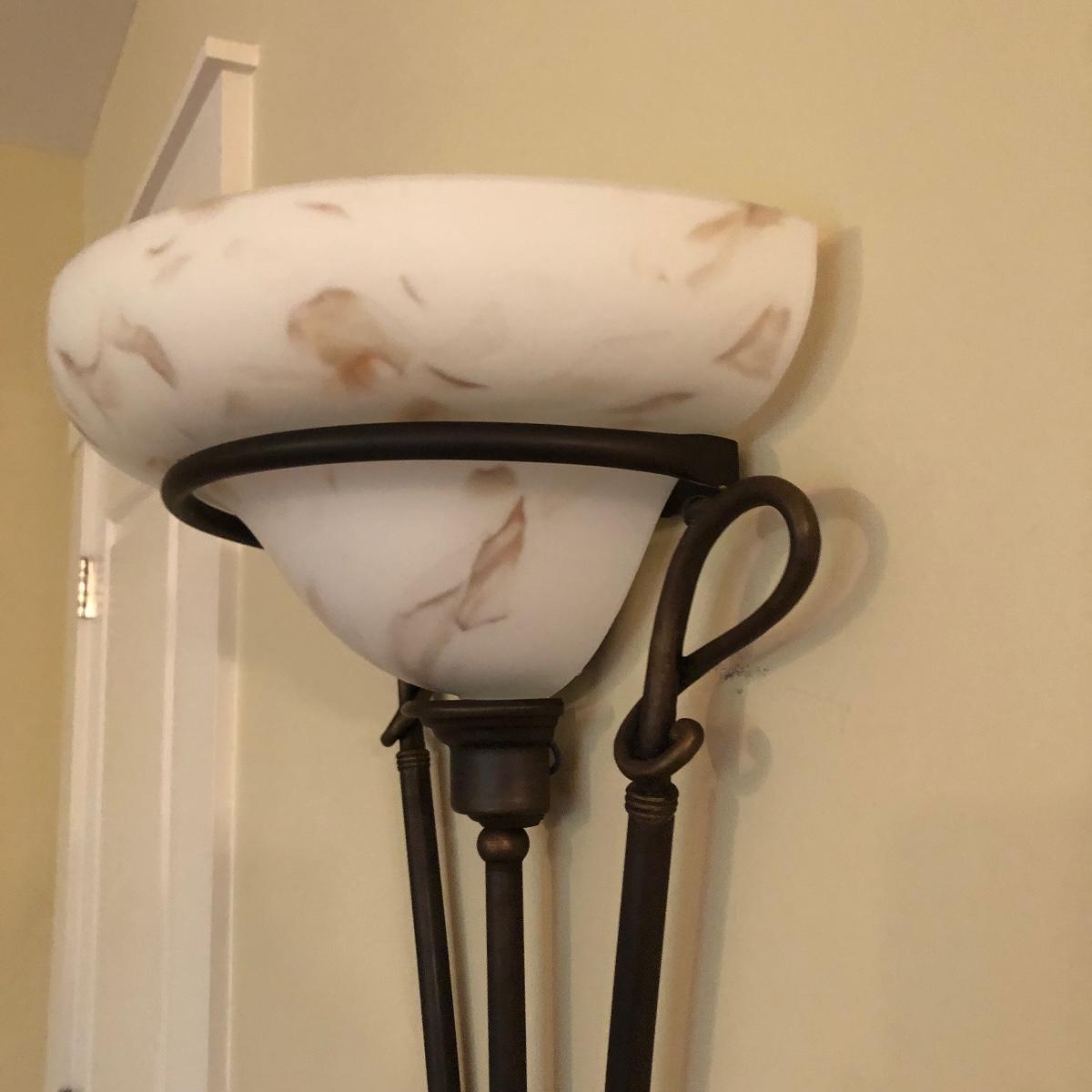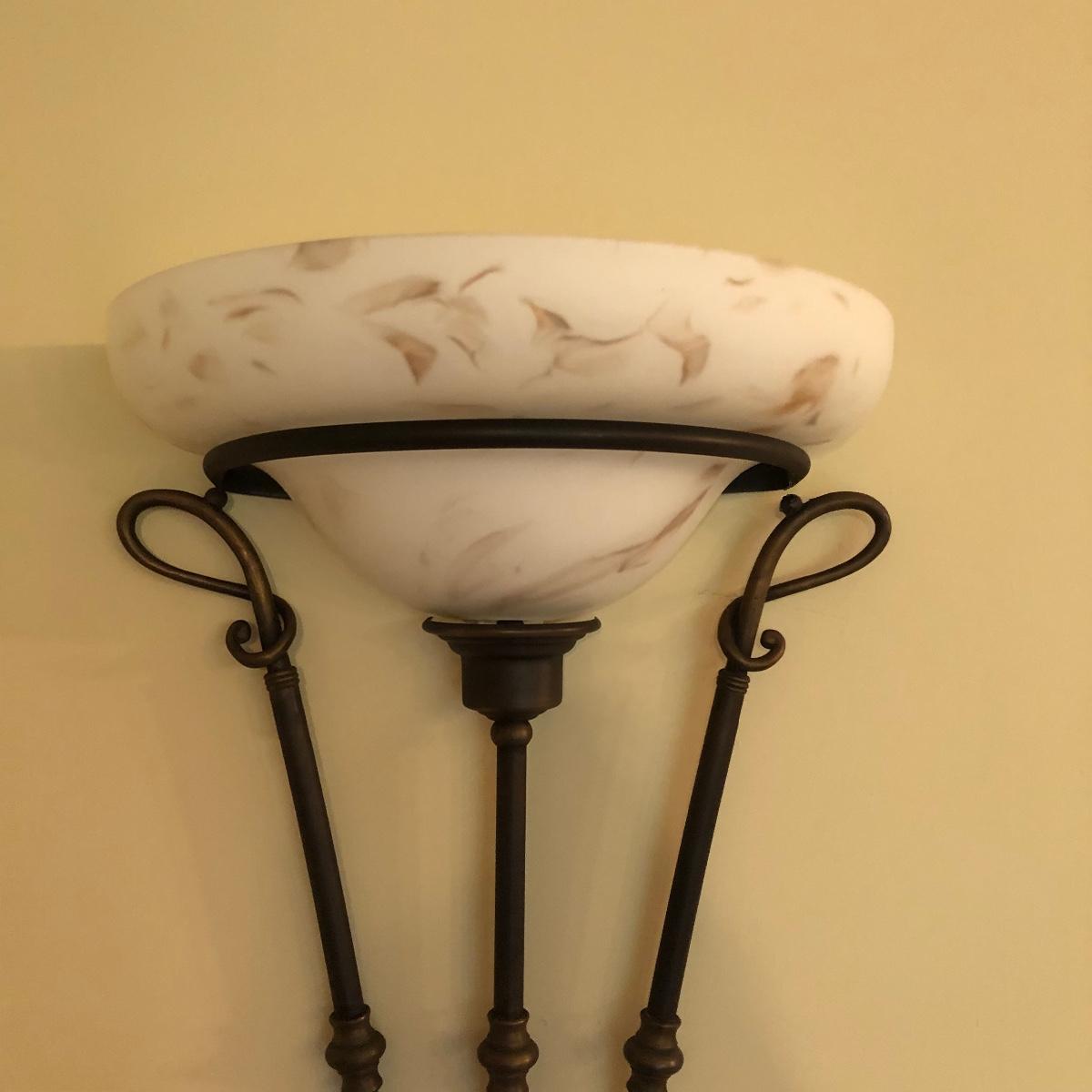 Lot includes wall mounted metal lamp with glass sconce style shade. One piece on right side is not attached and switch does not work, see pictures. You can turn it on and off by plugging in . Lamp measures 16.5” x 61” x 8.5”.