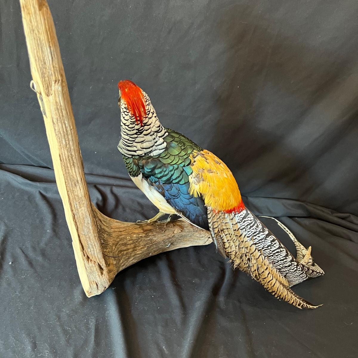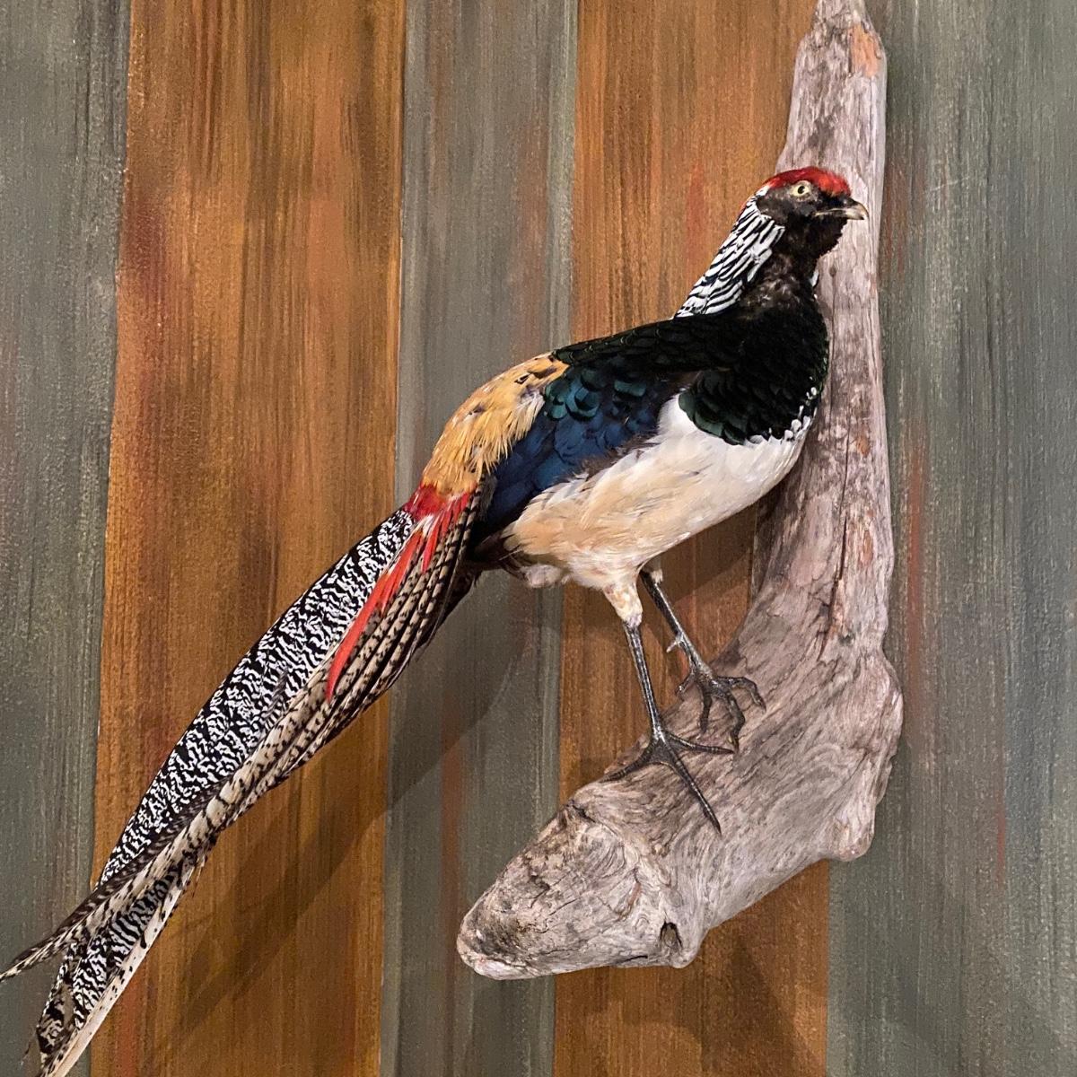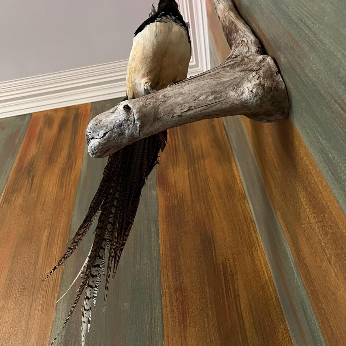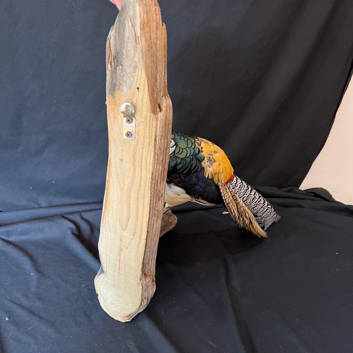 Vivid, brightly colored stuffed pheasant mounted on a wood branch. This piece hangs flat on the wall and stands off of the wall. It measures approximately 15” x 22” x 22”H.