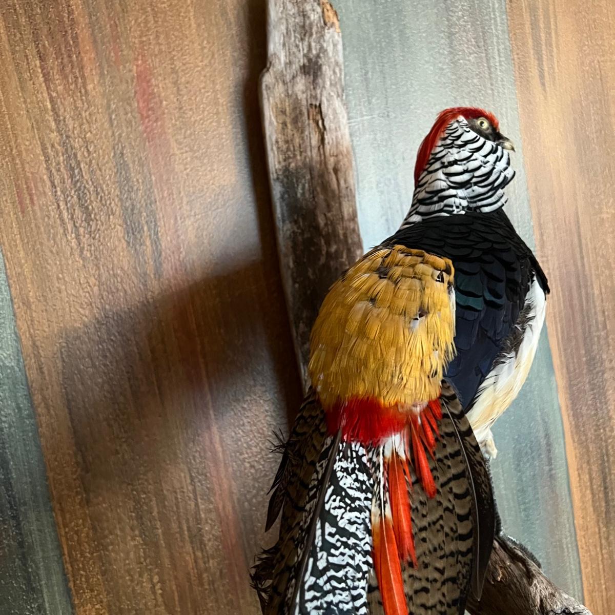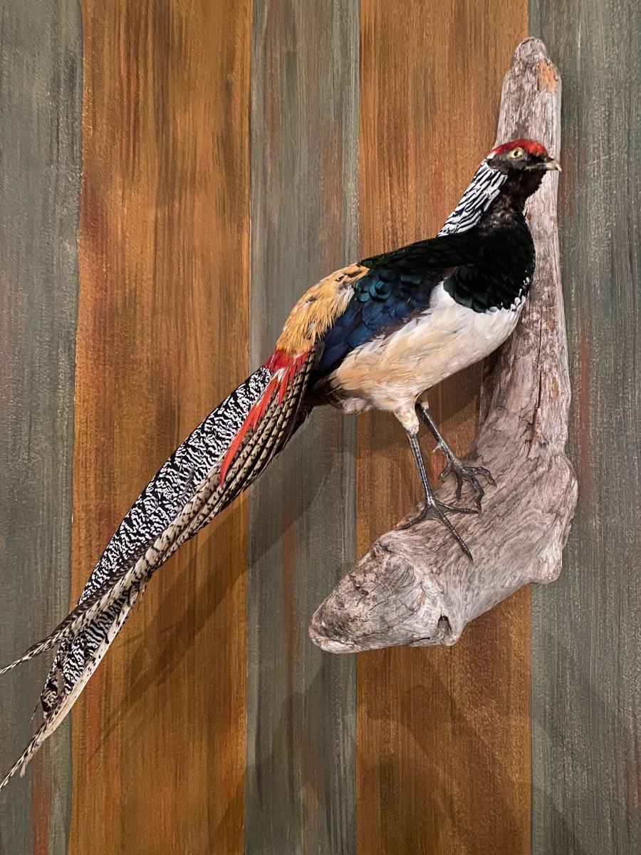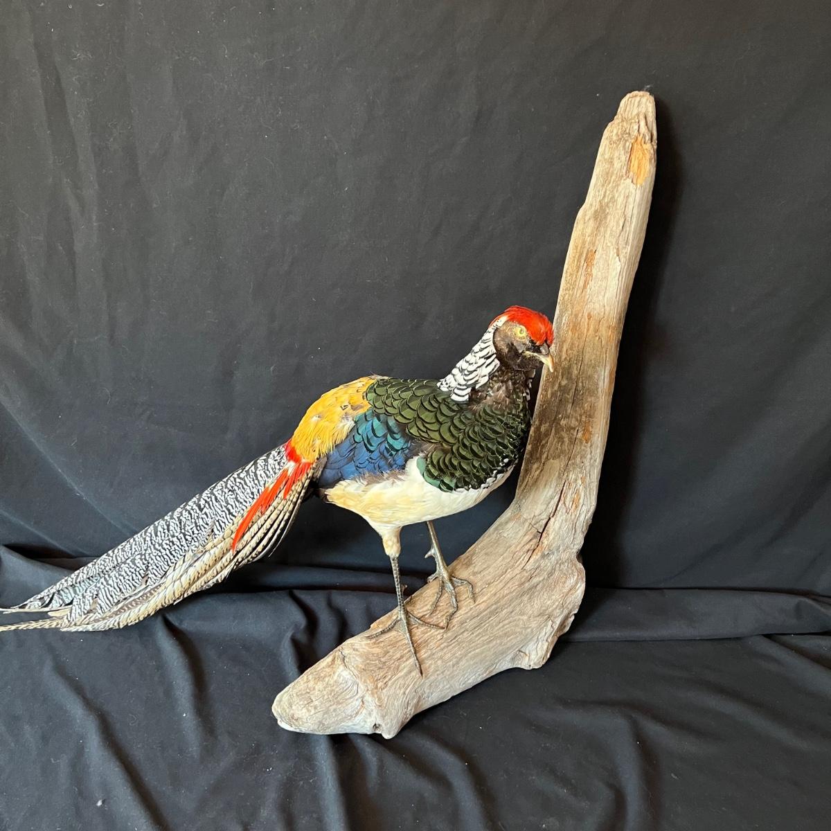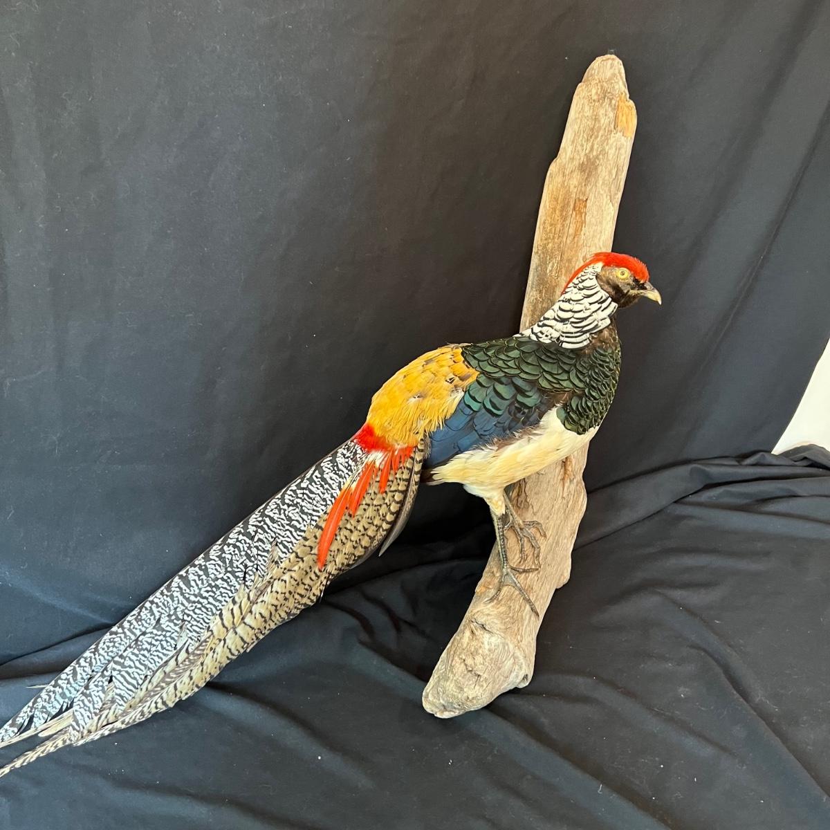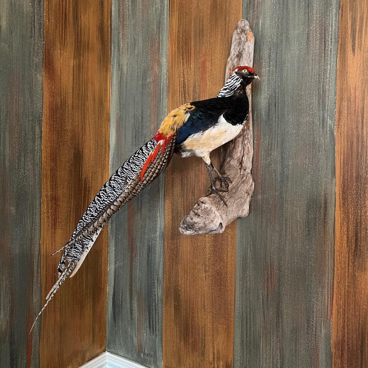 Vivid, brightly colored stuffed pheasant mounted on a wood branch. This piece hangs flat on the wall and stands off of the wall. It measures approximately 15” x 22” x 22”H.