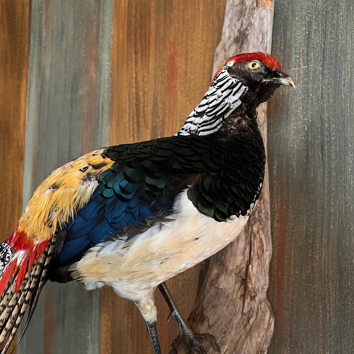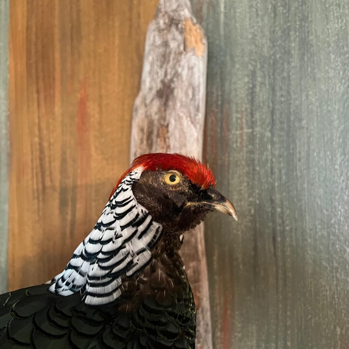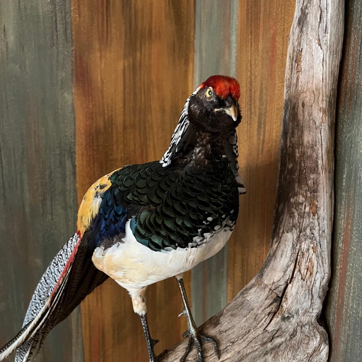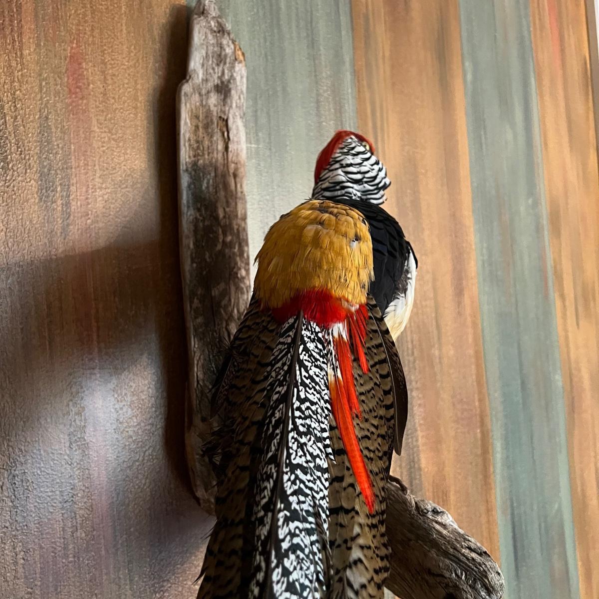 Vivid, brightly colored stuffed pheasant mounted on a wood branch. This piece hangs flat on the wall and stands off of the wall. It measures approximately 15” x 22” x 22”H.