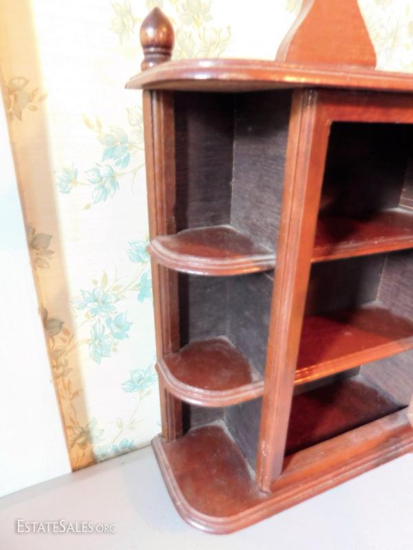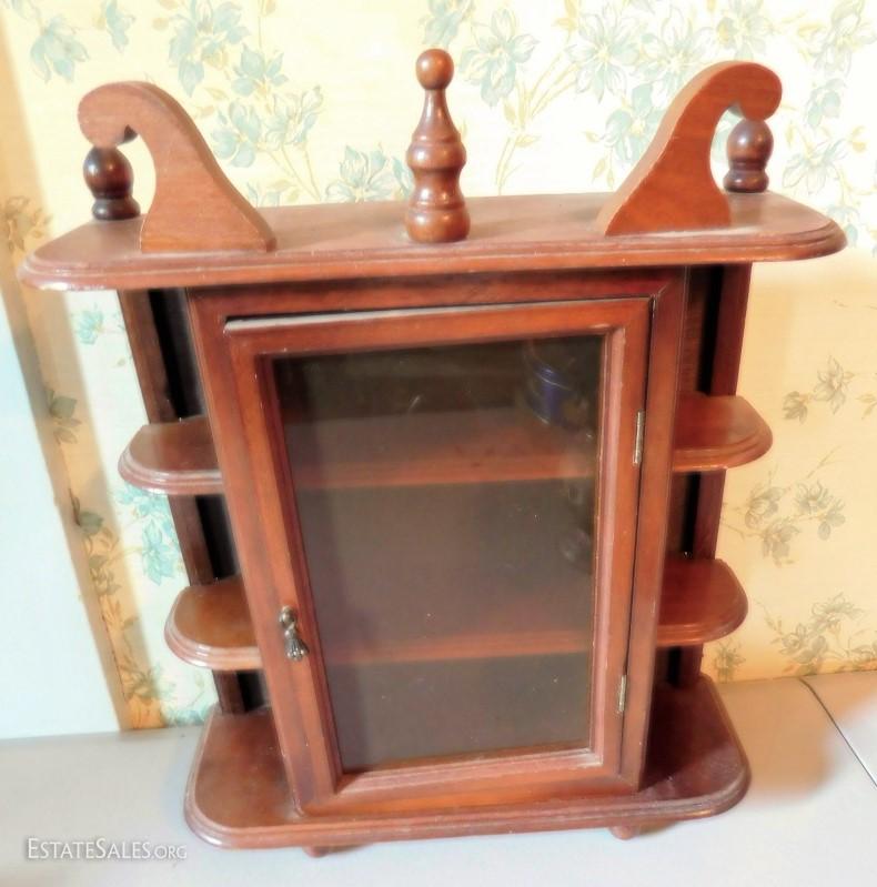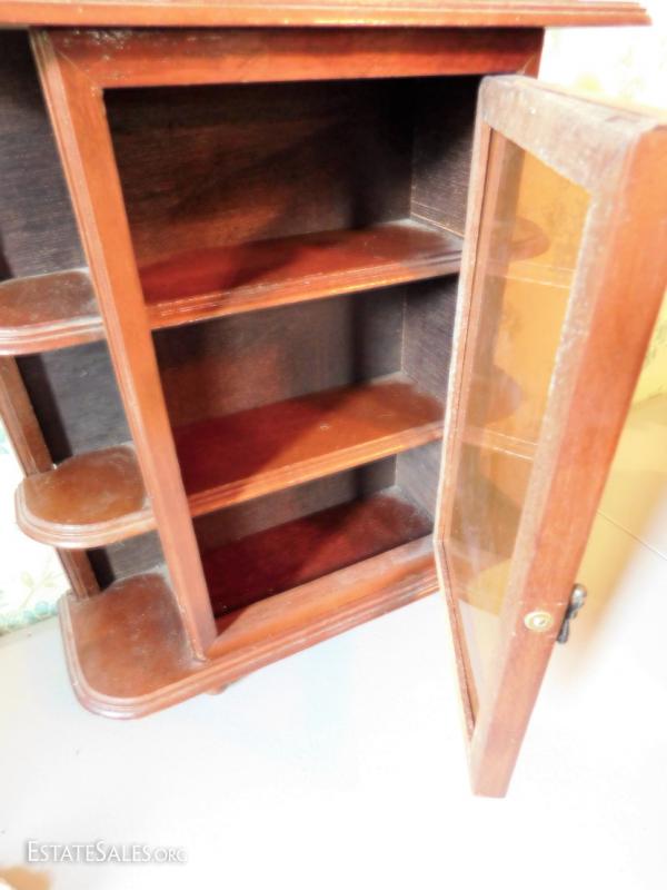 Oak knick knack cabinet with glass door and open side shelve. Small enough to fit nicely on top of the mantle or table or can be hung on wall.. In good condition.