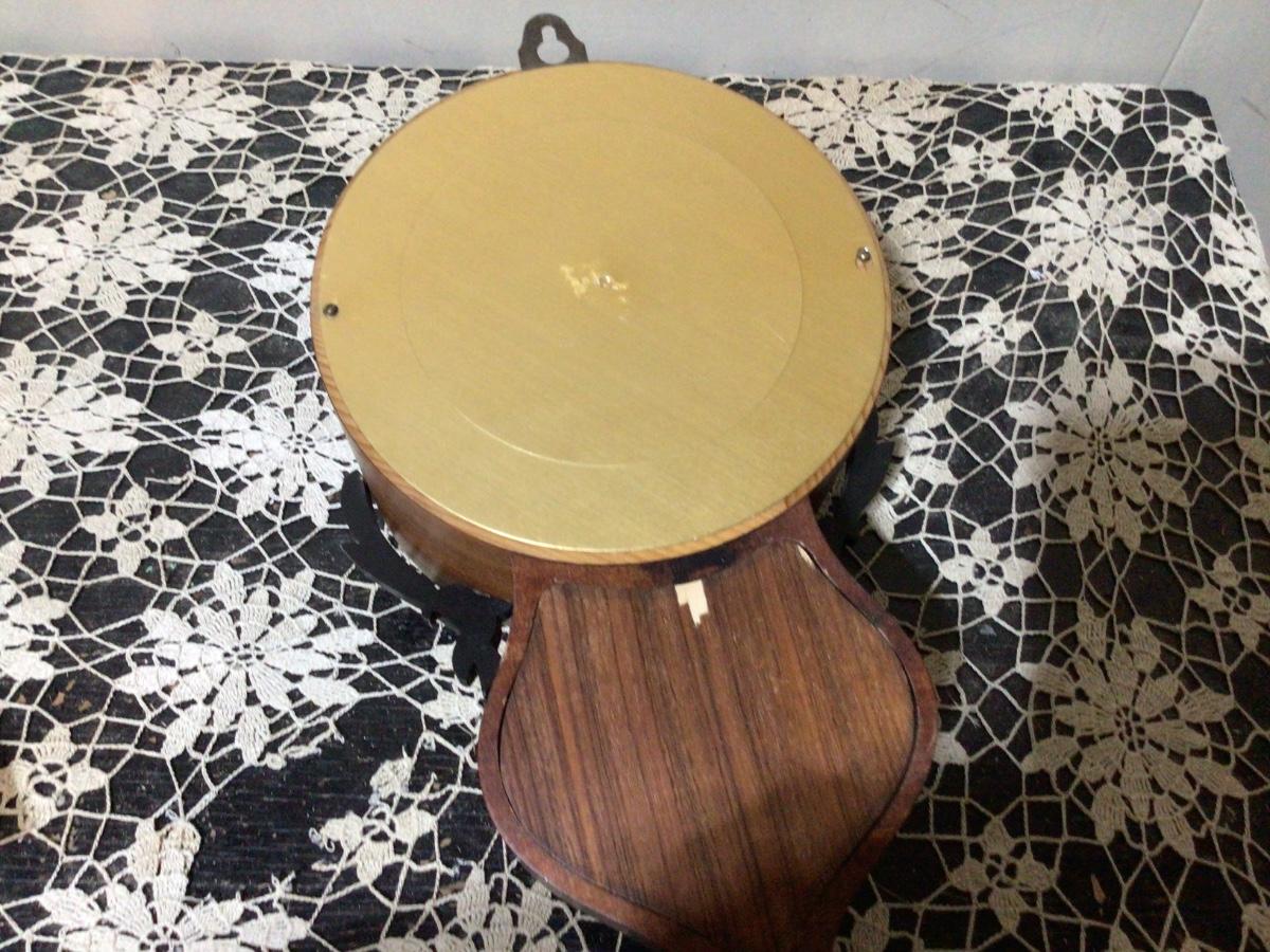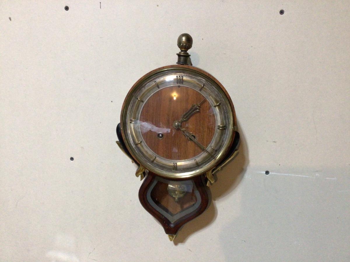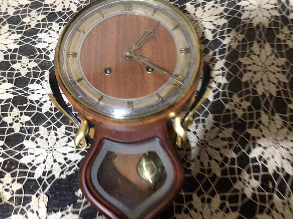 This is a Great Wall hanging pendulum clock. It is made of wood and metal and has pendulum, but no key. Currently is not working, but could just need a cleaning.
