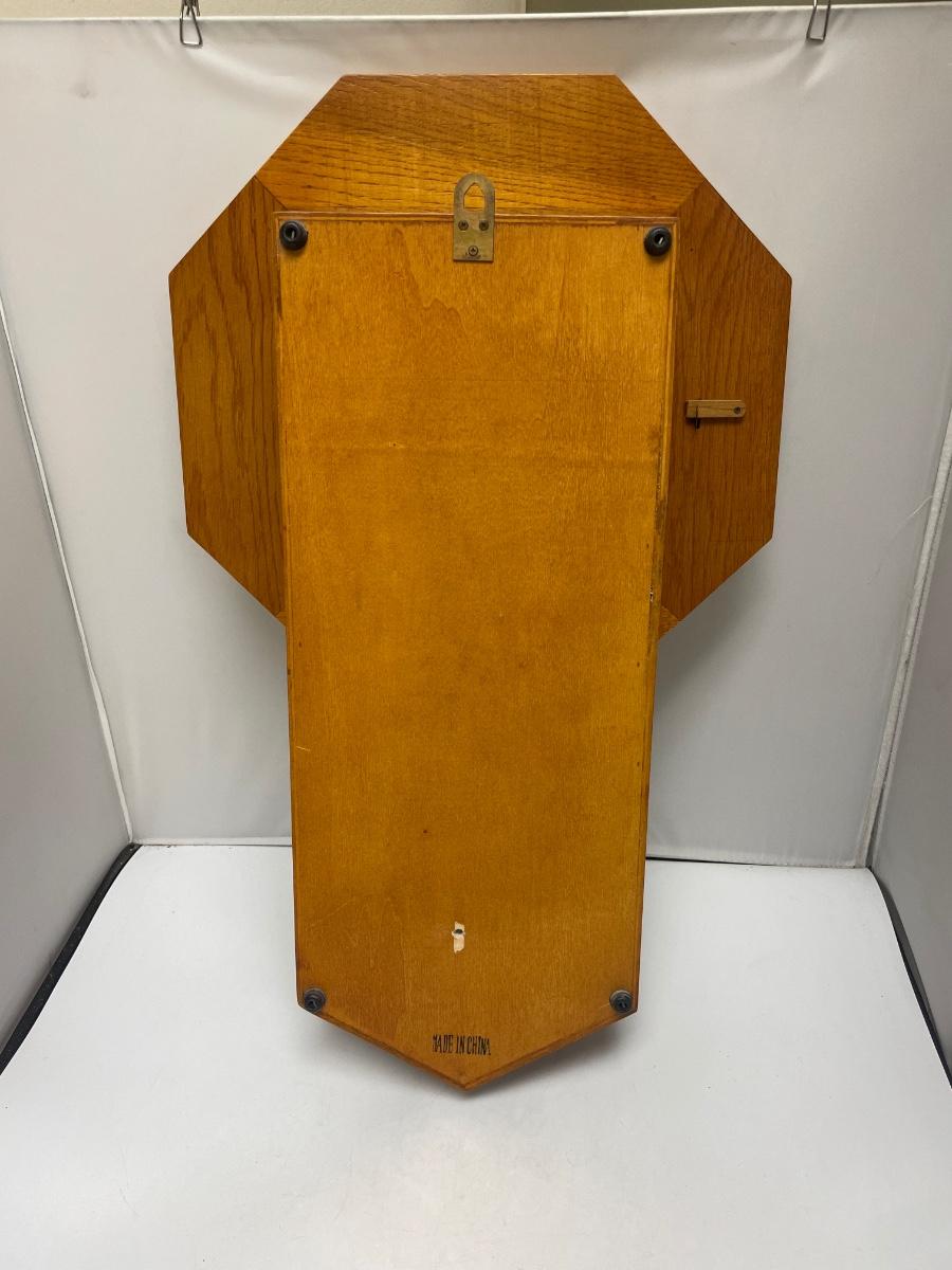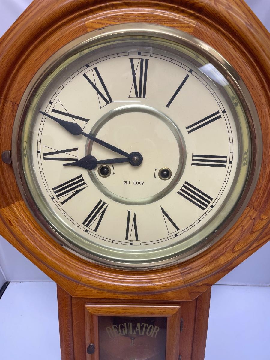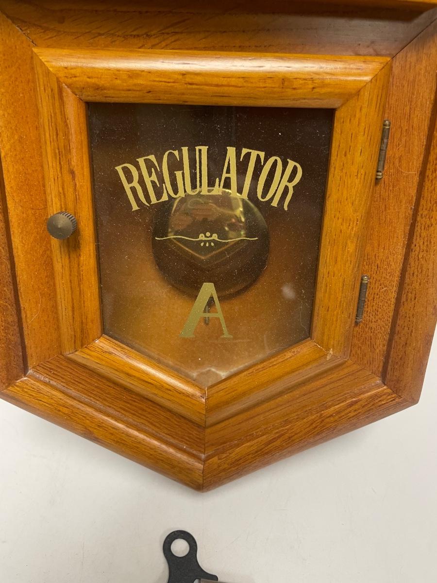 Wall Clock, pendulum style, Regulator A. Has key. Made in China. Upper clock face area is approx 14" across. Overall height is approx 24".