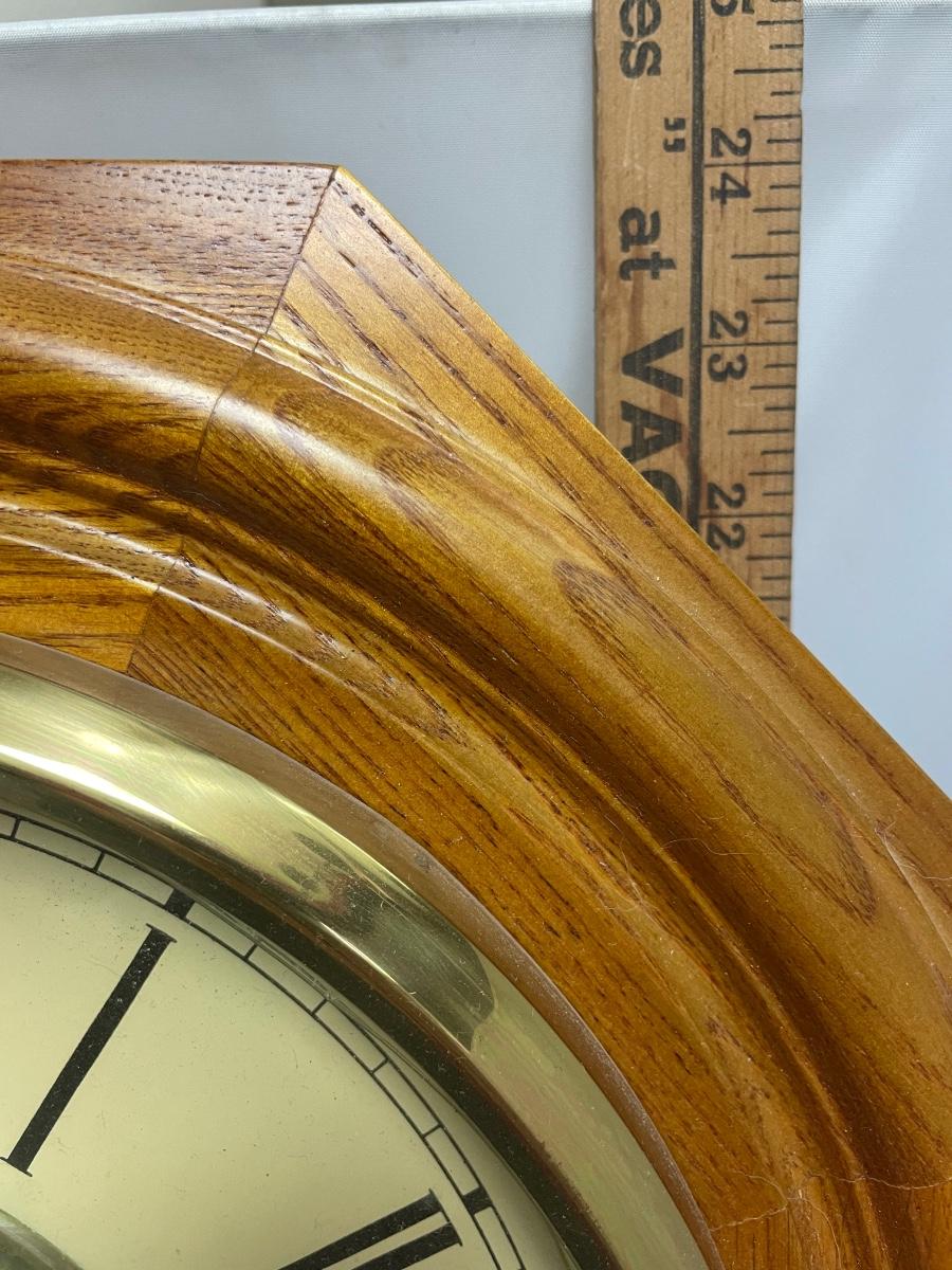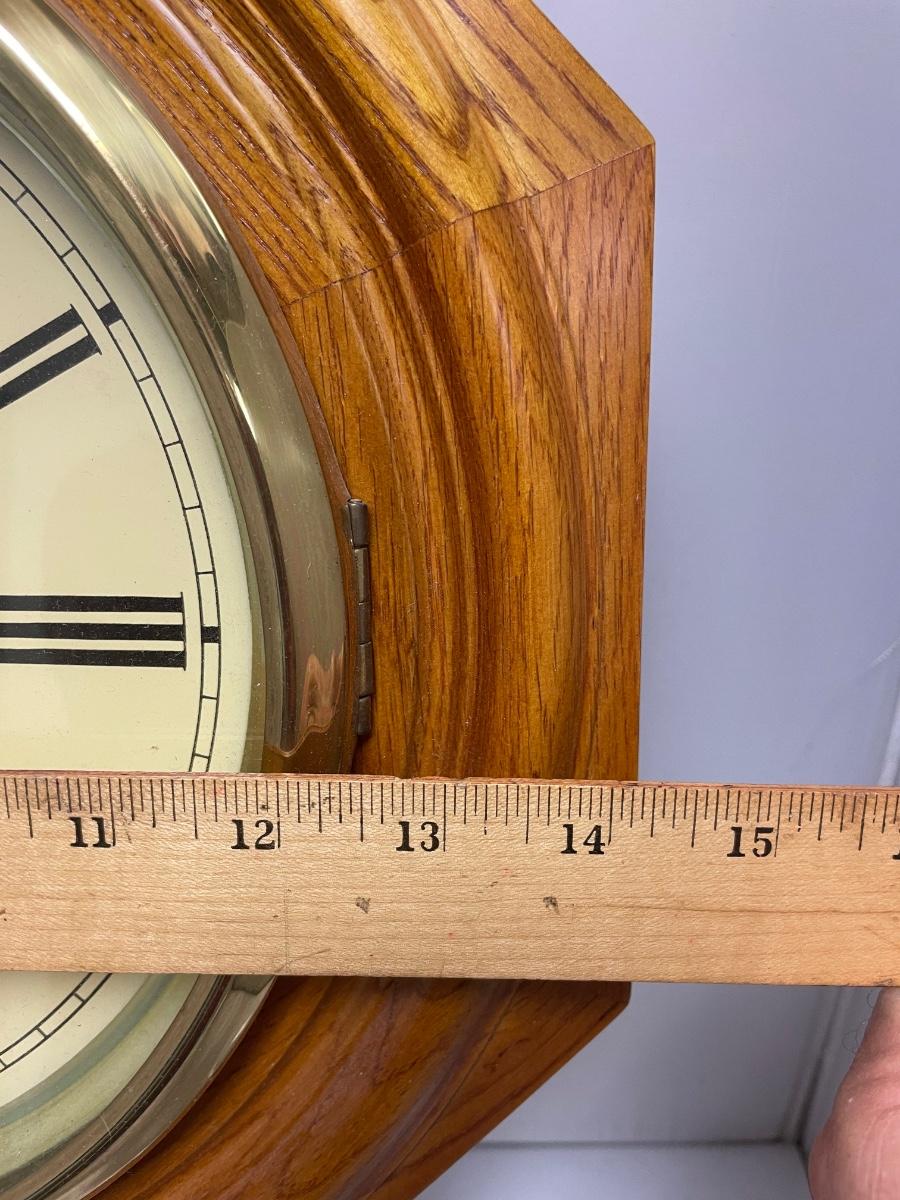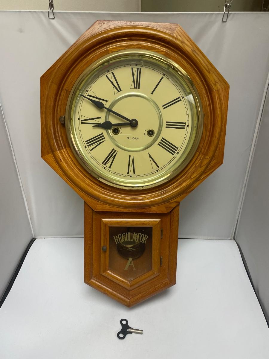Wall Clock, pendulum style, Regulator A. Has key. Made in China. Upper clock face area is approx 14" across. Overall height is approx 24".
