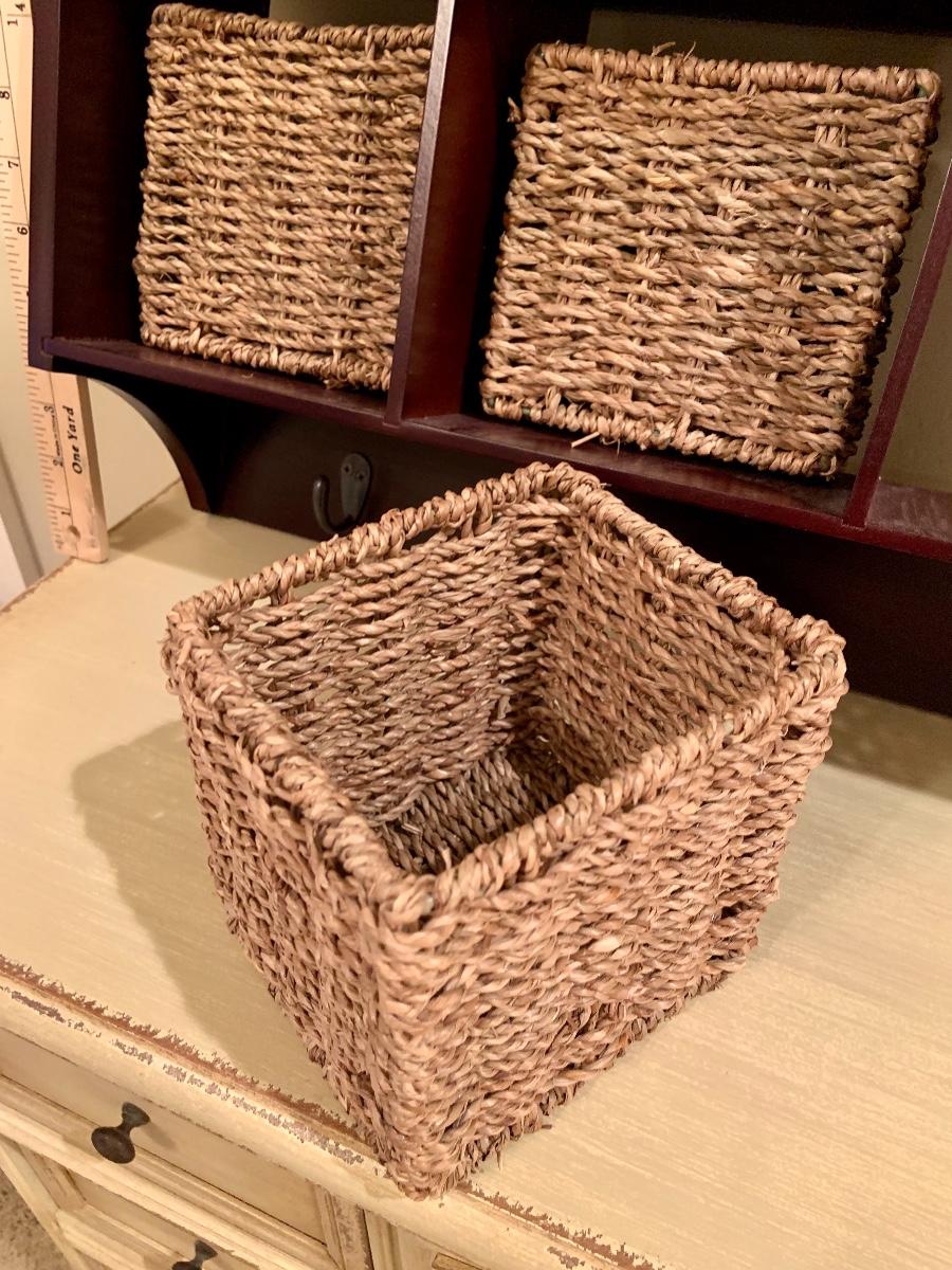 Wall storage with seagrass baskets and hooks