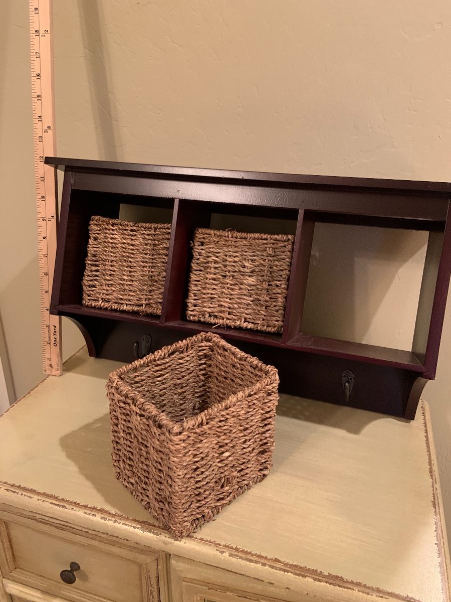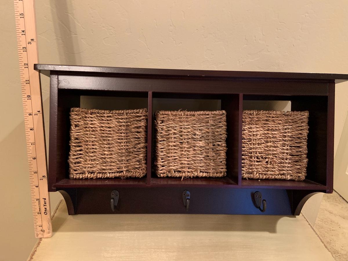 Wood shelf with hooks and seagrass baskets for storage.