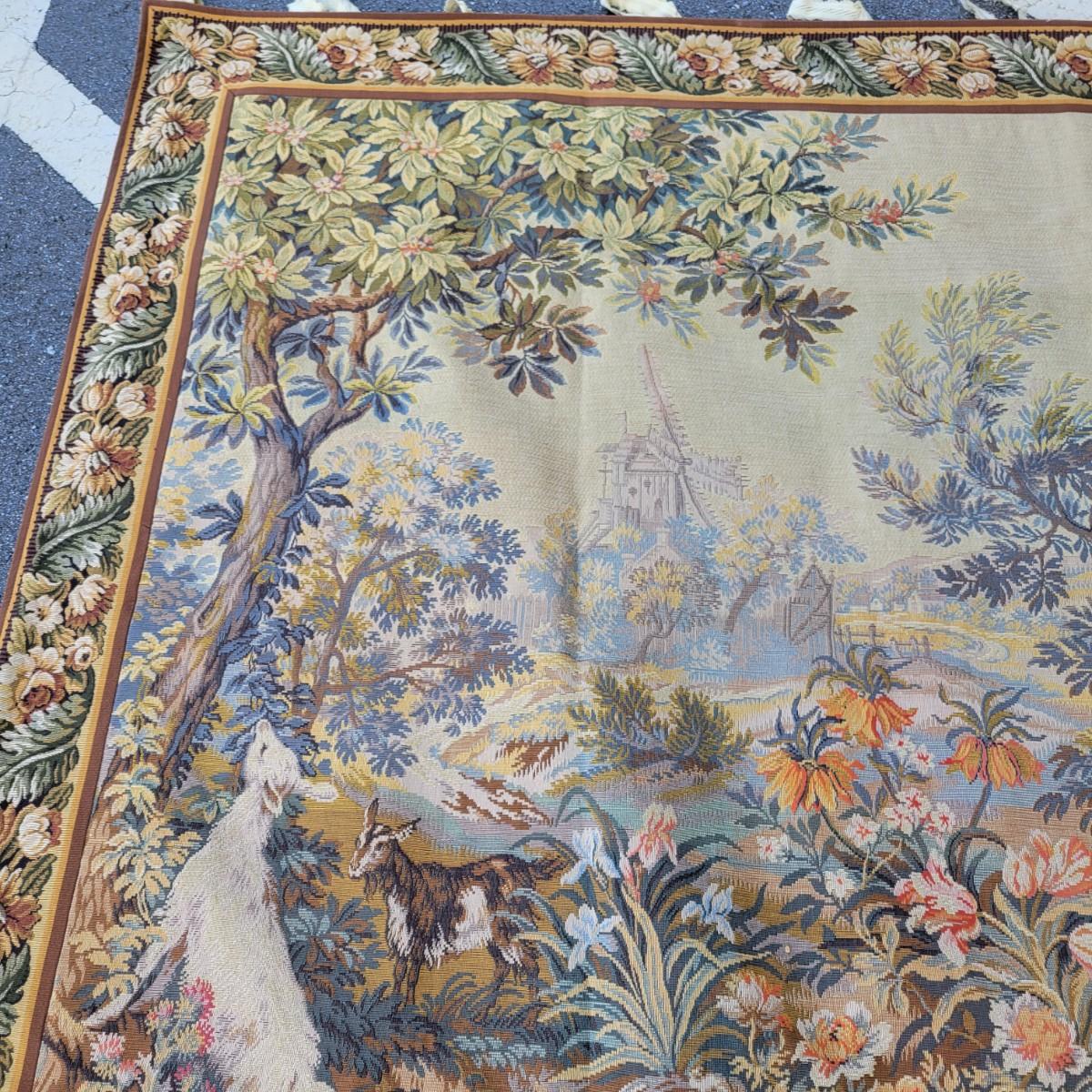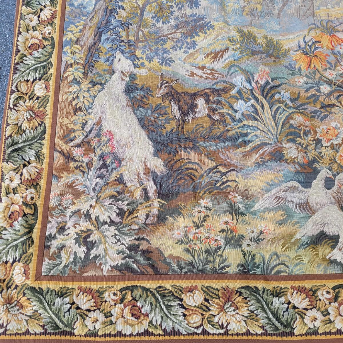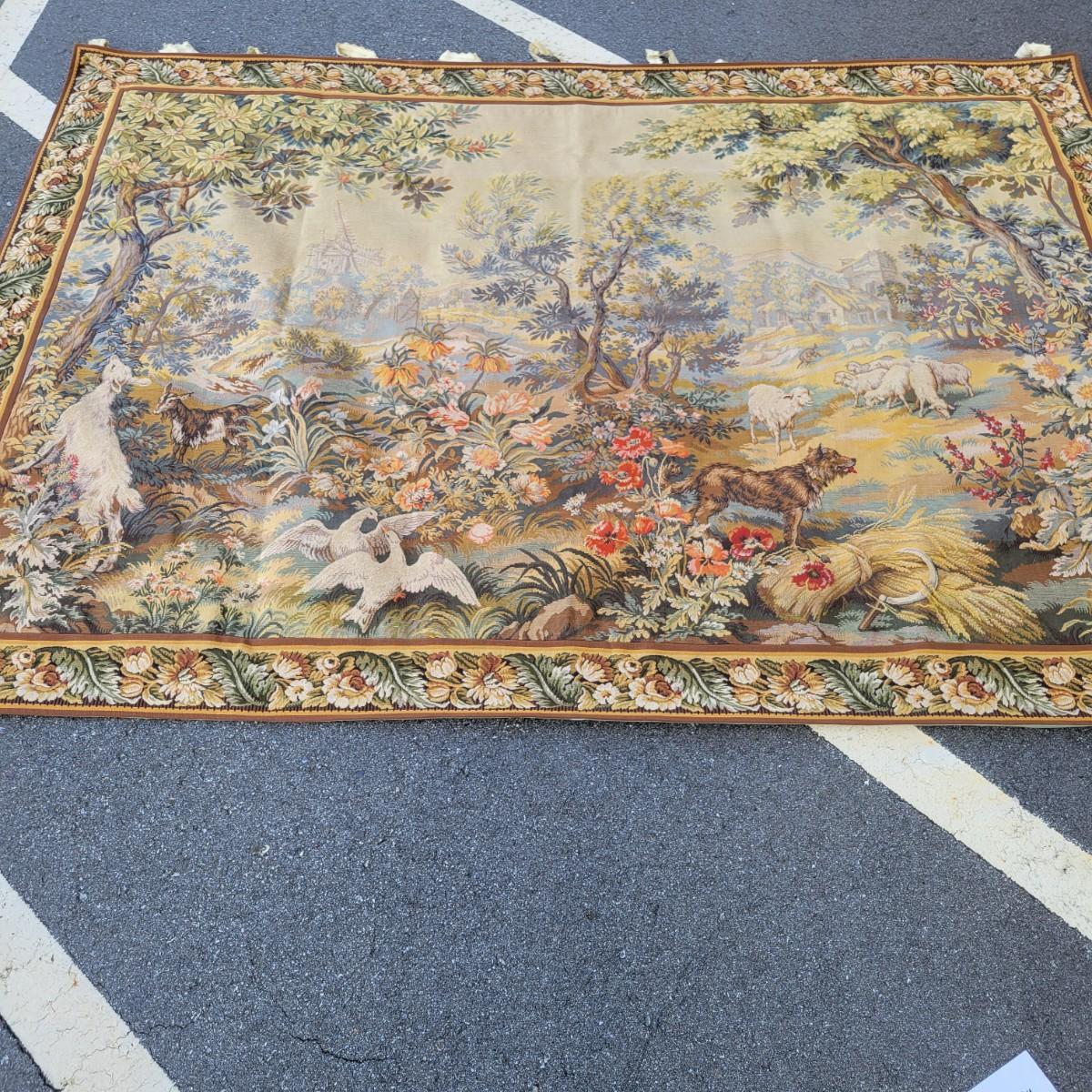 A large horizontal wall tapestry with goats, birds and dogs in good condition. Tapestry has 12 hangers across the top of it and shows no damage. Measures approximately 84" x 64" Shipping available