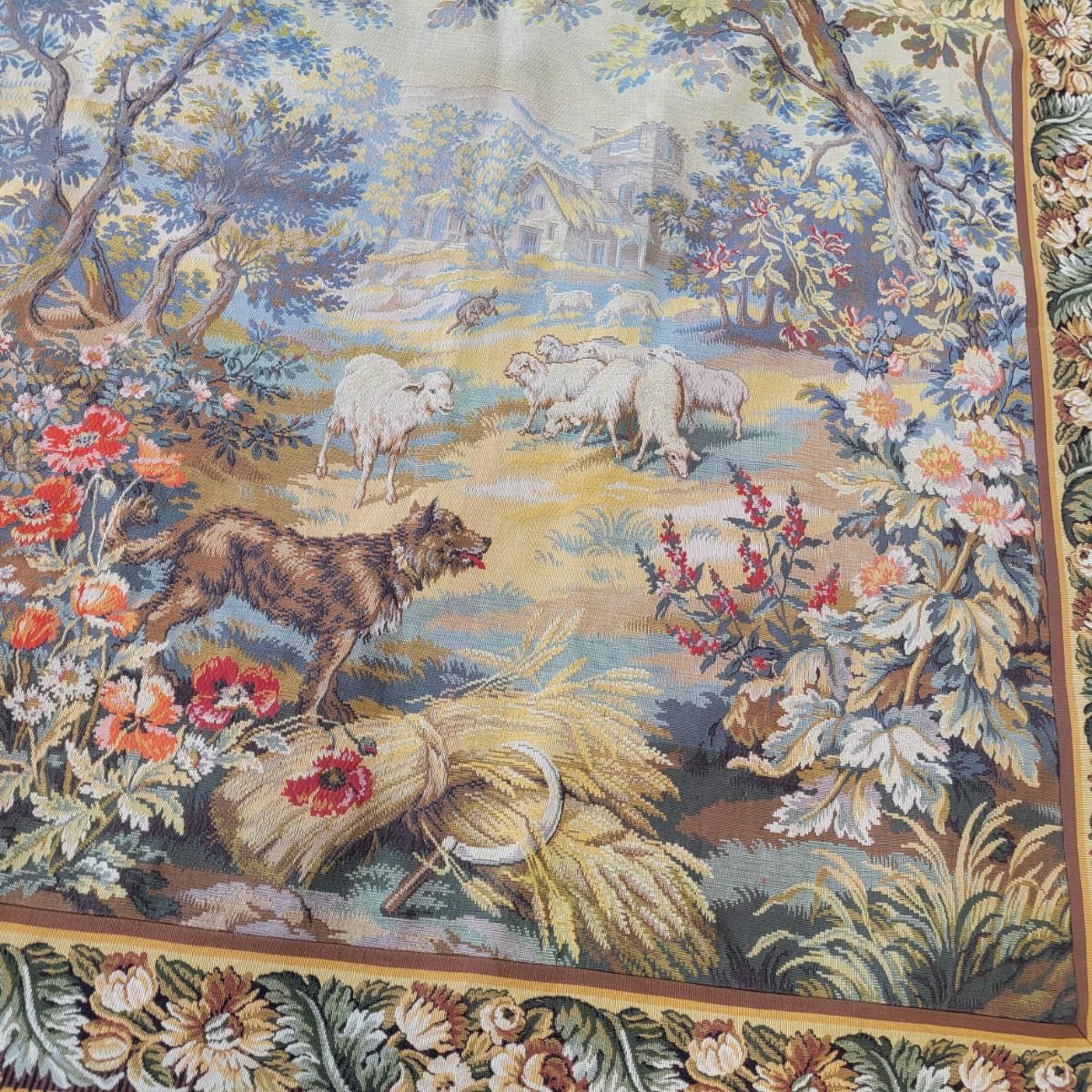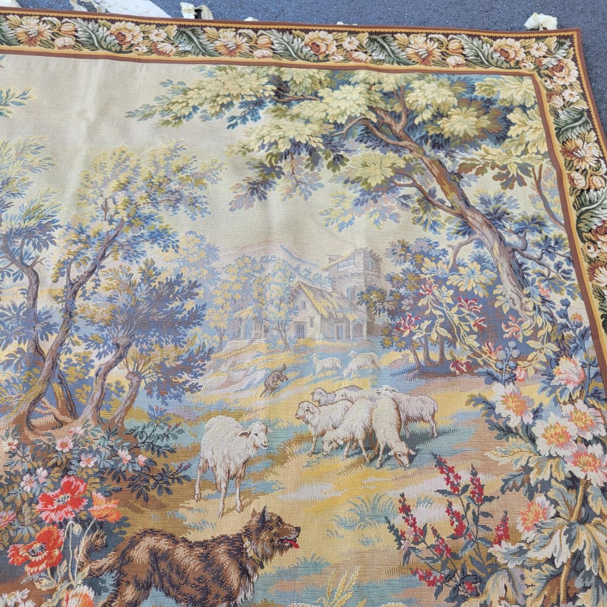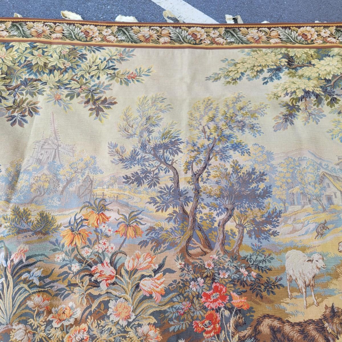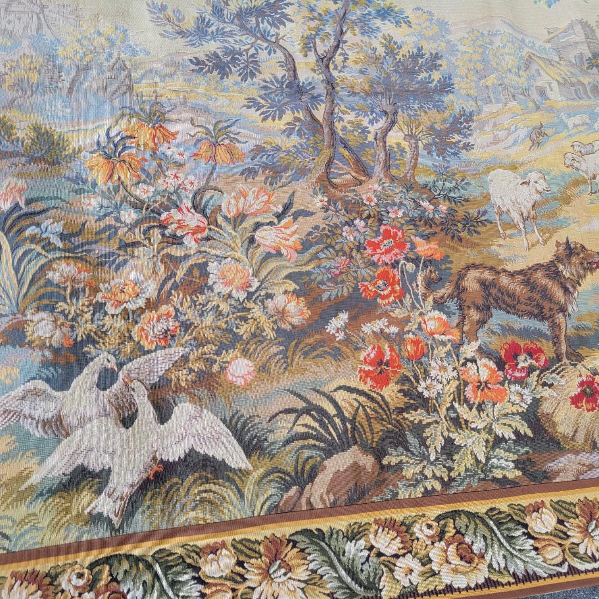 A large horizontal wall tapestry with goats, birds and dogs in good condition. Tapestry has 12 hangers across the top of it and shows no damage. Measures approximately 84" x 64" Shipping available