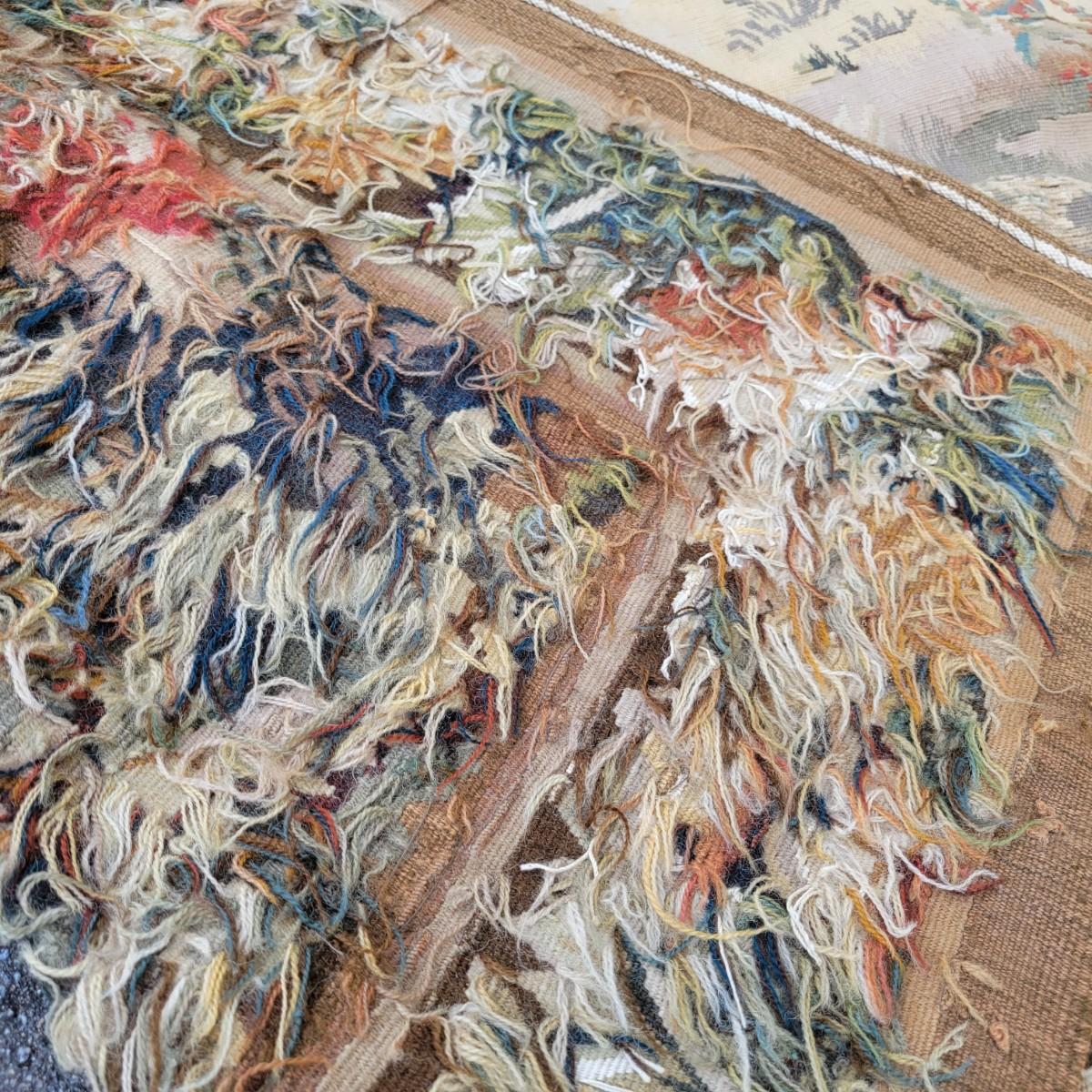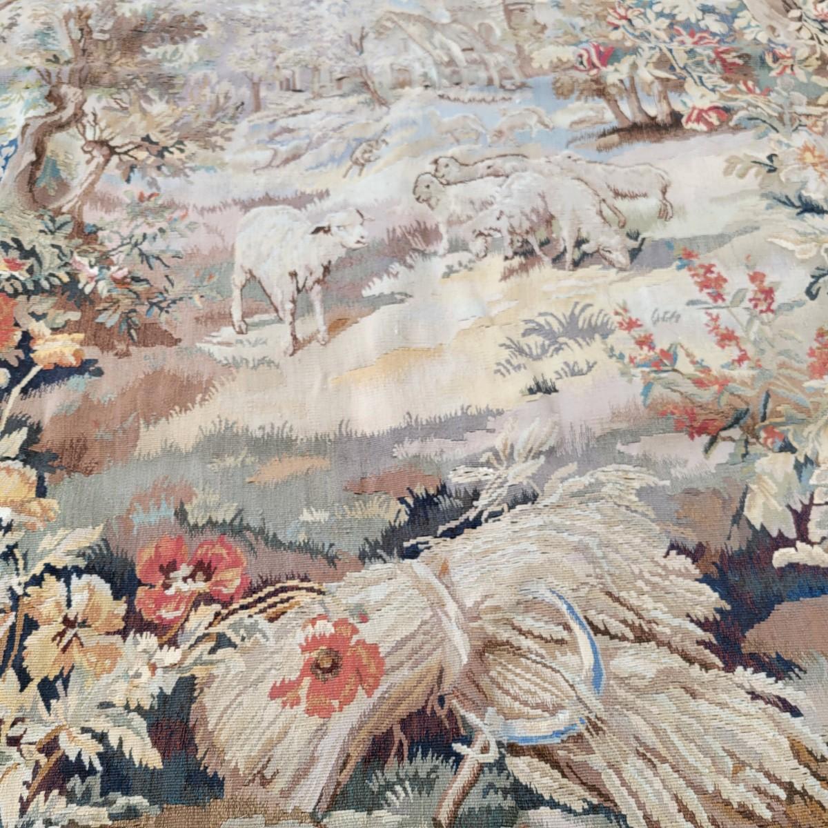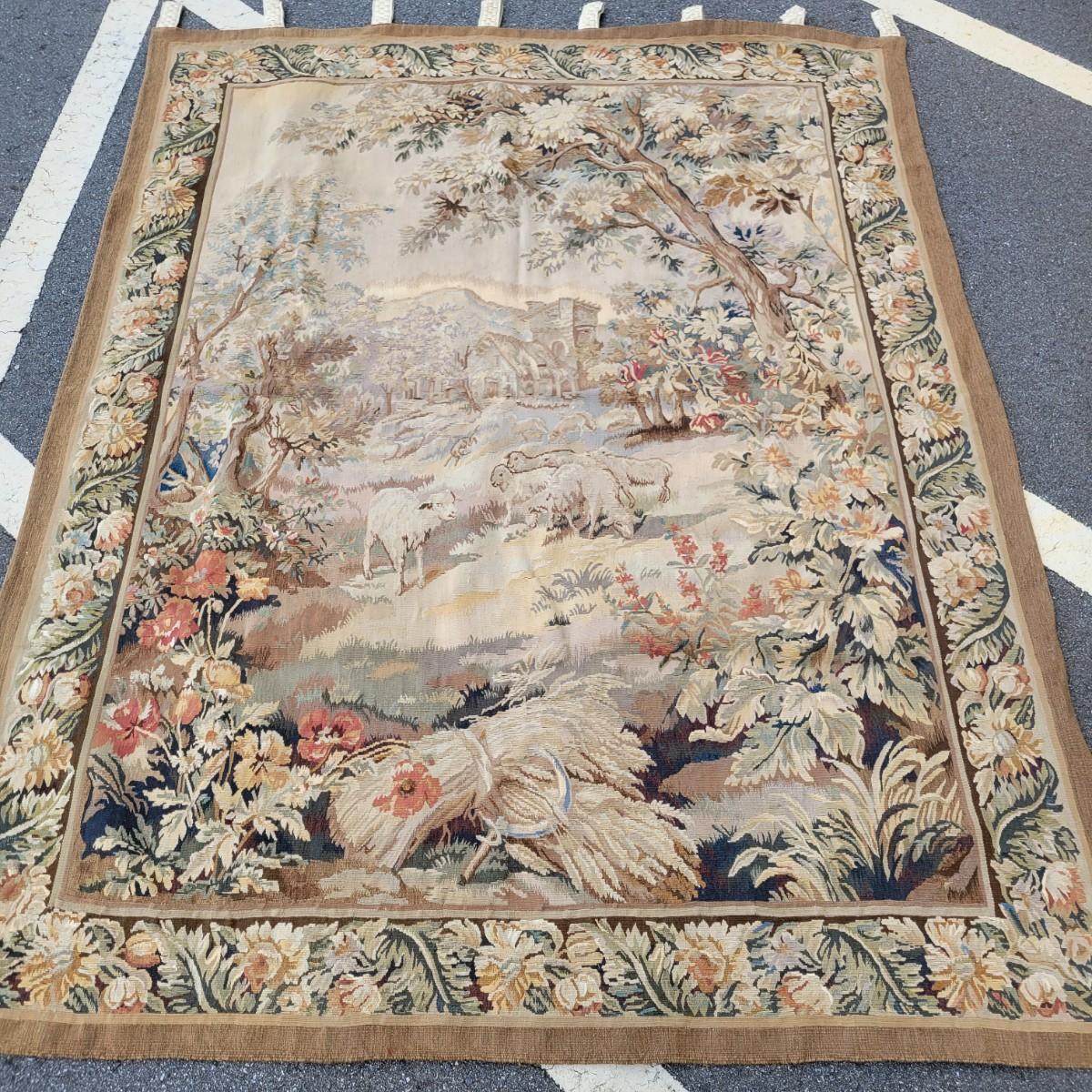 A large wall tapestry in good condition with no notable damage. Tapestry features a serene country side setting with lambs in a field. Tapestry measures approximately 58" x 78" and has 8 hangers at the top. Shipping available