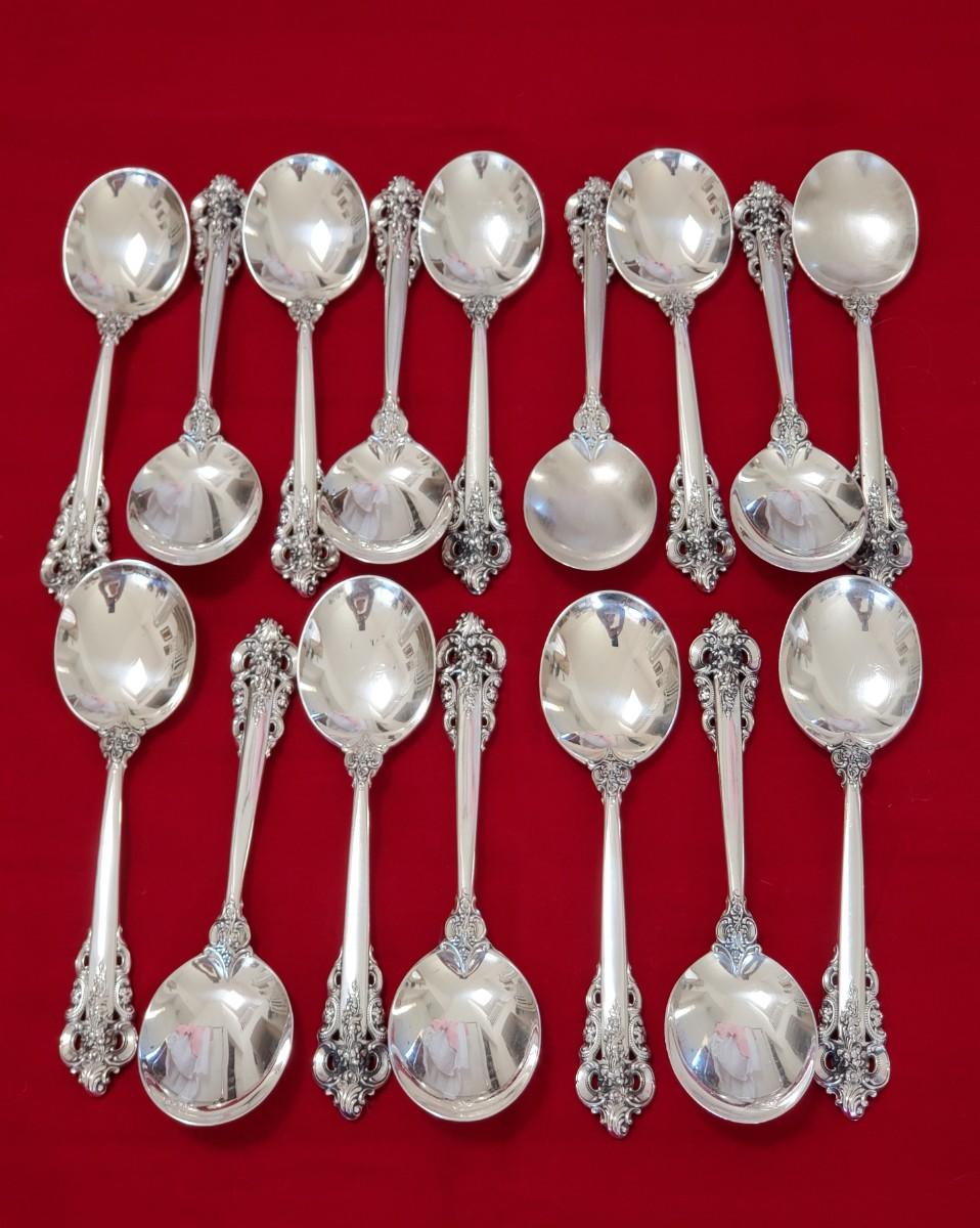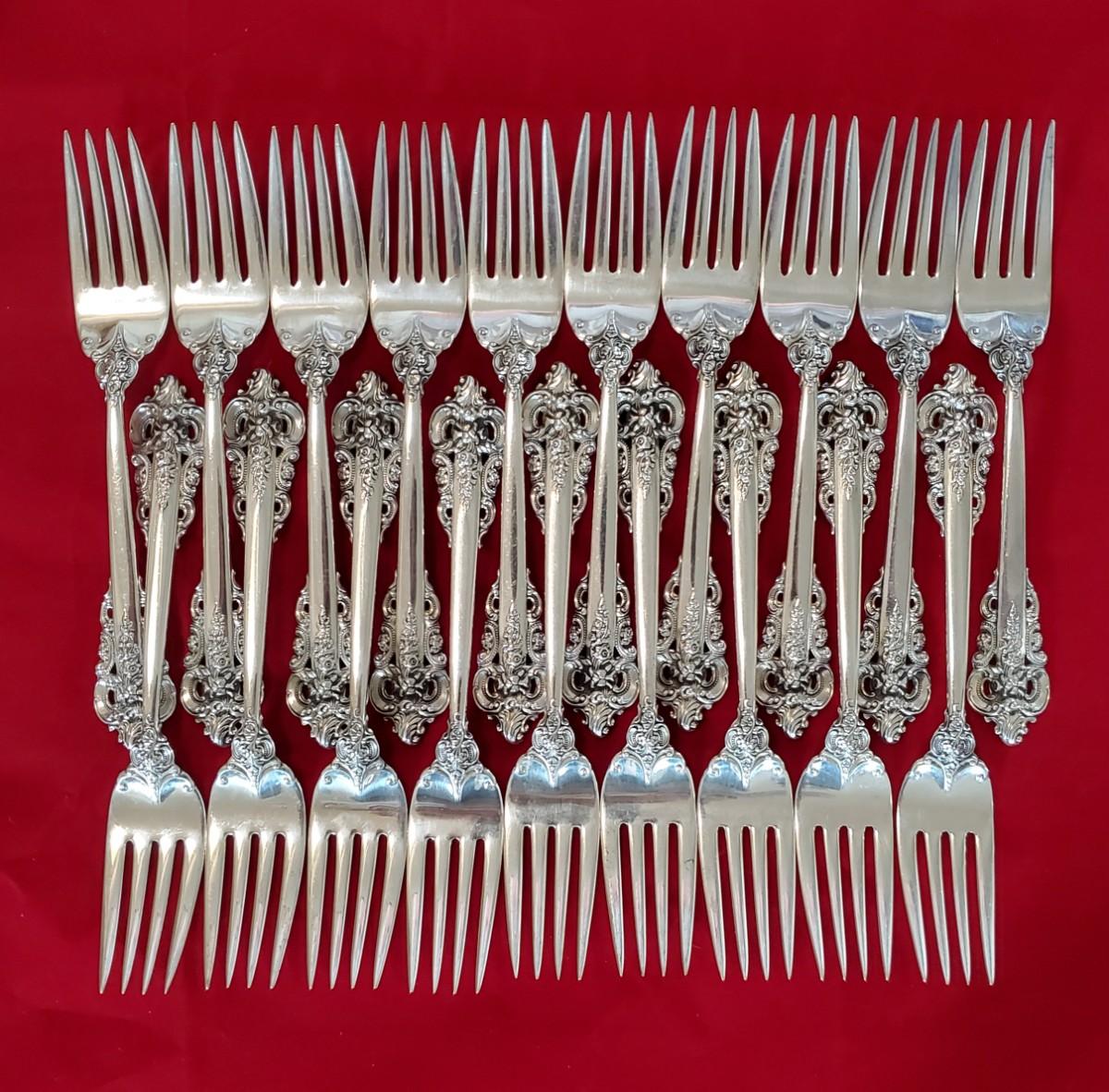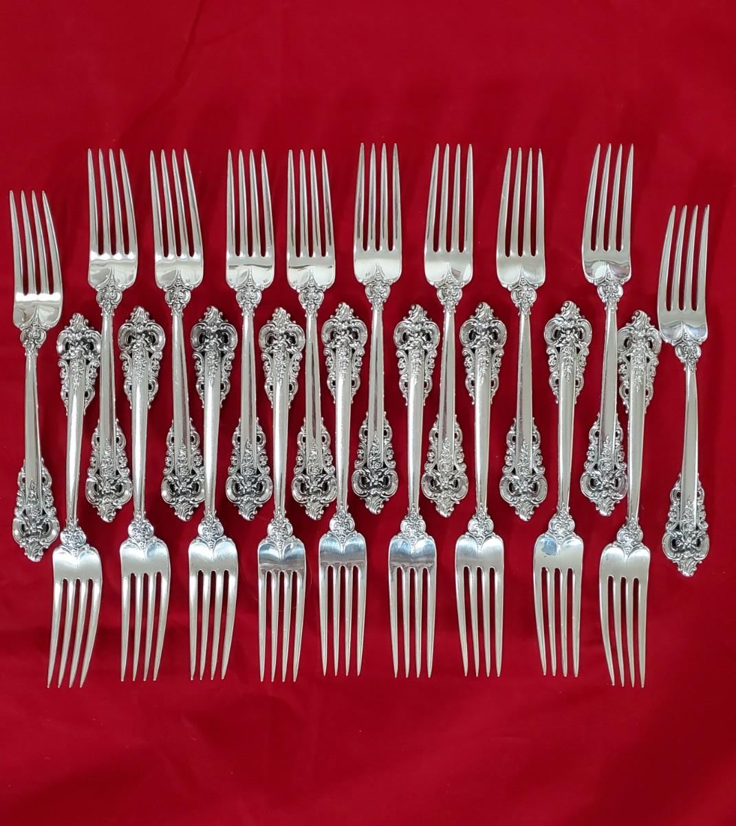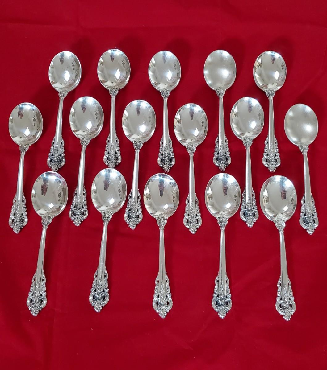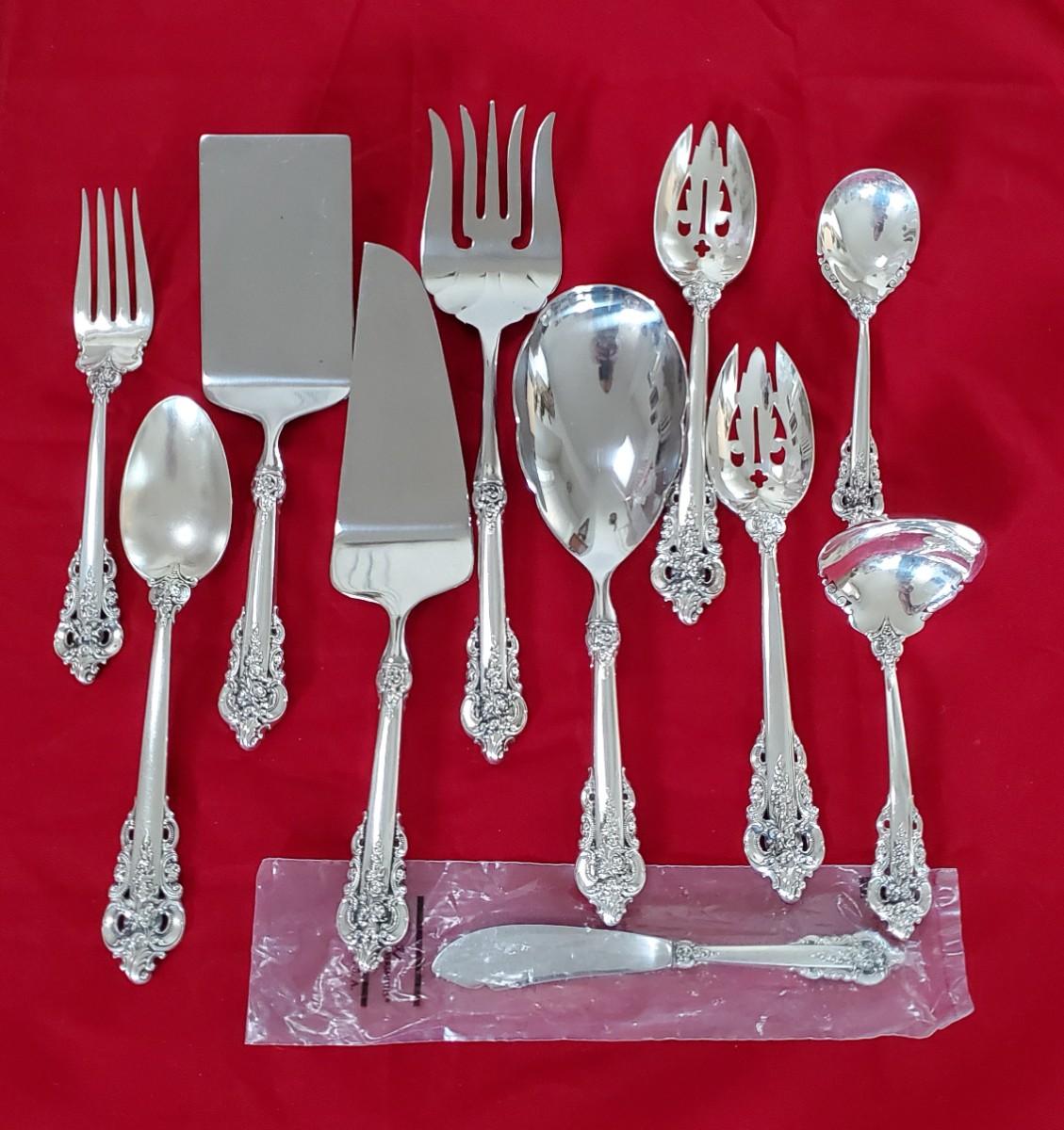 16 Round cream soup spoons; 10 Oval soup spoons; 21 Teaspoons; 12 Iced tea spoons; 11 Demitasse spoons; 12 Fish Knives (stainless blade); 12 Fish forks (stainless blade); 19 dinner Forks; 22 Dinner knives (stainless blade); 19 Salad forks; 12 Cocktail/seafood forks; 1 8 3/4" serving spoon, 2 - 8 3/4" Pierced serving spoons; 1 Sugar spoon; 1 Master butter knife; 1 - 8 1/4" Medium cold meat serving fork; 1 Large stainless tine cold meat serving fork; 1 - 11" pie and cake server (stainless blade); 1 - 5 7/8" Cream Ladle; 1 Large stainless bowl rice serving spoon; 1 Lasagna server (stainless blad)