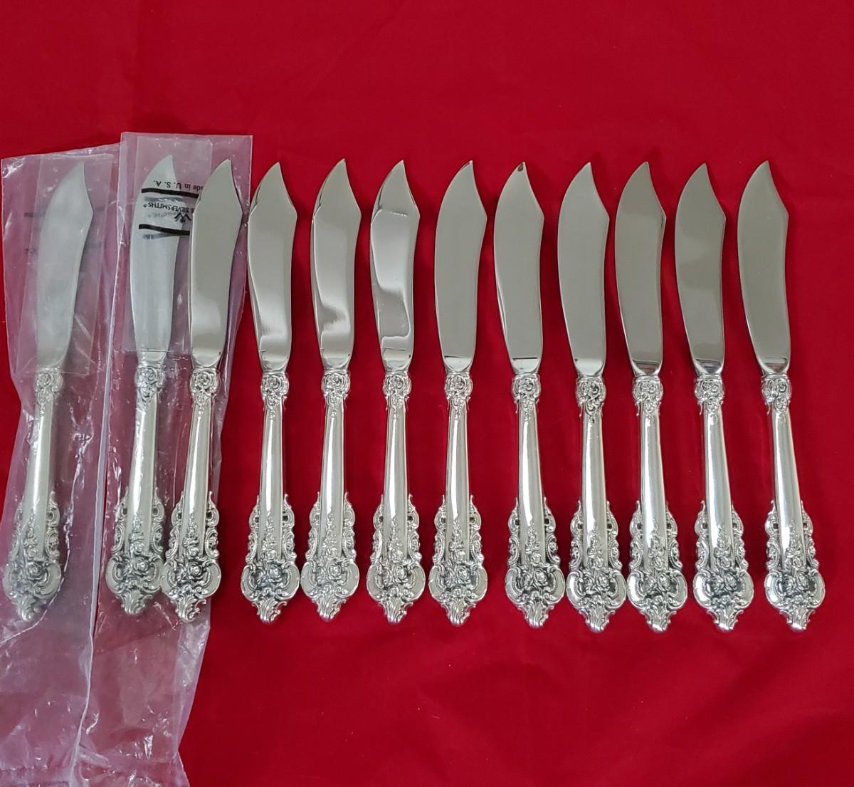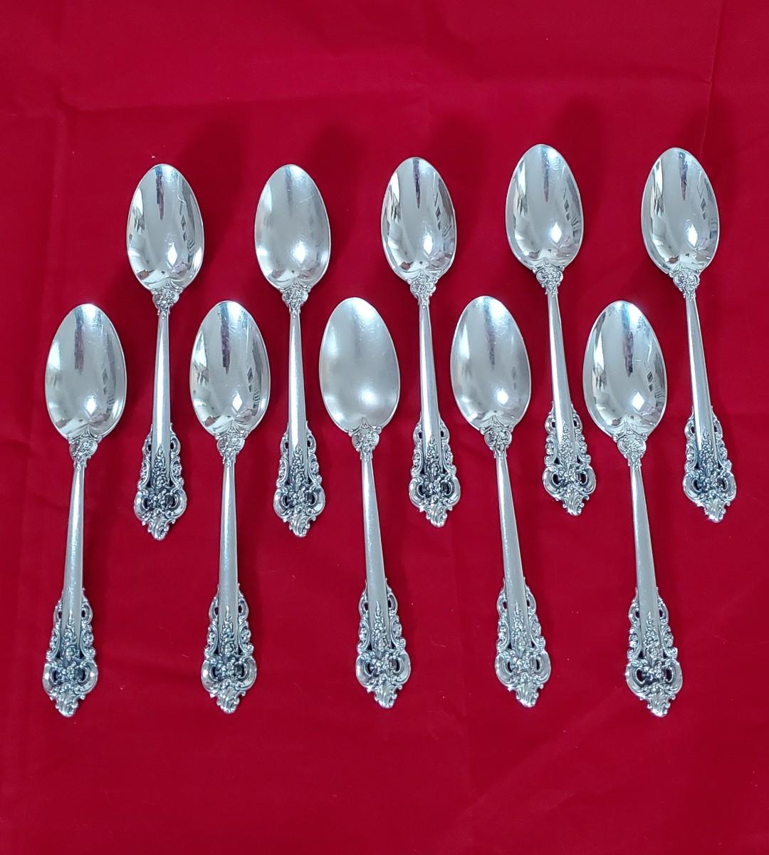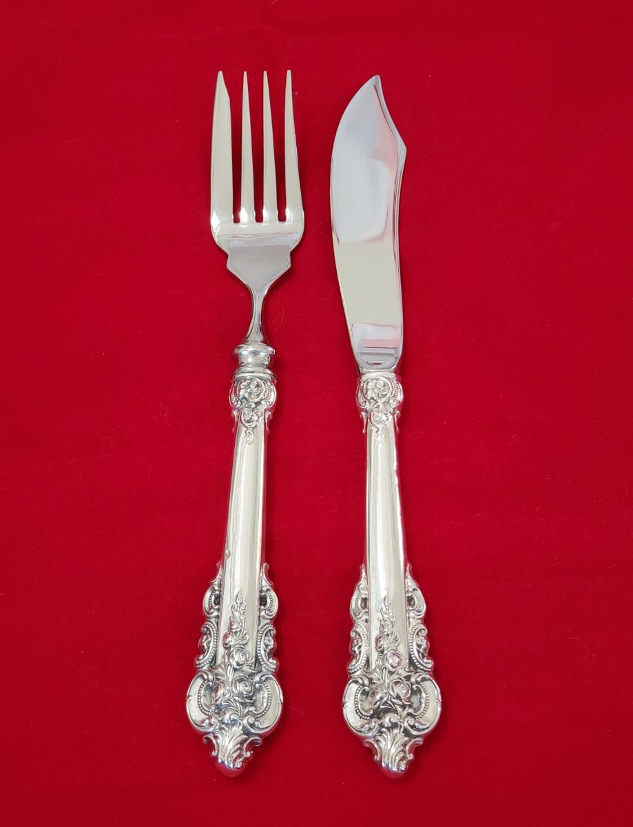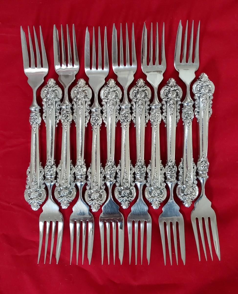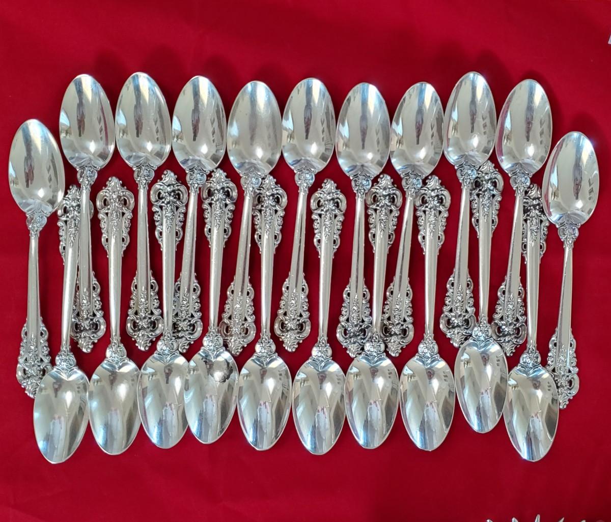 16 Round cream soup spoons; 10 Oval soup spoons; 21 Teaspoons; 12 Iced tea spoons; 11 Demitasse spoons; 12 Fish Knives (stainless blade); 12 Fish forks (stainless blade); 19 dinner Forks; 22 Dinner knives (stainless blade); 19 Salad forks; 12 Cocktail/seafood forks; 1 8 3/4" serving spoon, 2 - 8 3/4" Pierced serving spoons; 1 Sugar spoon; 1 Master butter knife; 1 - 8 1/4" Medium cold meat serving fork; 1 Large stainless tine cold meat serving fork; 1 - 11" pie and cake server (stainless blade); 1 - 5 7/8" Cream Ladle; 1 Large stainless bowl rice serving spoon; 1 Lasagna server (stainless blad)