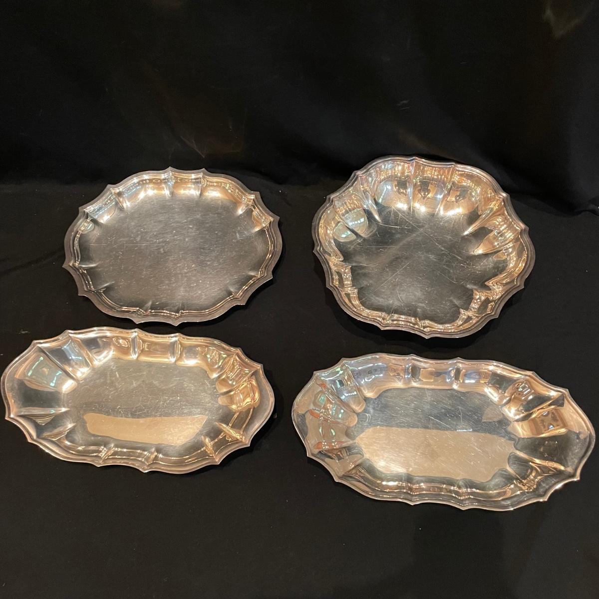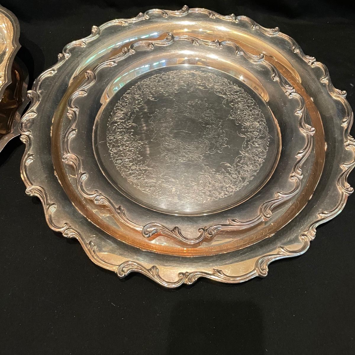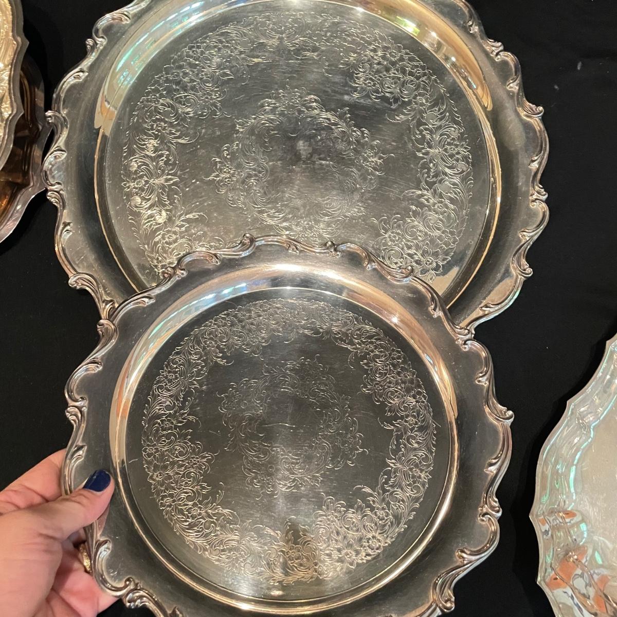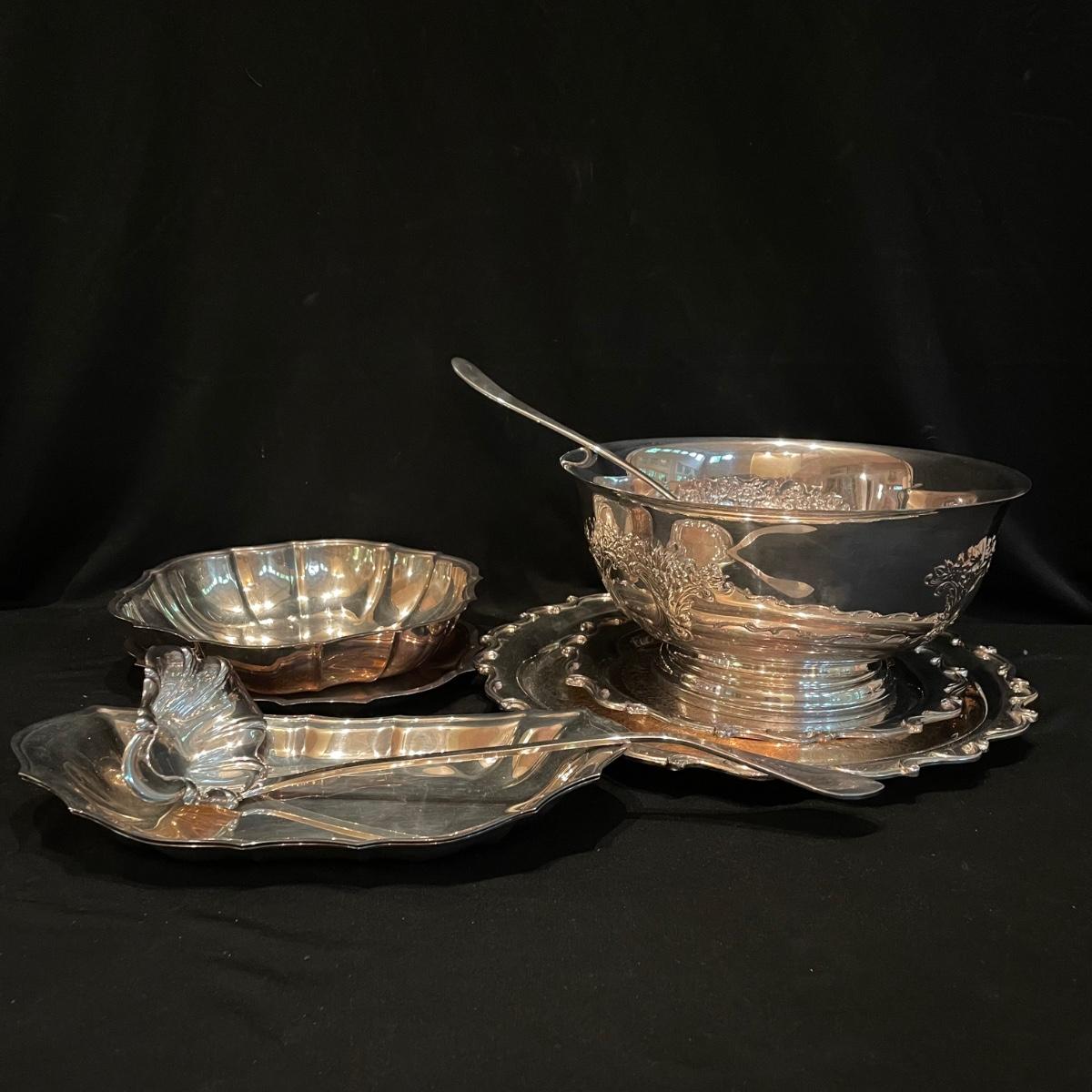 Nice silver plate style collection of party platters and more. Lot includes three Chippendale platters and a fourth matching platter marked FB Rogers. Lot includes a set of round “Joanne” platters, and two ladles for the Wallace punch bowl. The punch bowl measures 12”D x 6”H. The largest round platter has a 14” diameter. See images. Shipping available.