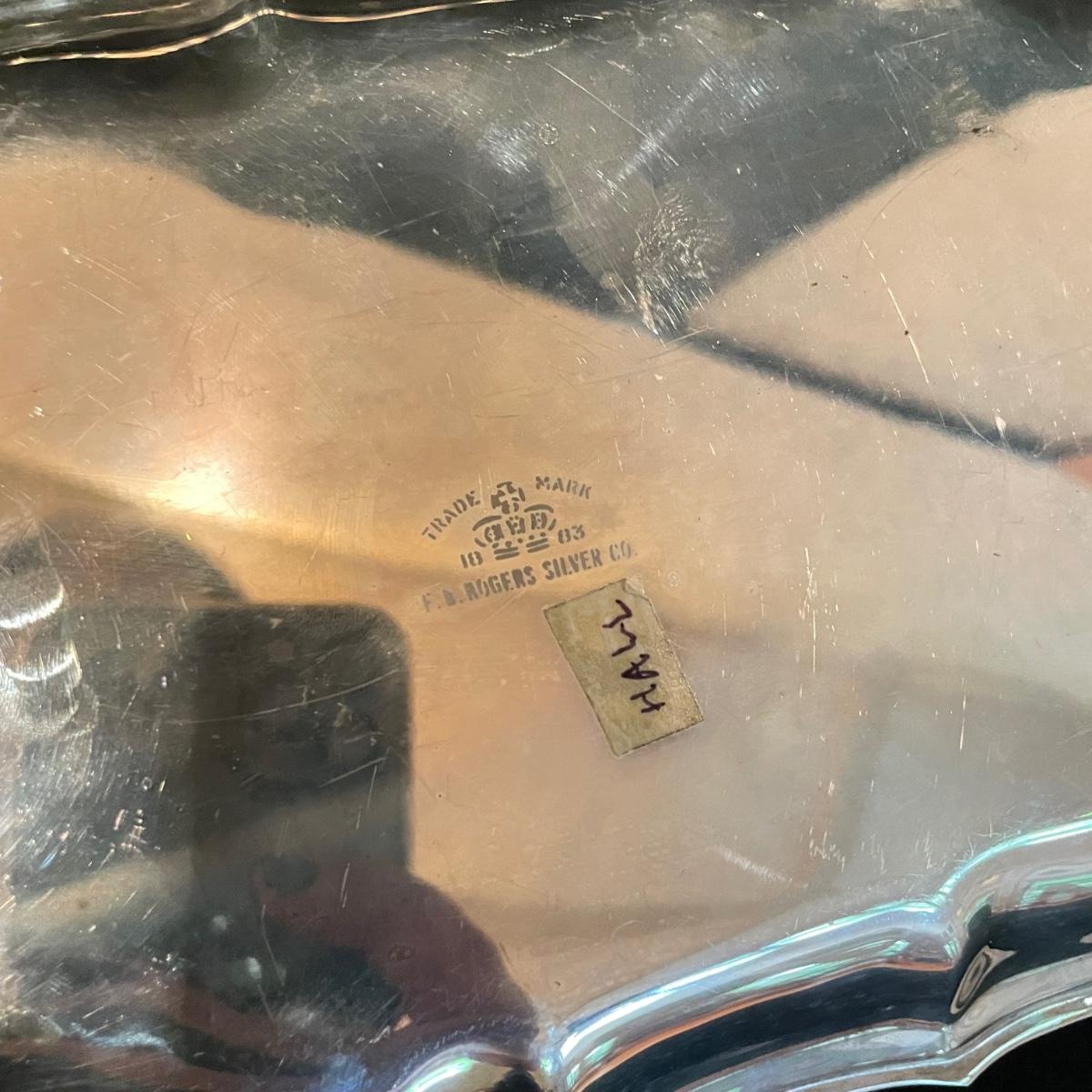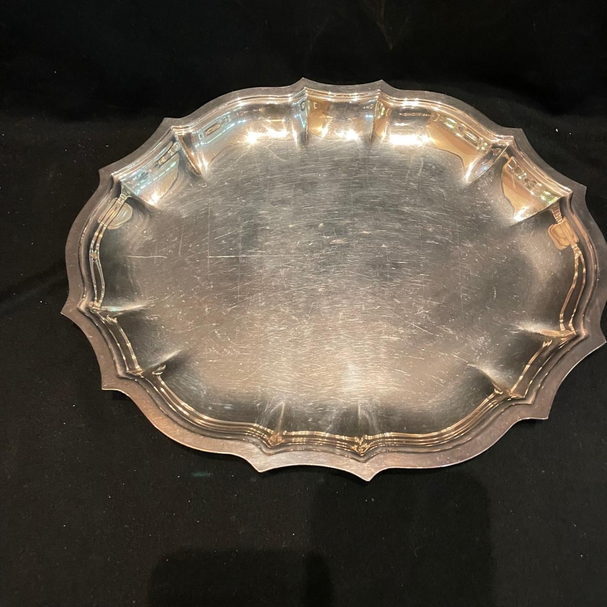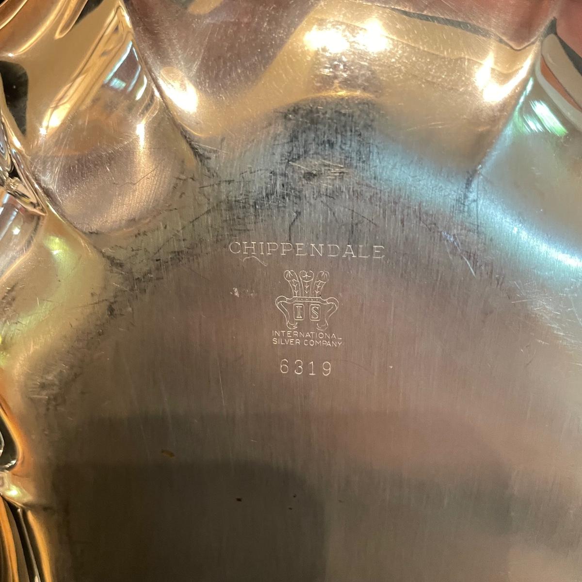 Nice silver plate style collection of party platters and more. Lot includes three Chippendale platters and a fourth matching platter marked FB Rogers. Lot includes a set of round “Joanne” platters, and two ladles for the Wallace punch bowl. The punch bowl measures 12”D x 6”H. The largest round platter has a 14” diameter. See images. Shipping available.