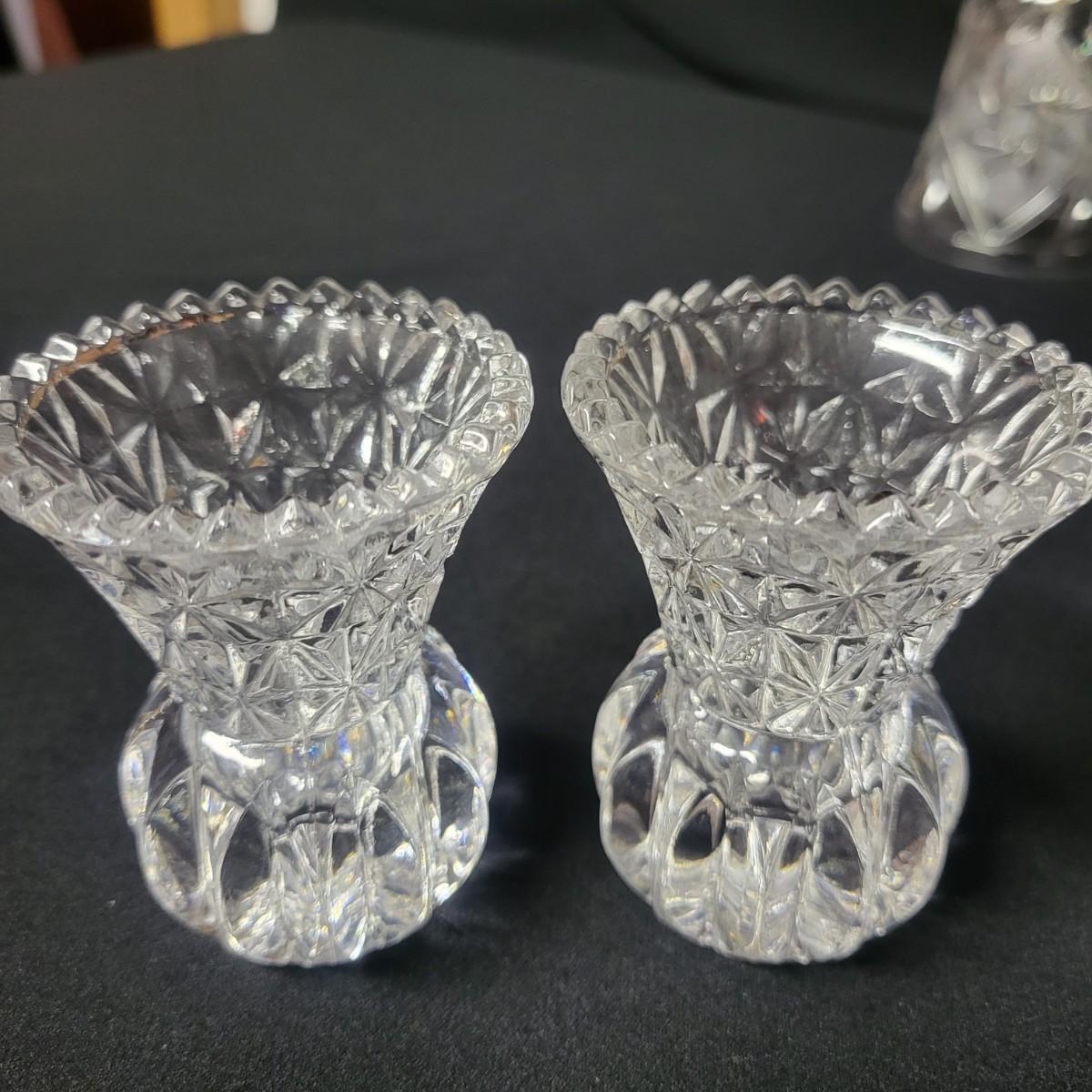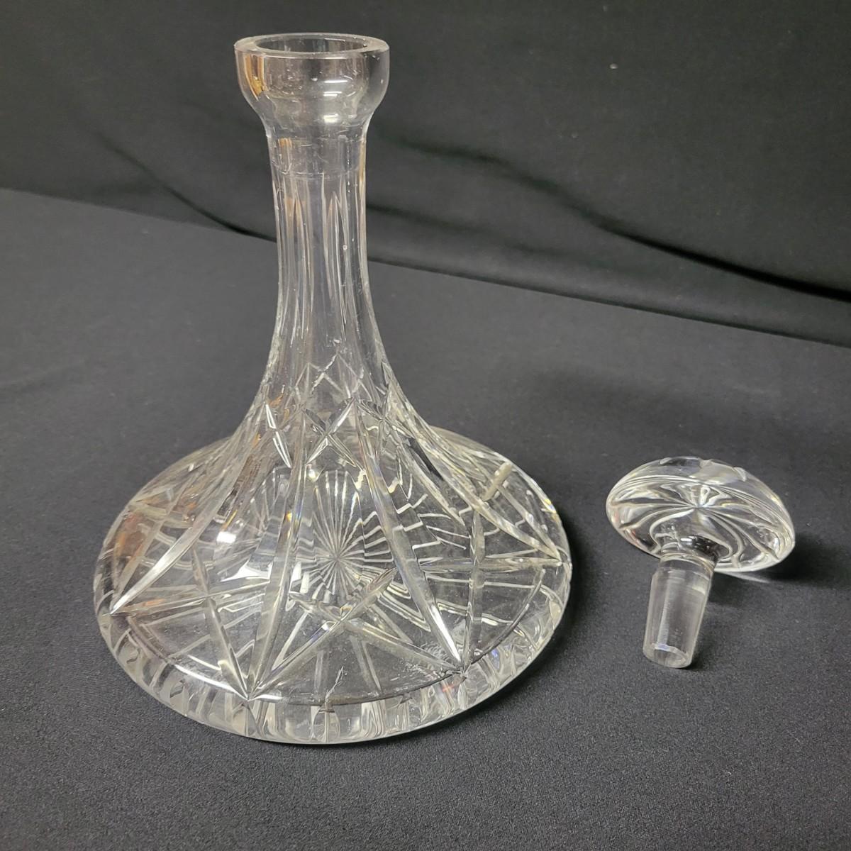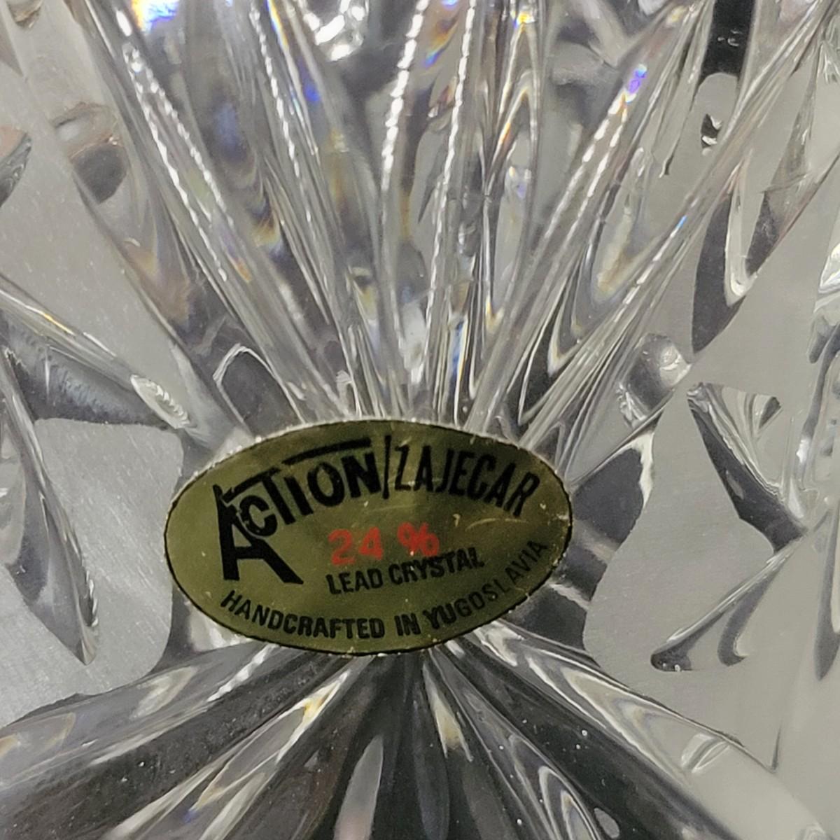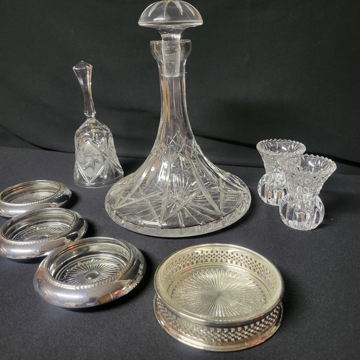 An assortment of crystal pieces and glass coasters with silver plate in good condition. Crystal decanter does have some minor scratches on. Its base. Also included is 2 candle holders, a crystal bell made by Action Zejecar and 3 coasters with metal edges. Decanter measures approximately 7" x 10" Shipping available. Shipping can be costly please call UPS store at 828-252-6930 for quote