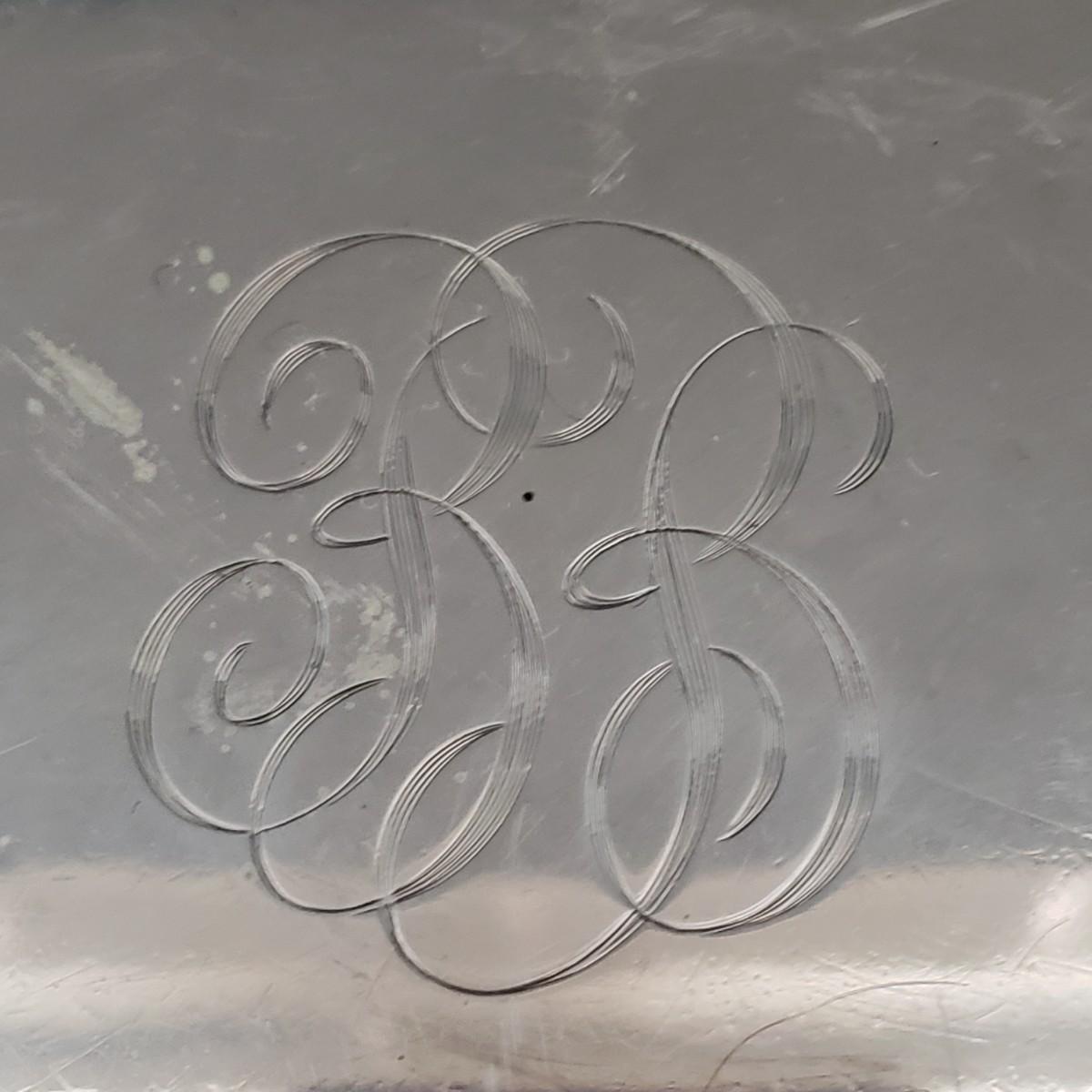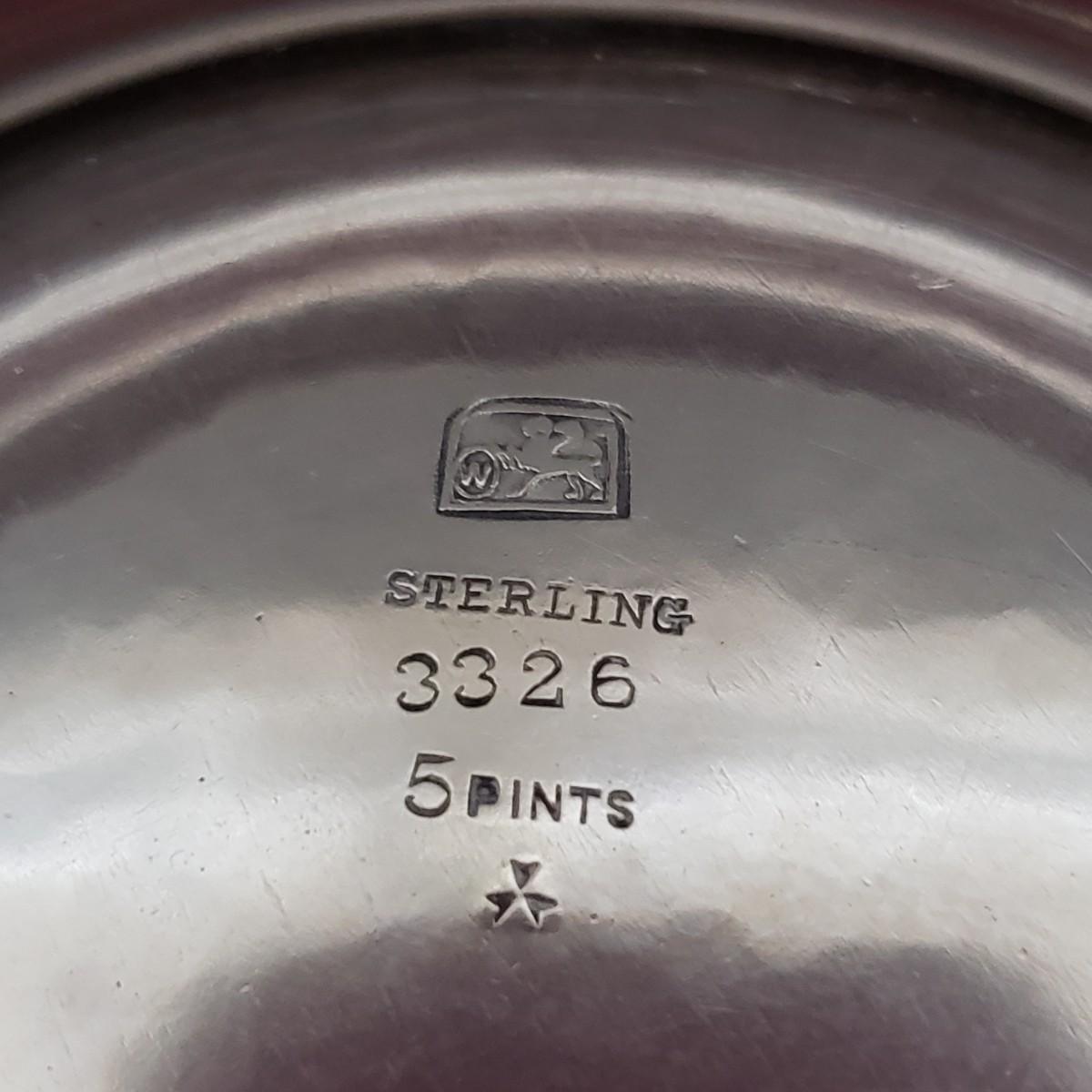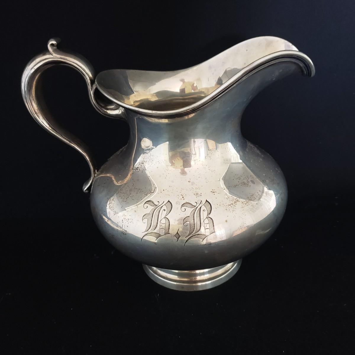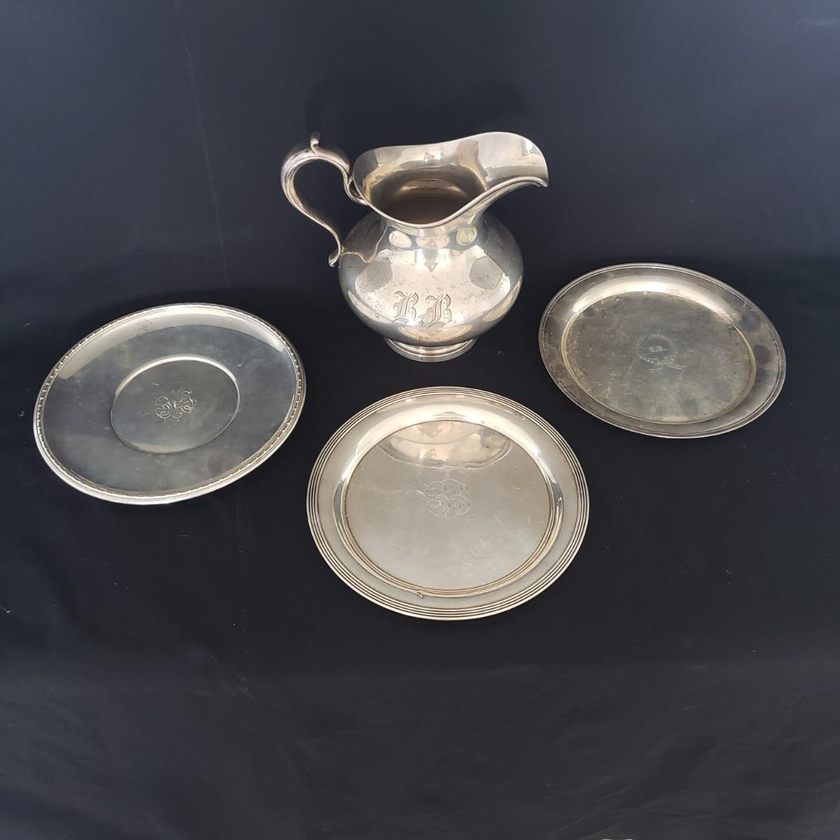 This Sterling lot has three 10" engraved plates, one of them is made by Wallace. The "BB" engraved pitcher measures 9" x 9"H.