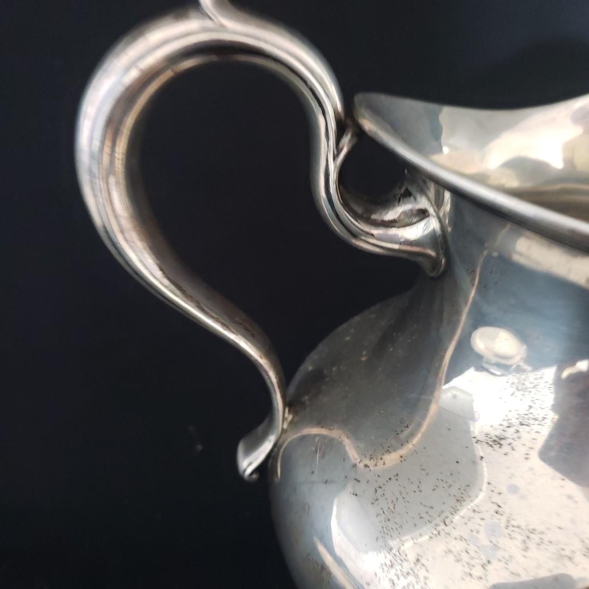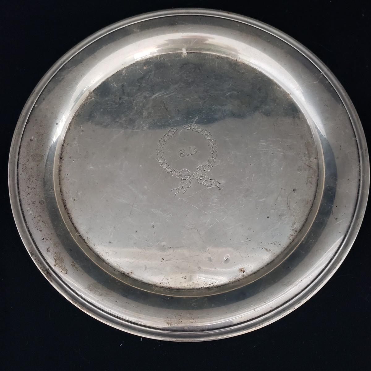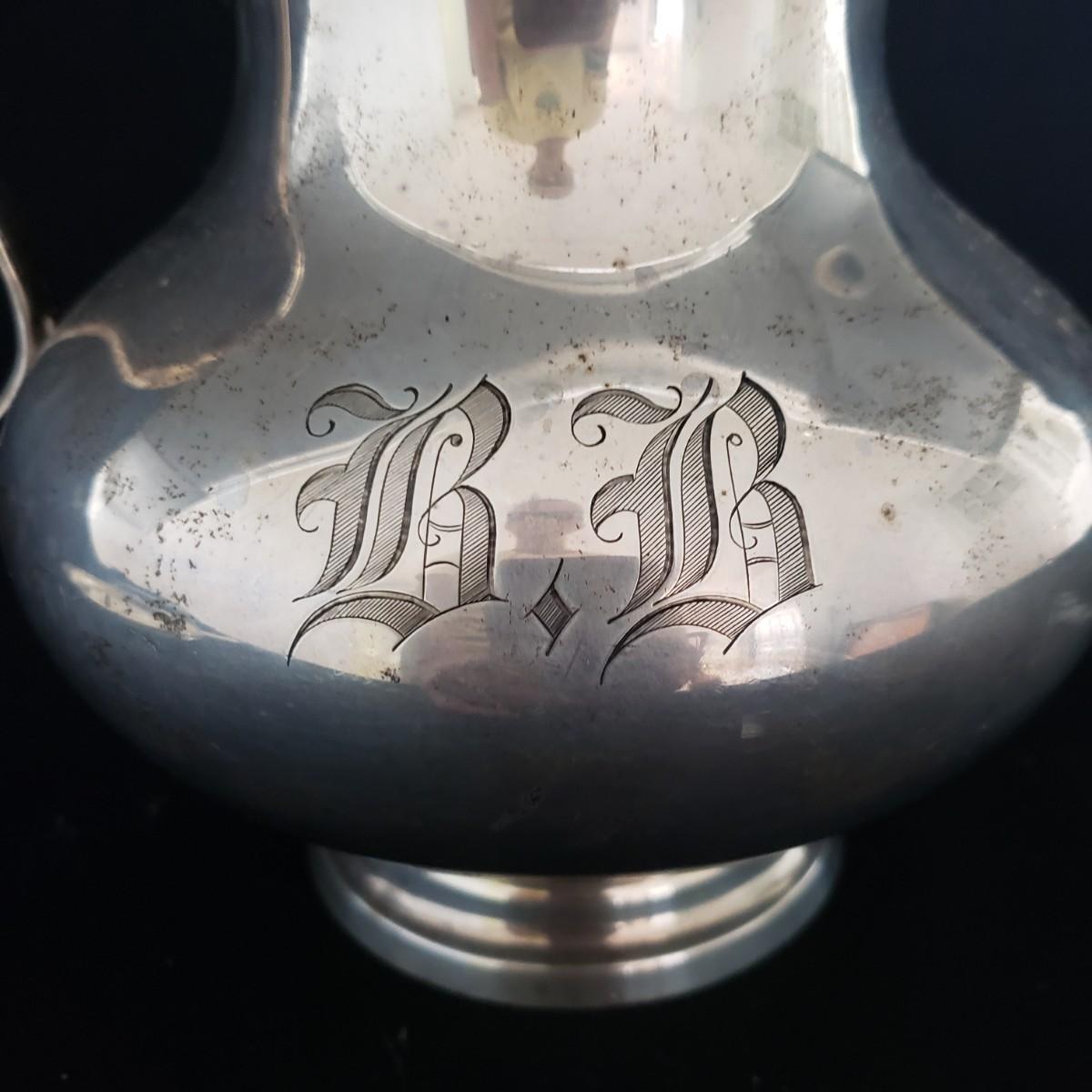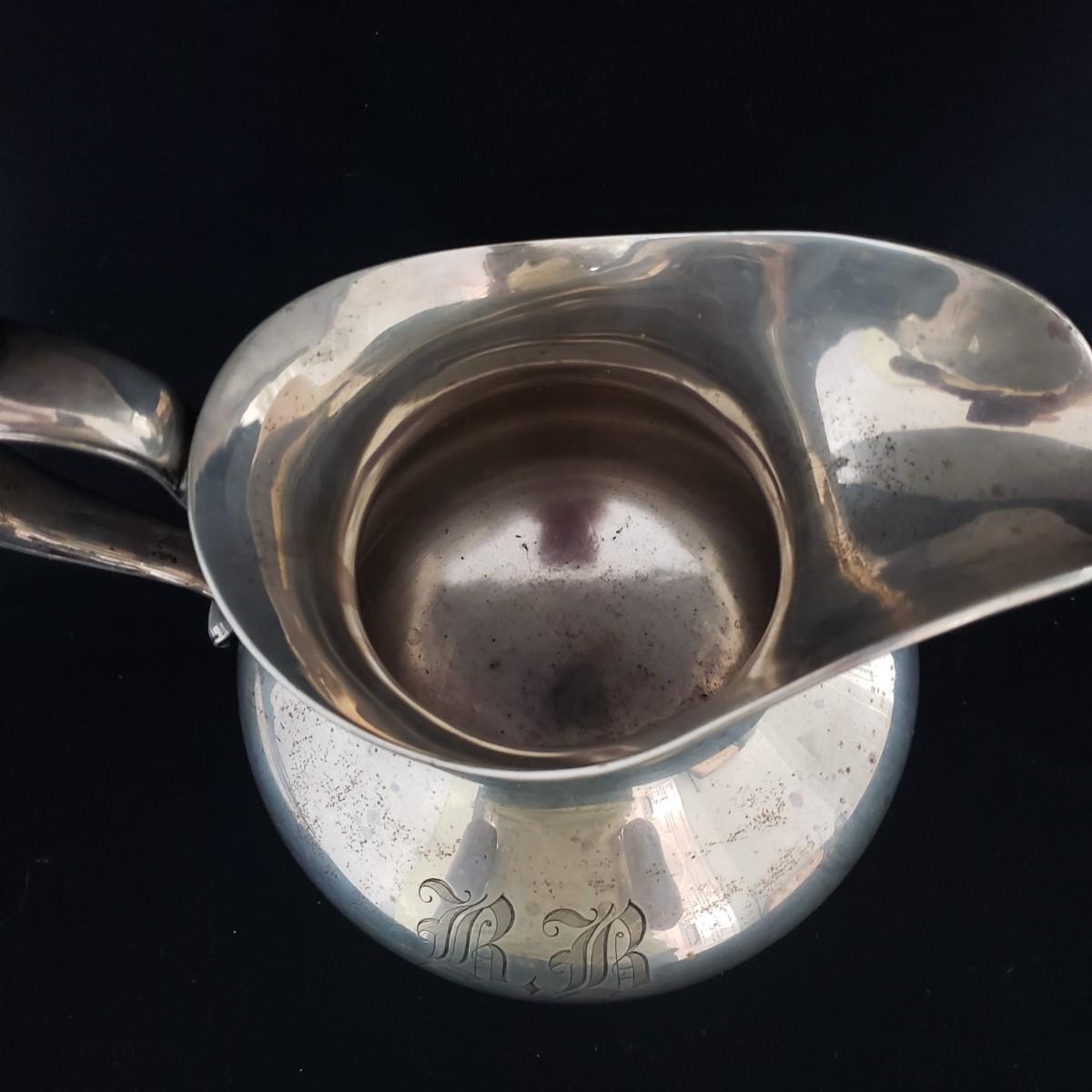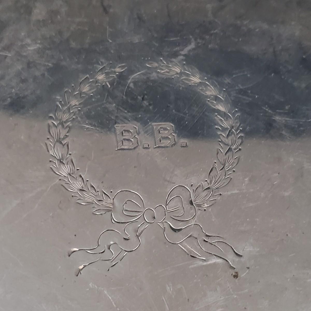 This Sterling lot has three 10" engraved plates, one of them is made by Wallace. The "BB" engraved pitcher measures 9" x 9"H.