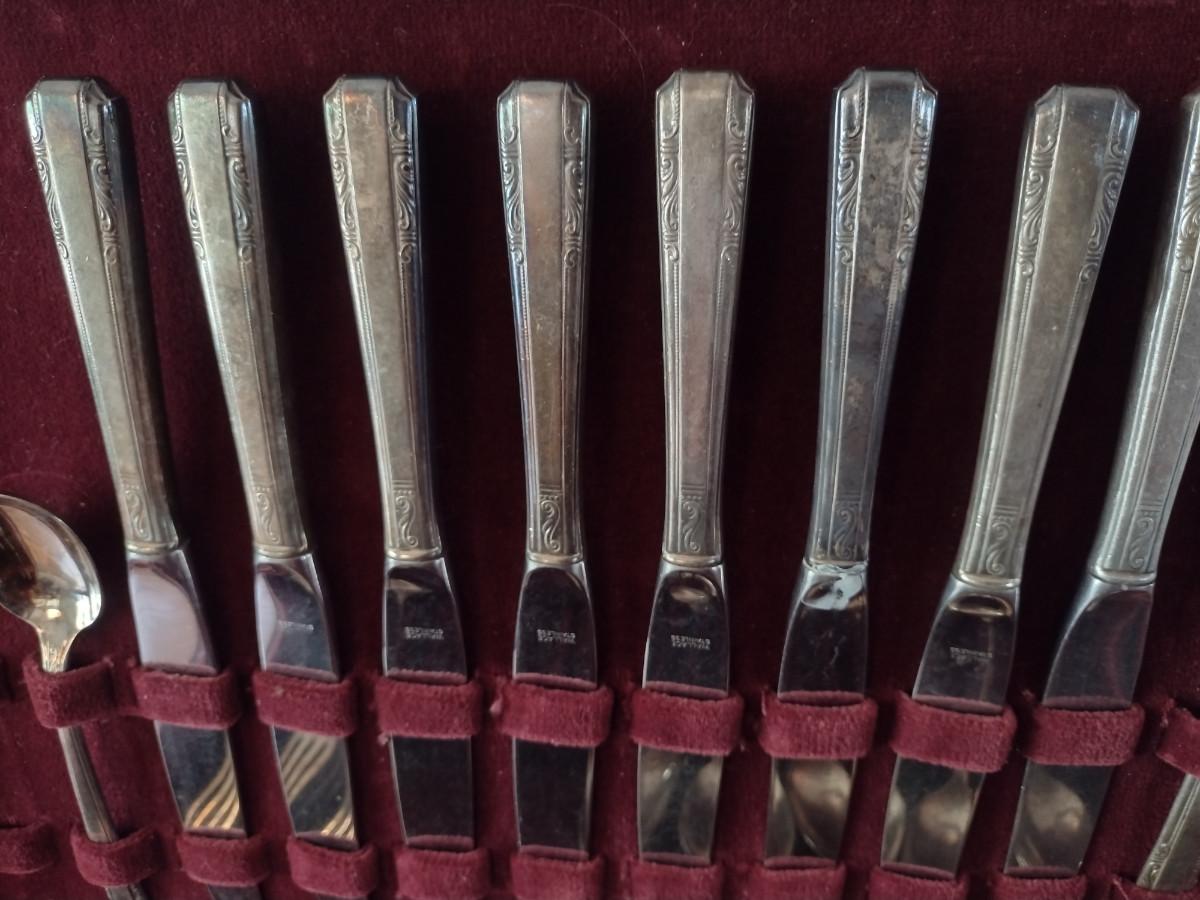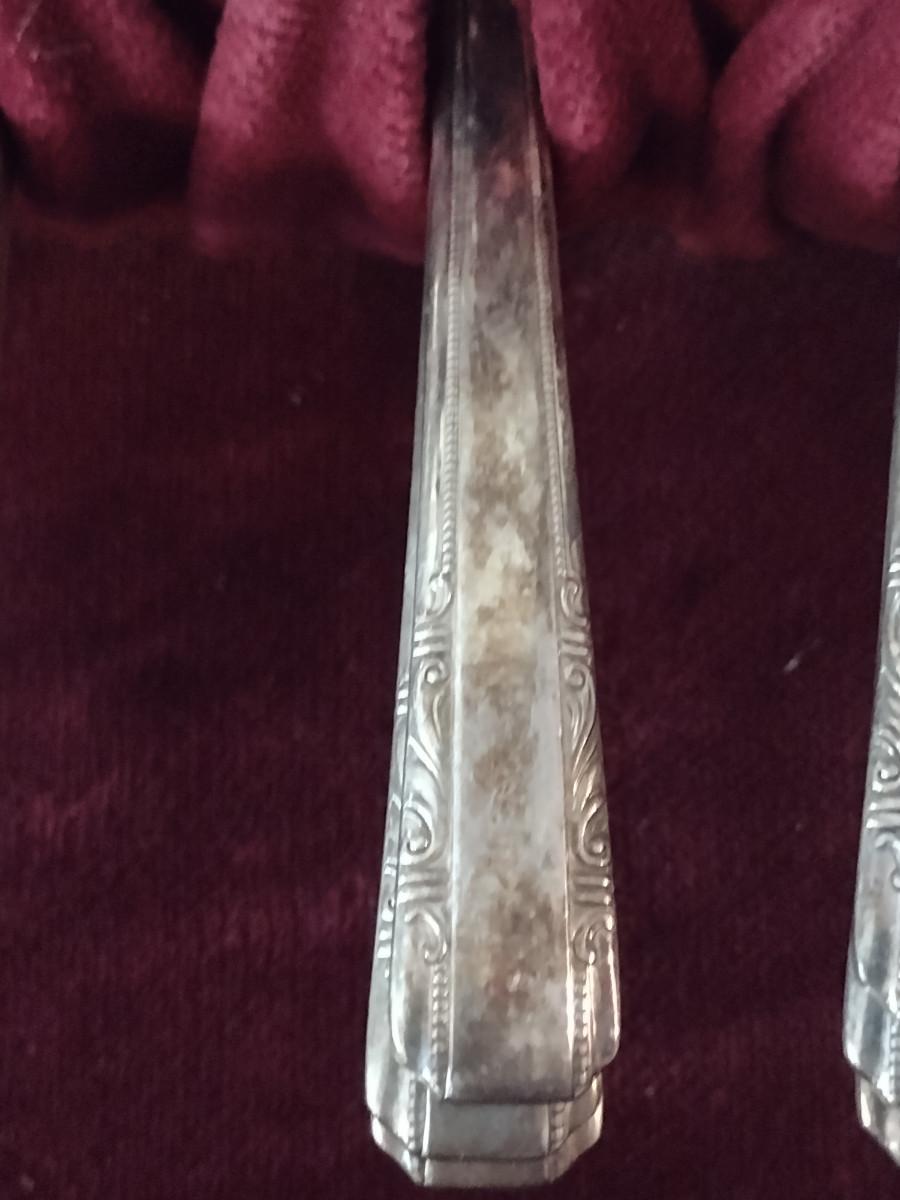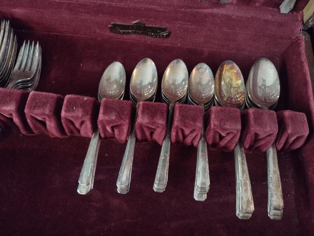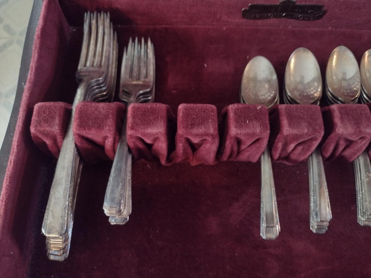 Wallace XXXX Flatware- Approx 47 Pieces- Storage Box Included. Dinner knife- 8, large spoon- 6, regular spoon- 15, salad fork- 7, dinner fork-8, sugar spoon- 1, vegetable spoon- 1, cocktail seafood fork- 1.