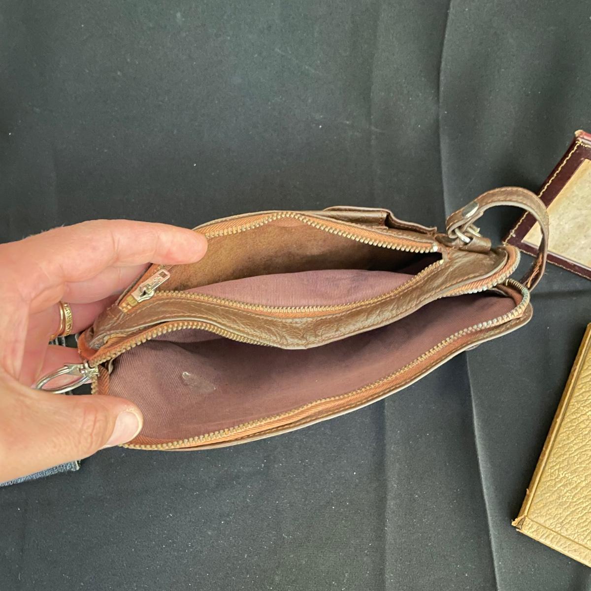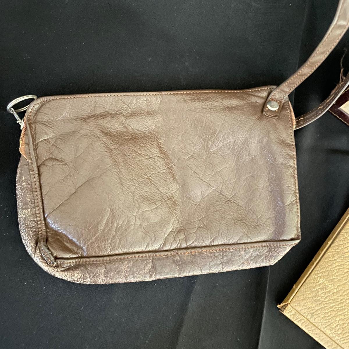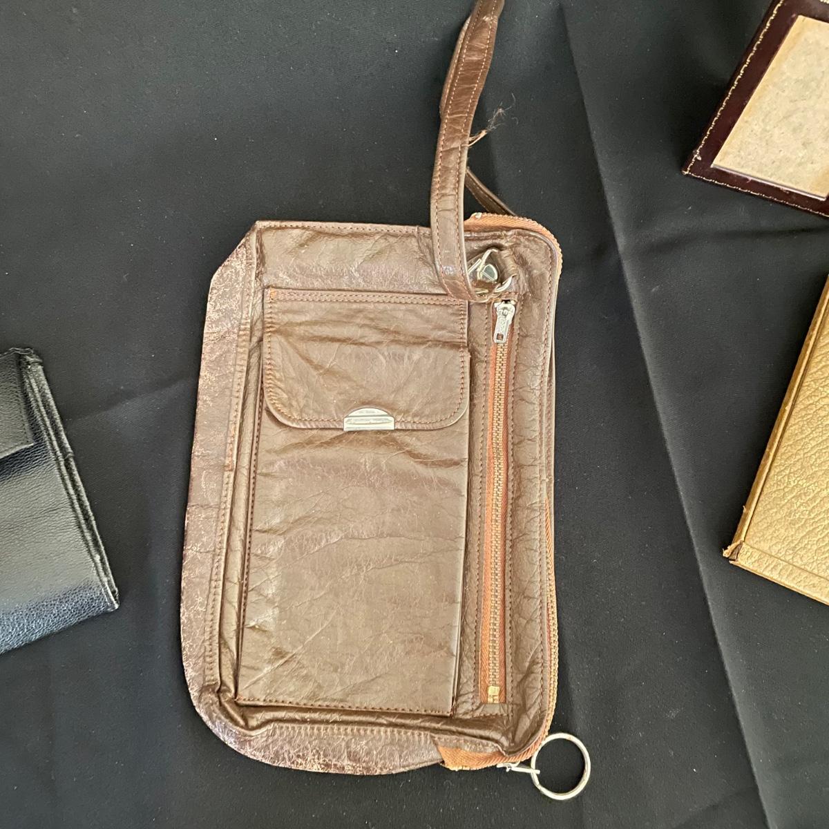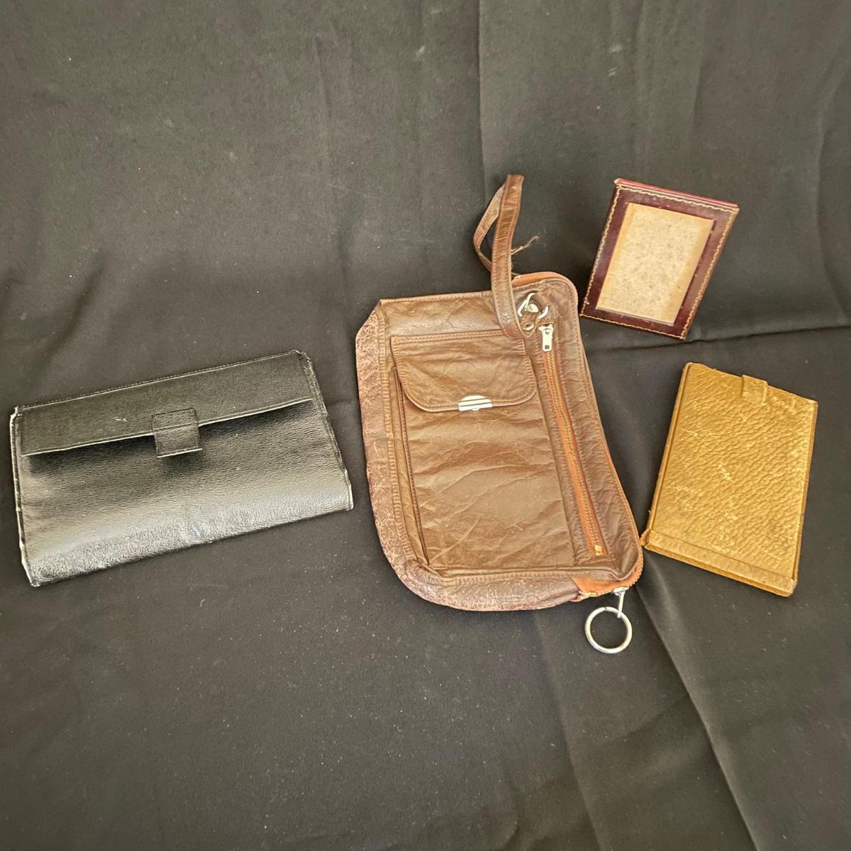 Vintage and newer leather-like items. Leather hand bag with a phone pocket has a bit of wear showing on the edges, but it has a lot of life left. There’s a “Real Morocco” wallet, a leather tabletop 2”x 3” frame and a vintage pocket compact. The compact can stand on its own and is ideal for travel! See images. Shipping available.