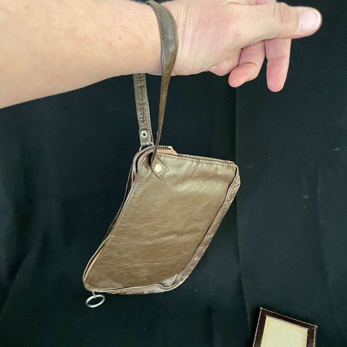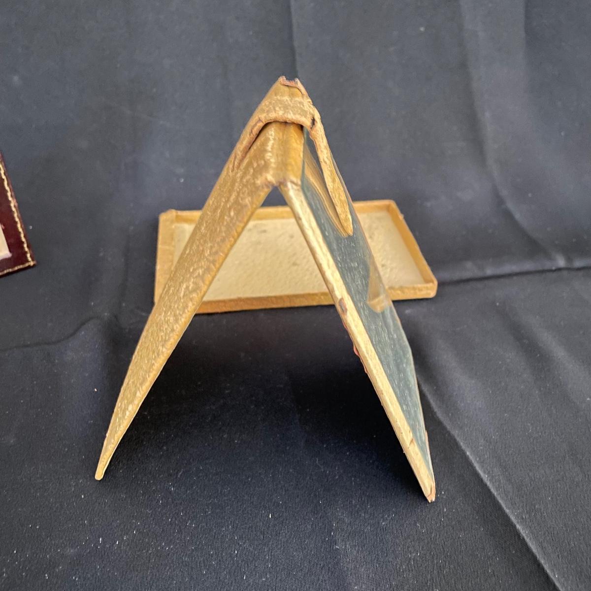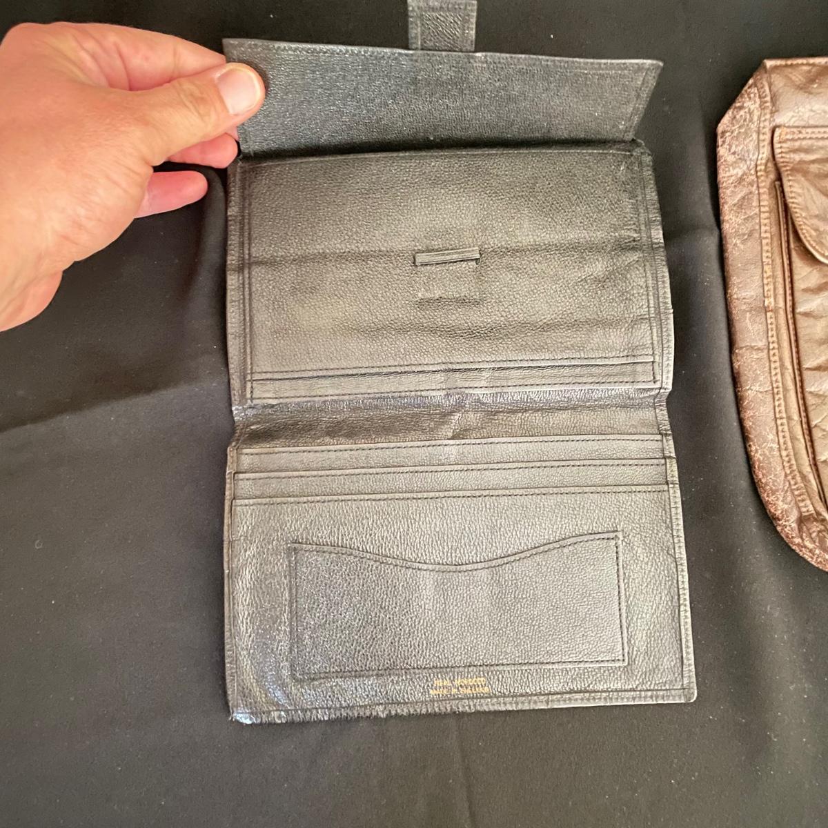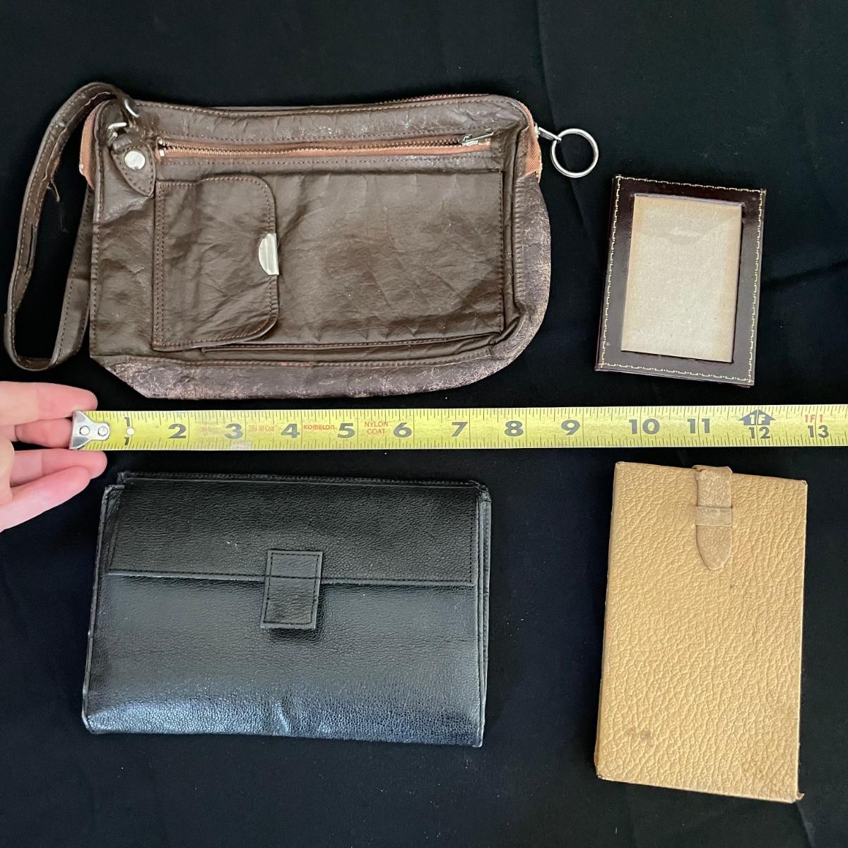 Vintage and newer leather-like items. Leather hand bag with a phone pocket has a bit of wear showing on the edges, but it has a lot of life left. There’s a “Real Morocco” wallet, a leather tabletop 2”x 3” frame and a vintage pocket compact. The compact can stand on its own and is ideal for travel! See images. Shipping available.