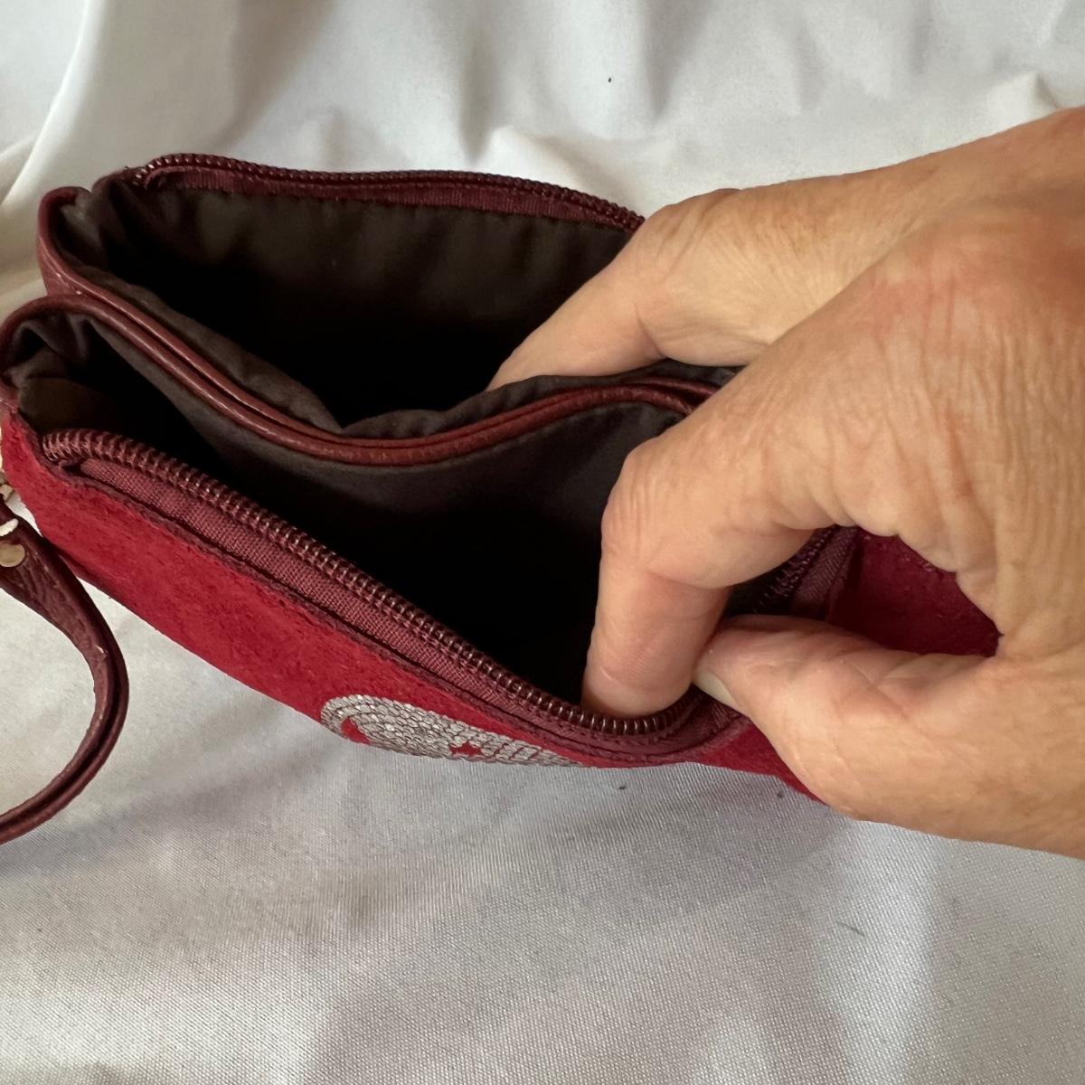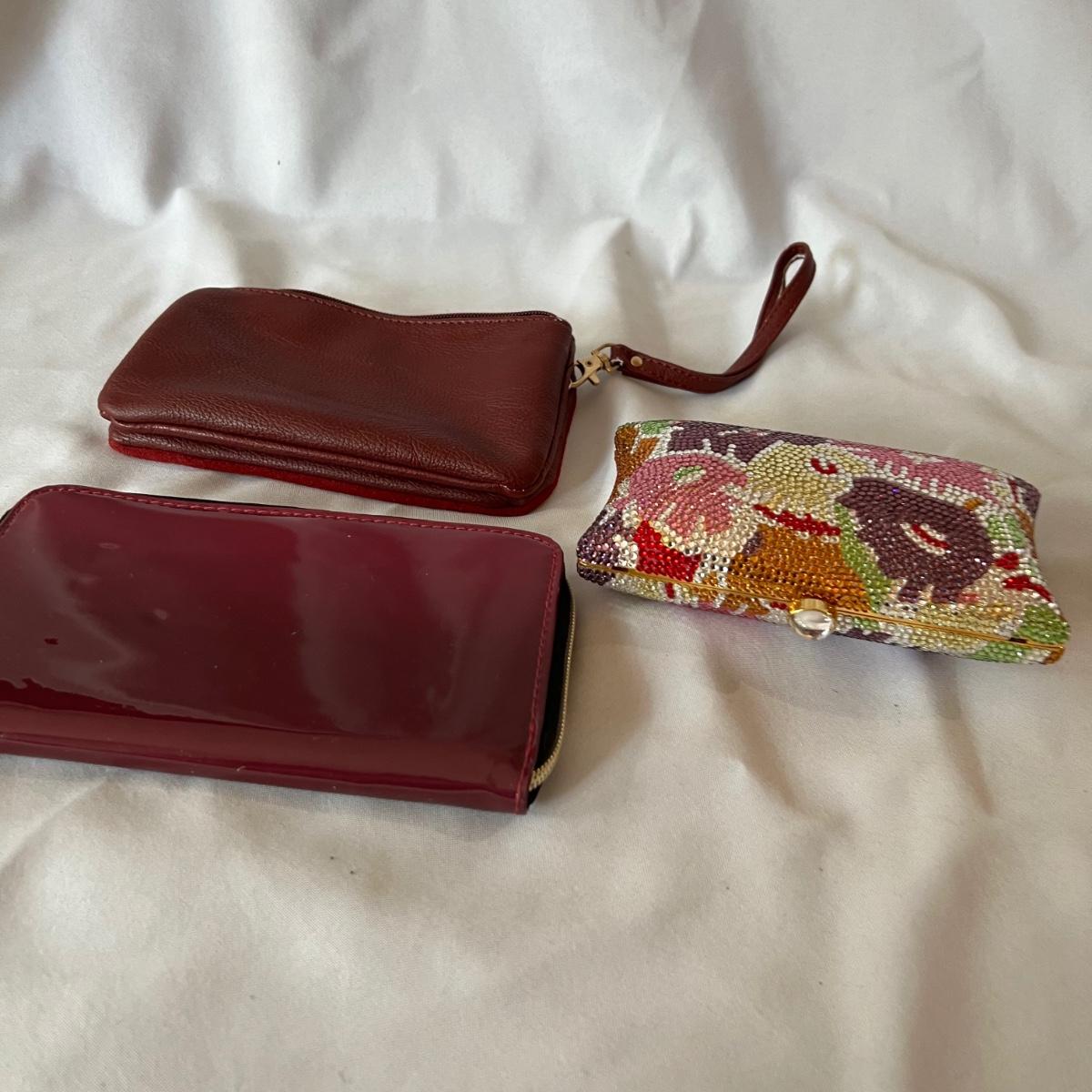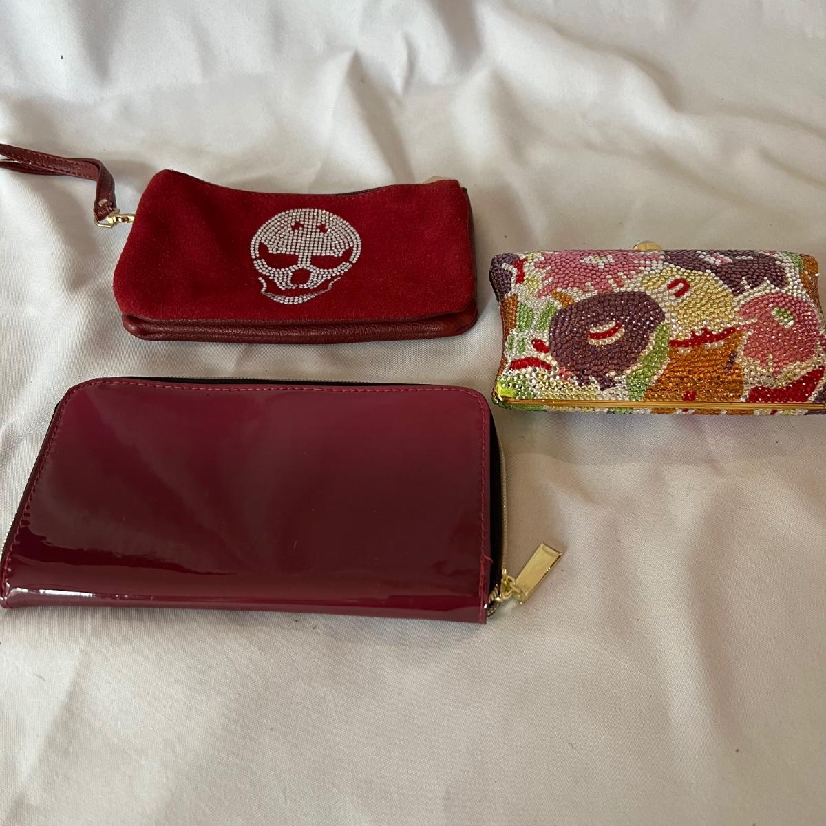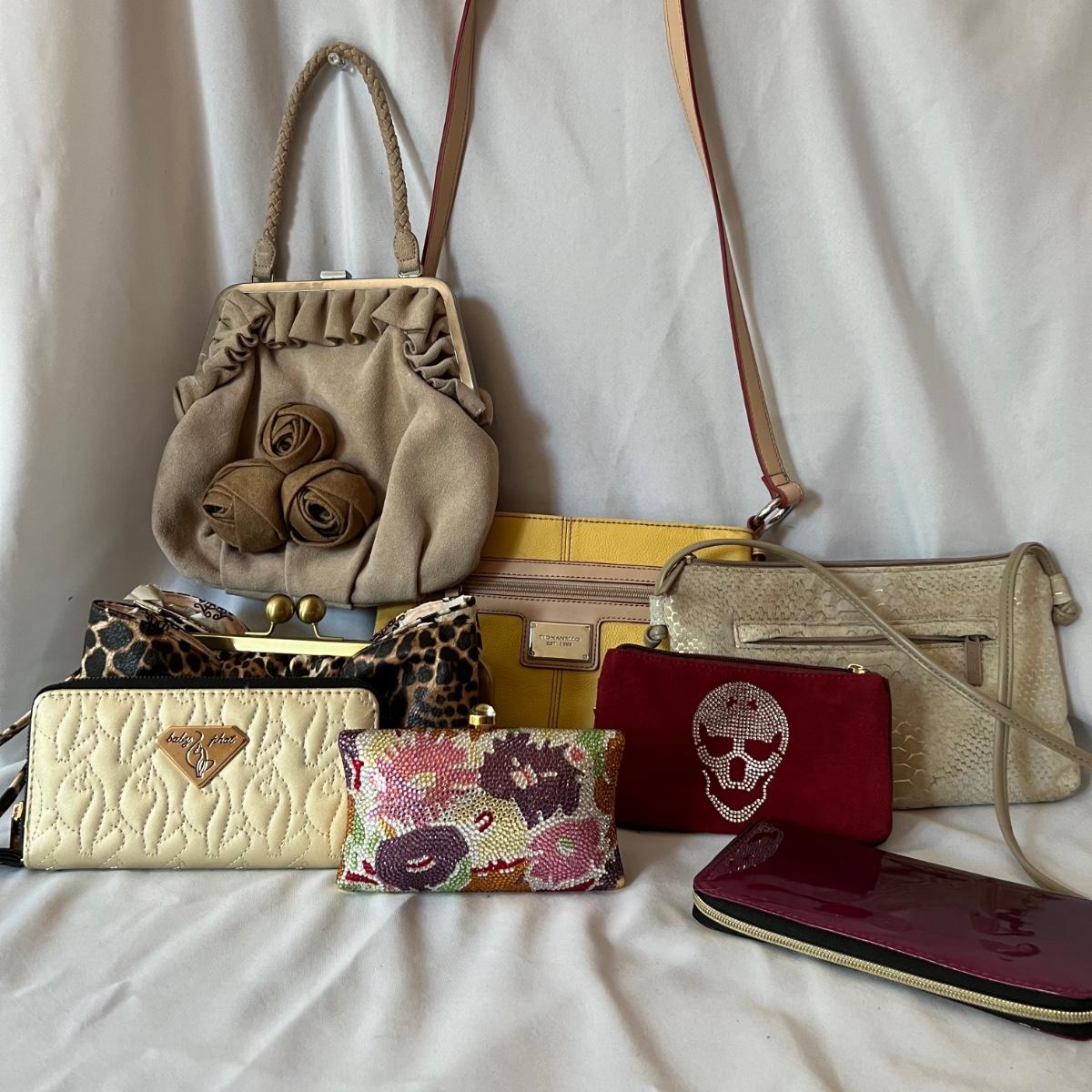Three wallets, two clutch and two purses with handles makes up this lot of seven items that are mostly faux suede or leather. See images for brand names. Note the unmarked red Wallet with faux diamond skull has a small rip in the seam on the underside and the yellow Tignanello has some light marks on the back of the purse that should come clean and the light tan purse has a small mark shown in an image which may be permanent.